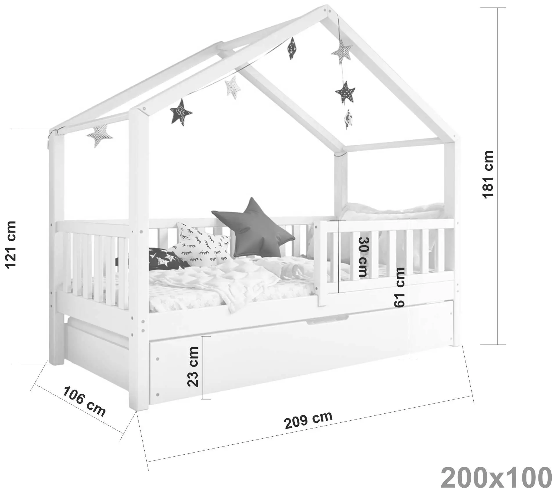 Podstawowa cena obejmuje ramę łóżeczka domek DOMI Bis z barierkami, szufladą na pościel oraz stelażem z listew sprężynujących. W paczkach znajdą Państwo instrukcję oraz niezbędne elementy montażowe.