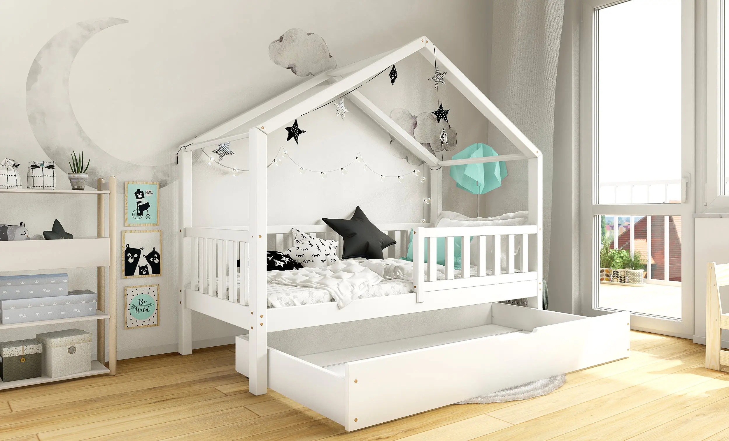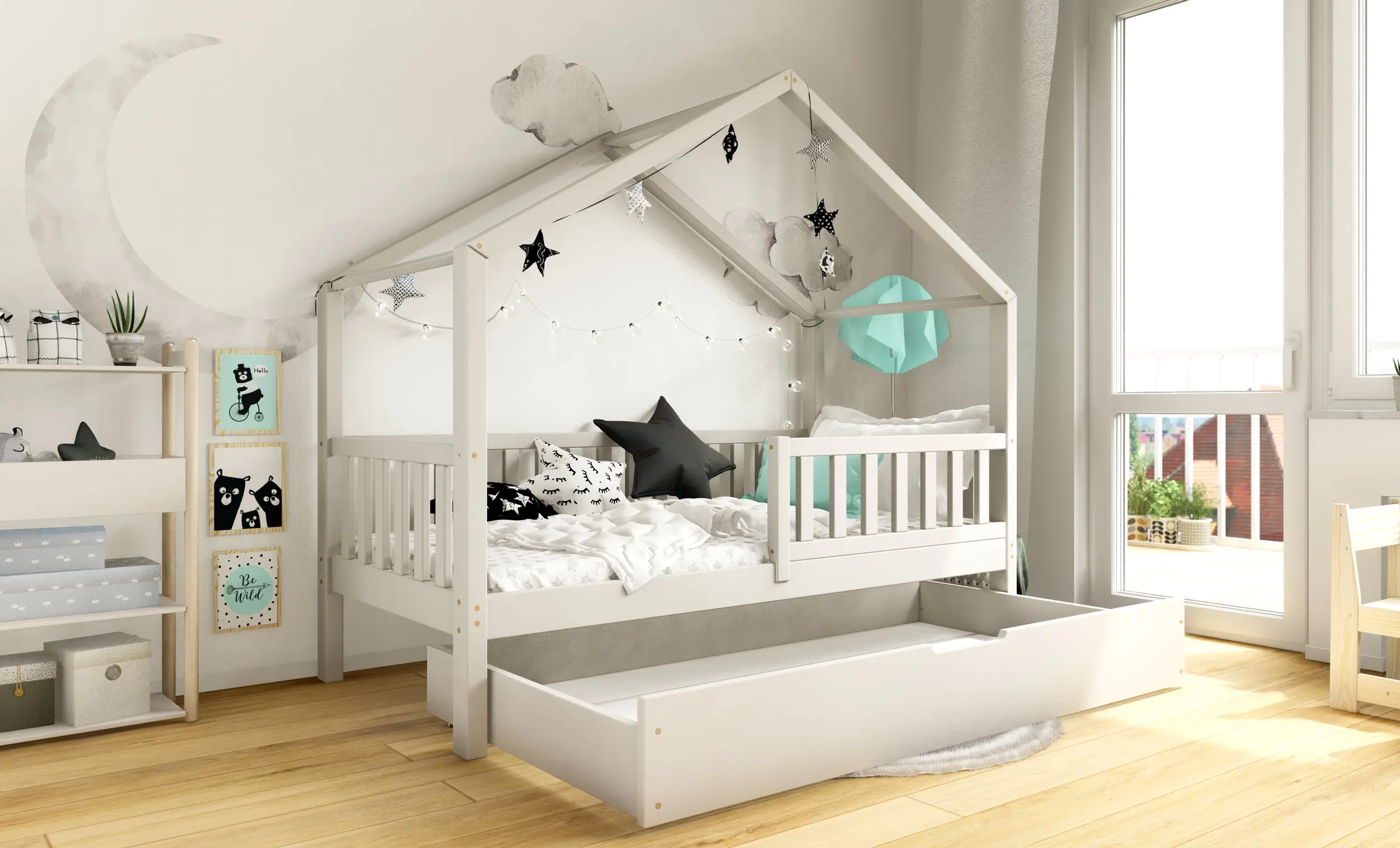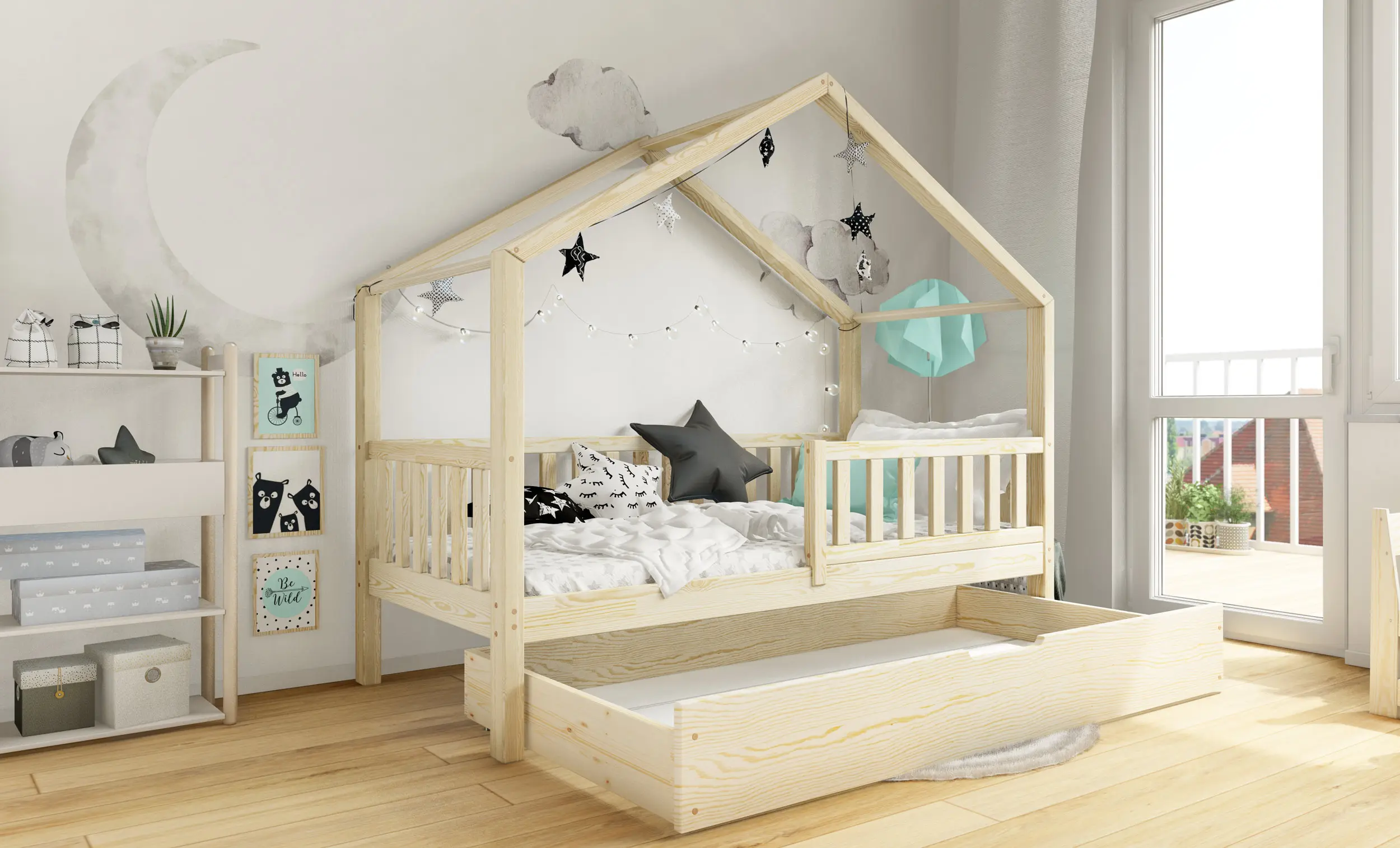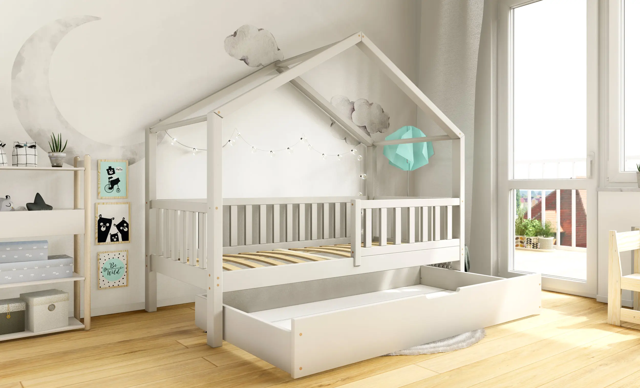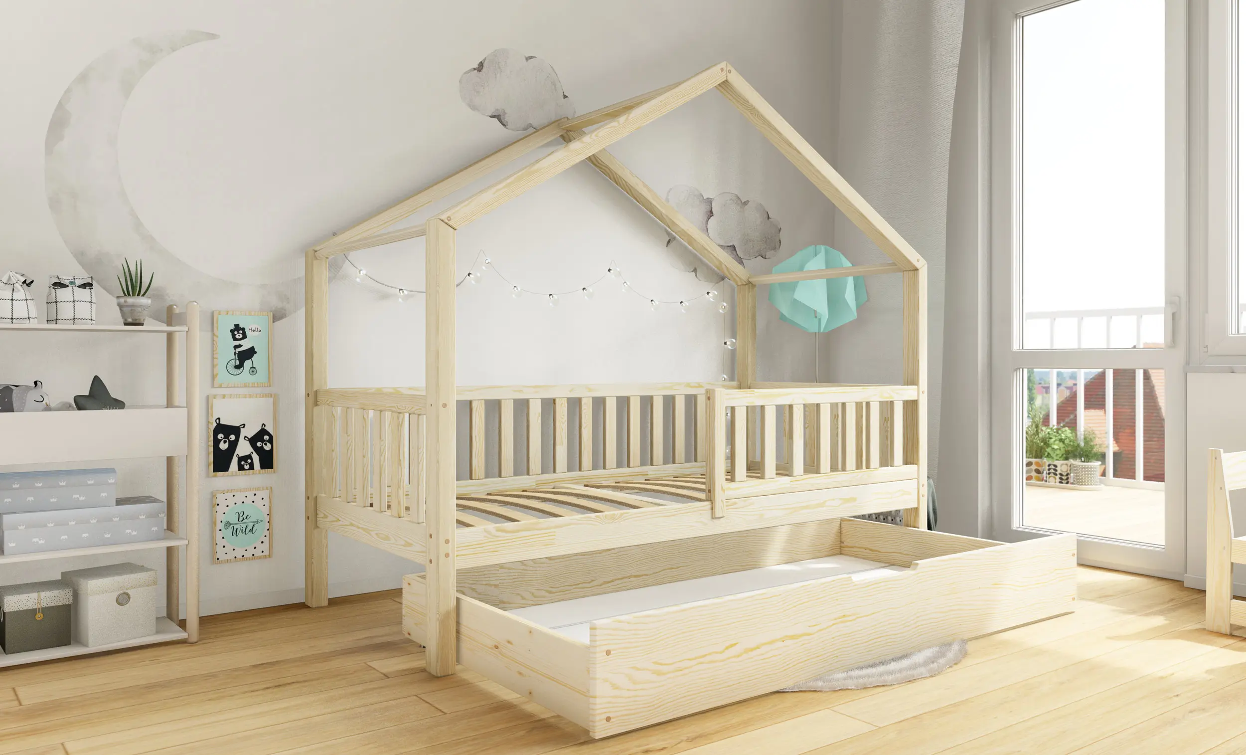 Solidne łóżeczko dziecięce DOMI BIS zapewnia stabilne i wytrzymale miejsce do snu nawet dla największego rozrabiaki. Od teraz nie musisz się martwić o wytrzymałość i jakość wykonania podłoża do snu twojego dziecka. Naturalne materiały, ekologiczne farby i ręcznie szlifowane boki o zaokrąglonych brzegach zadbają o bezpieczeństwo podczas zabawy czy w trakcie nocnego odpoczynku każdego szkraba. Dodatkowo model jest wyposażony w szufladę na pościel. Łóżko w kształcie domku inspiruje dzieci do wyobraźni i rozwijania kreatywności. Dzieci mogą z łatwością przystosować przestrzeń łóżka do swoich własnych gier i zabaw, co pobudza ich rozwój emocjonalny i umysłowy.