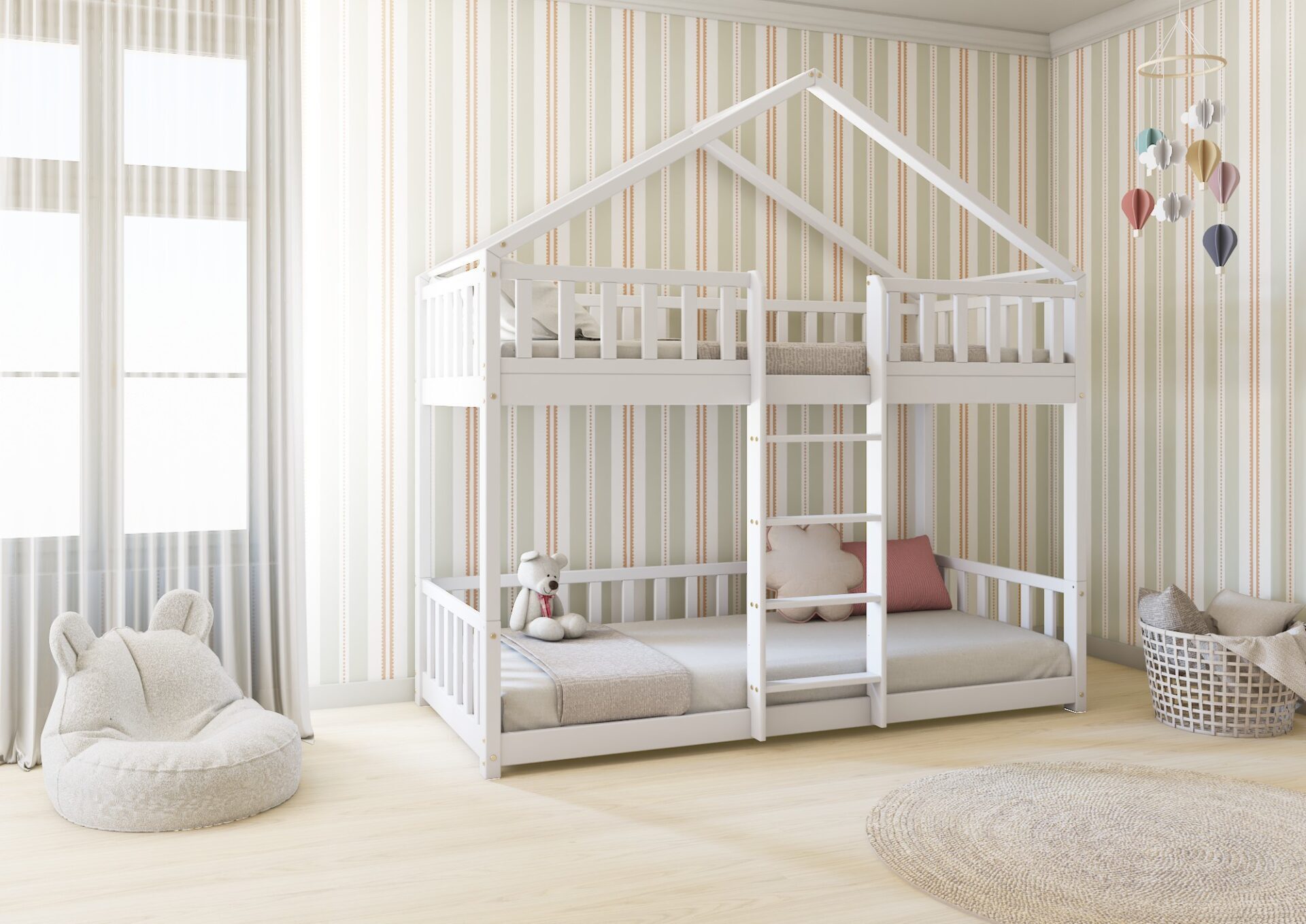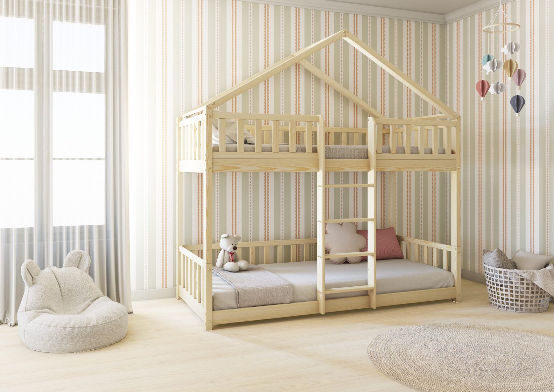 DORMIO PIĘTROWE – drewniane łóżko domek z barierkami w kształcie płotka