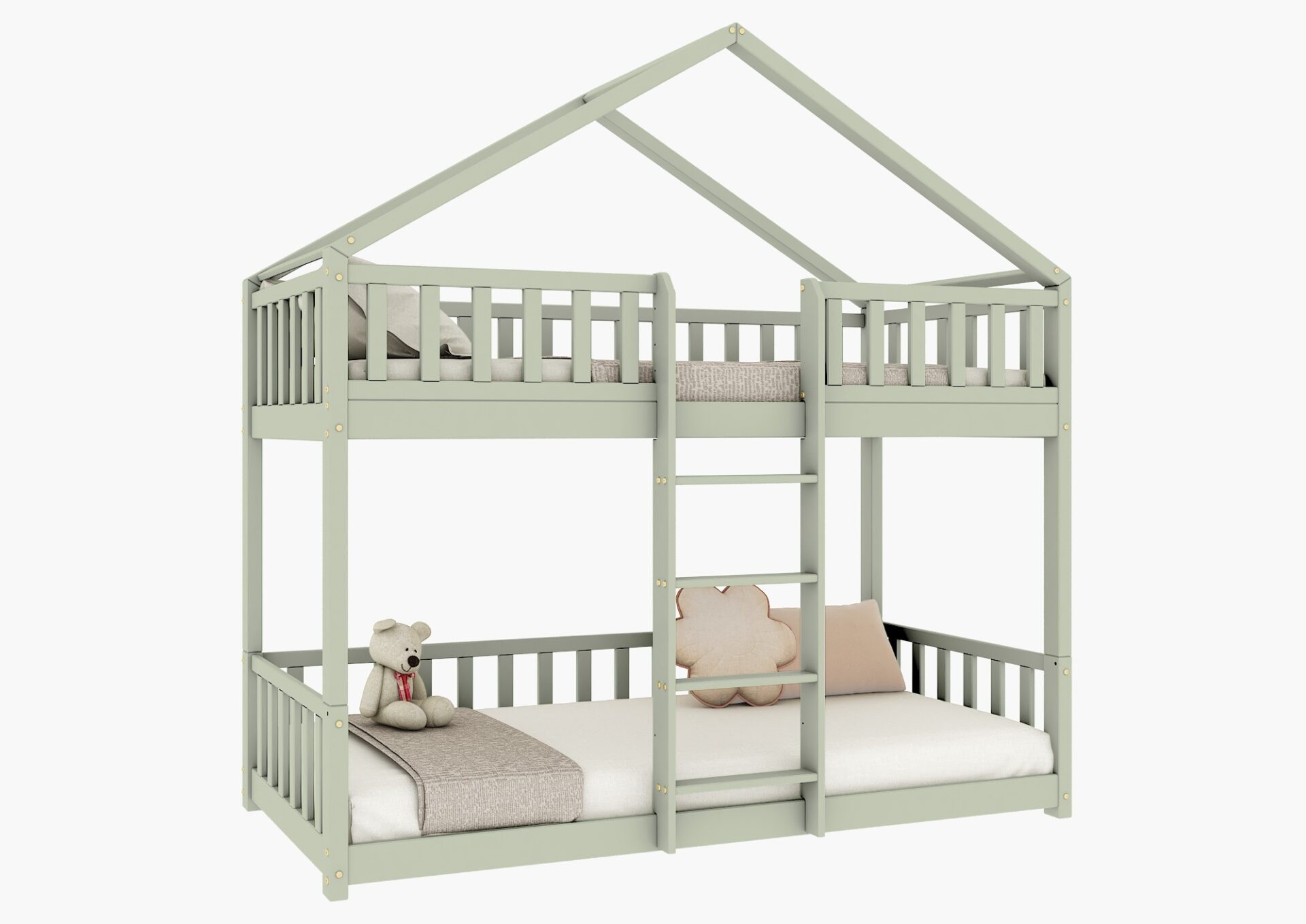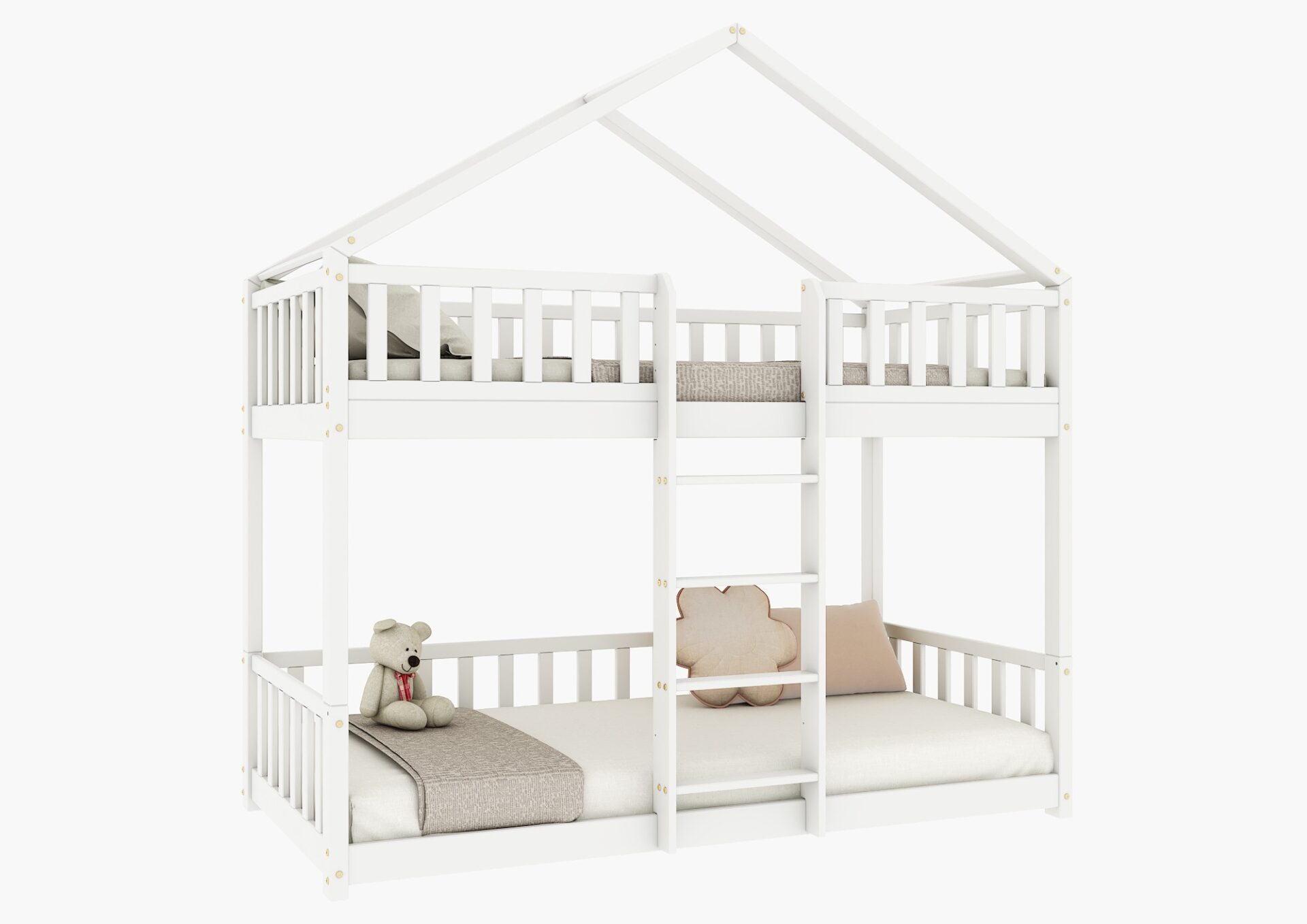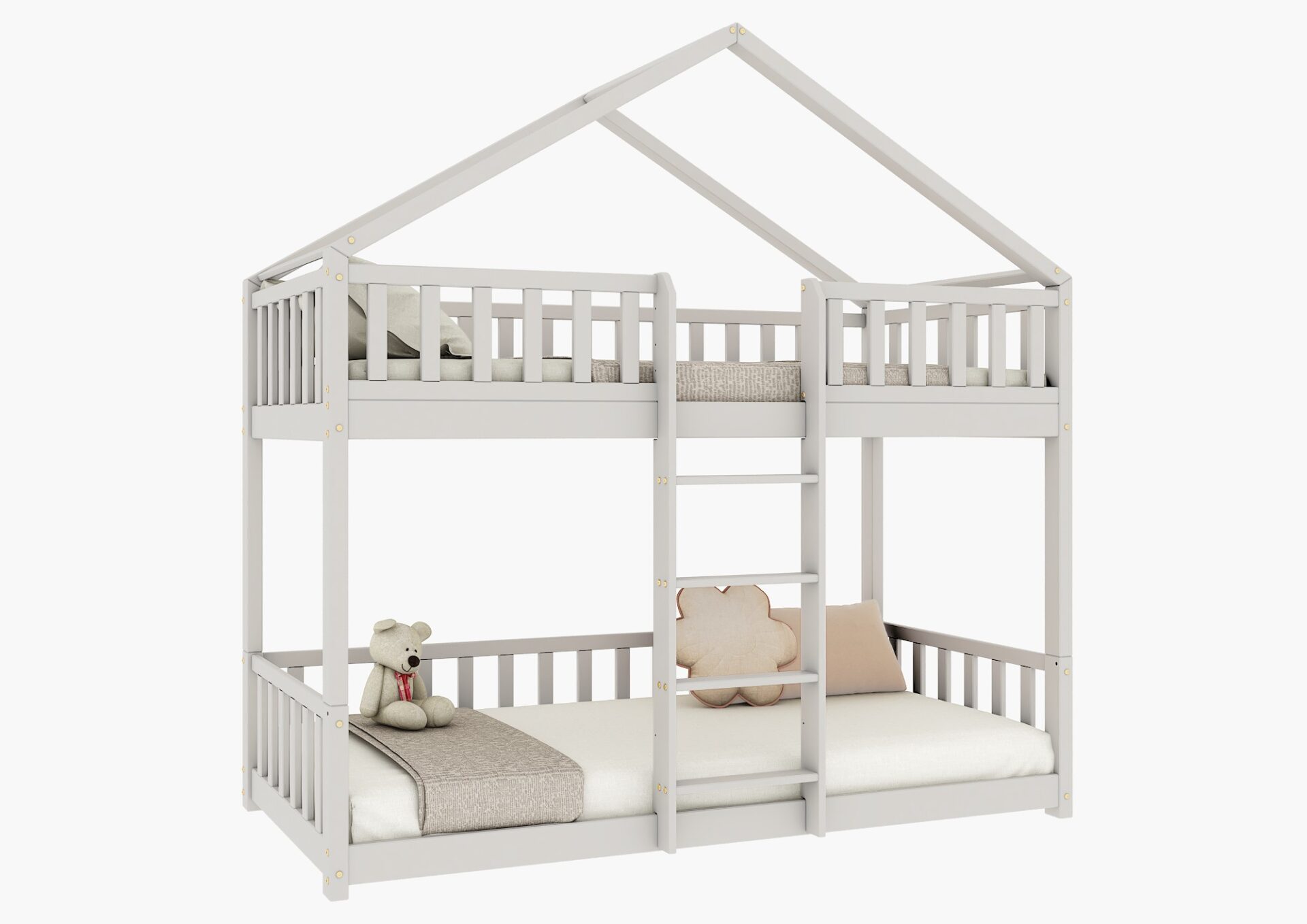 DOMI PIĘTROWE drewniane łóżko piętrowe z barierkami płotek na niskich nogach