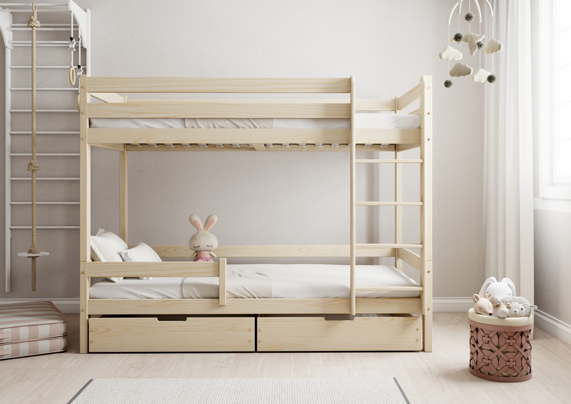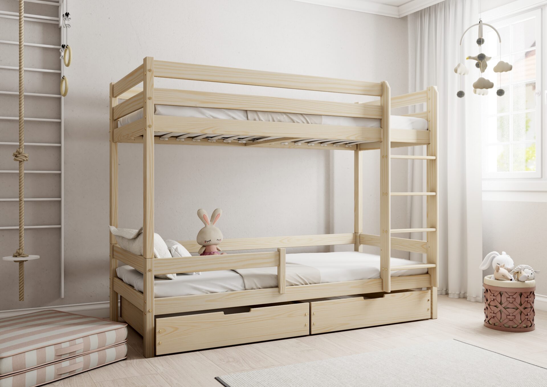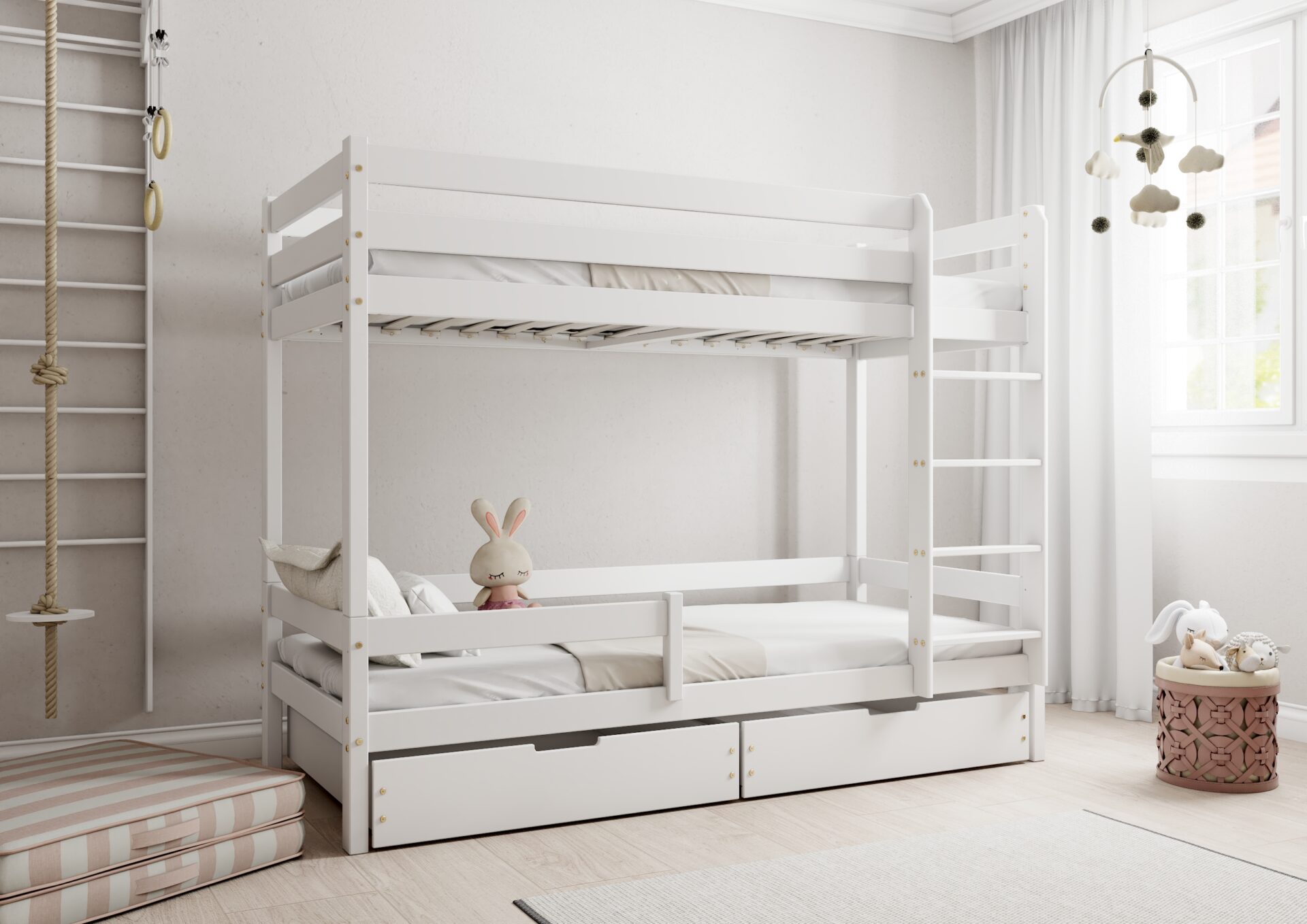 Bezpieczeństwo dzieci podczas snu i zabawy jest priorytetem w konstrukcji łóżka EDDIE BIS. Wyposażone w mocne barierki ochronne w formie poziomych desek, zapewniają one ochronę przed przypadkowym wypadnięciem. Dostęp do górnego łóżka jest łatwy i bezpieczny dzięki stabilnej i ergonomicznej drabinie.