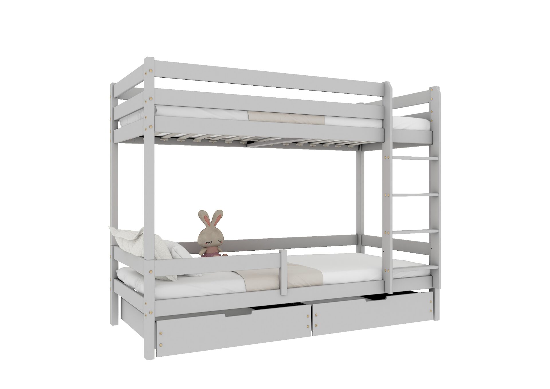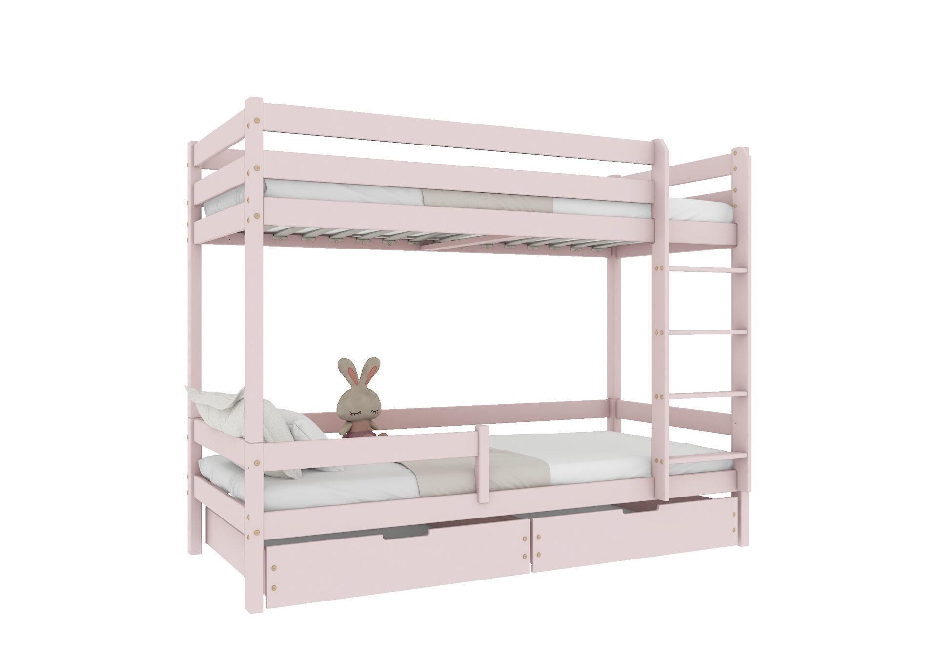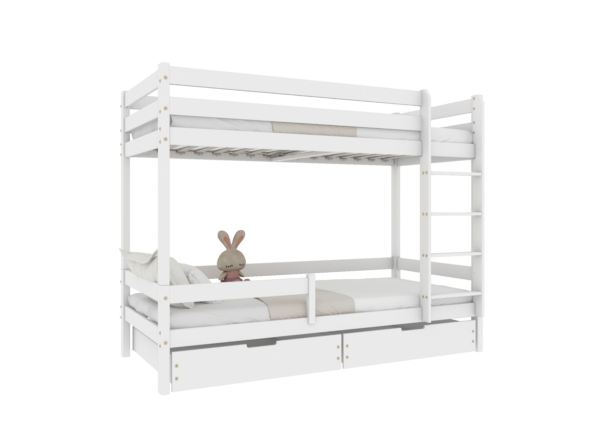 Bezpieczeństwo dzieci podczas snu i zabawy jest priorytetem w konstrukcji łóżka EDDIE BIS. Wyposażone w mocne barierki ochronne w formie poziomych desek, zapewniają one ochronę przed przypadkowym wypadnięciem. Dostęp do górnego łóżka jest łatwy i bezpieczny dzięki stabilnej i ergonomicznej drabinie.
