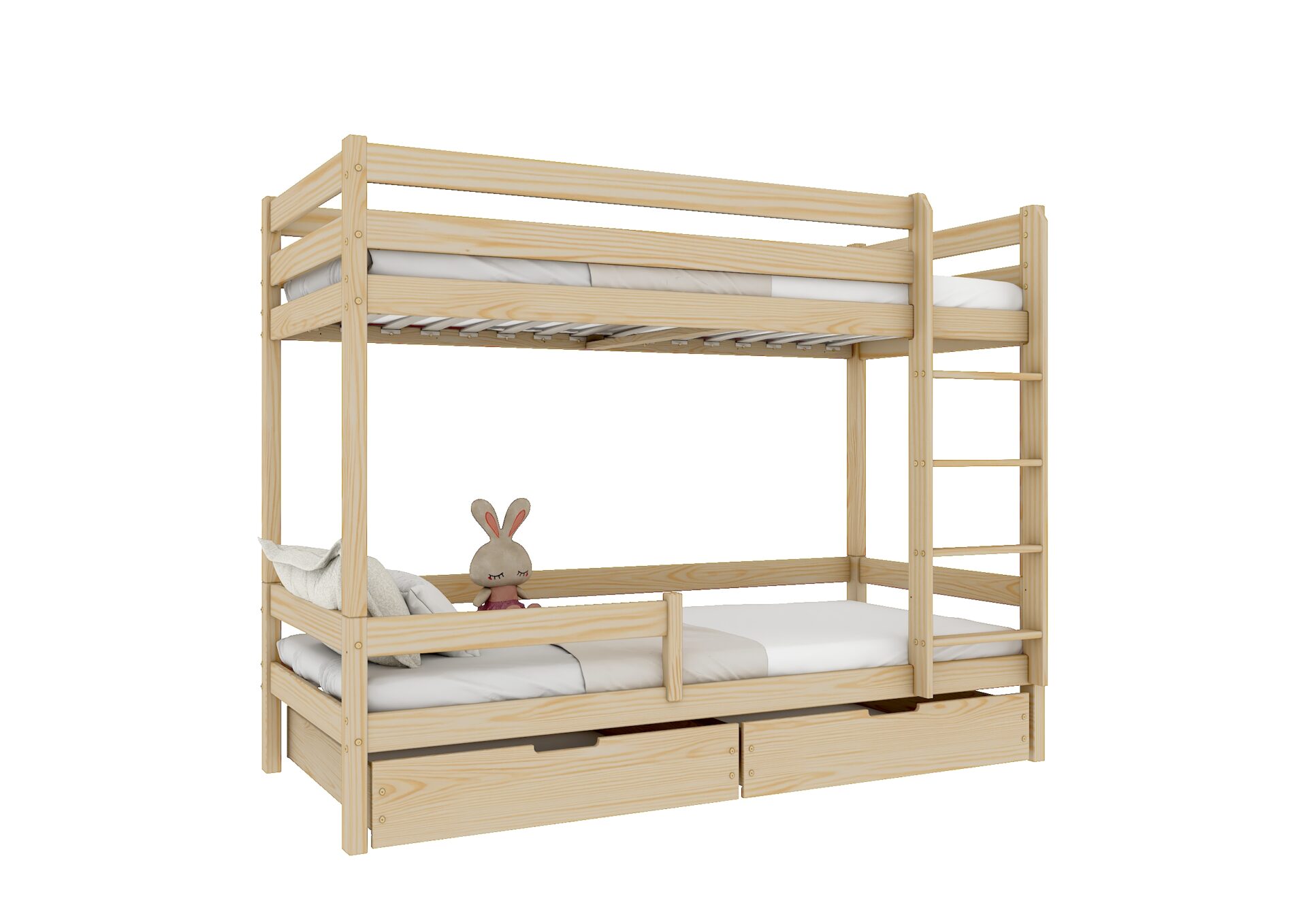 EDDIE drewniane łóżko piętrowe z poziomymi barierkami i szufladami na pościel