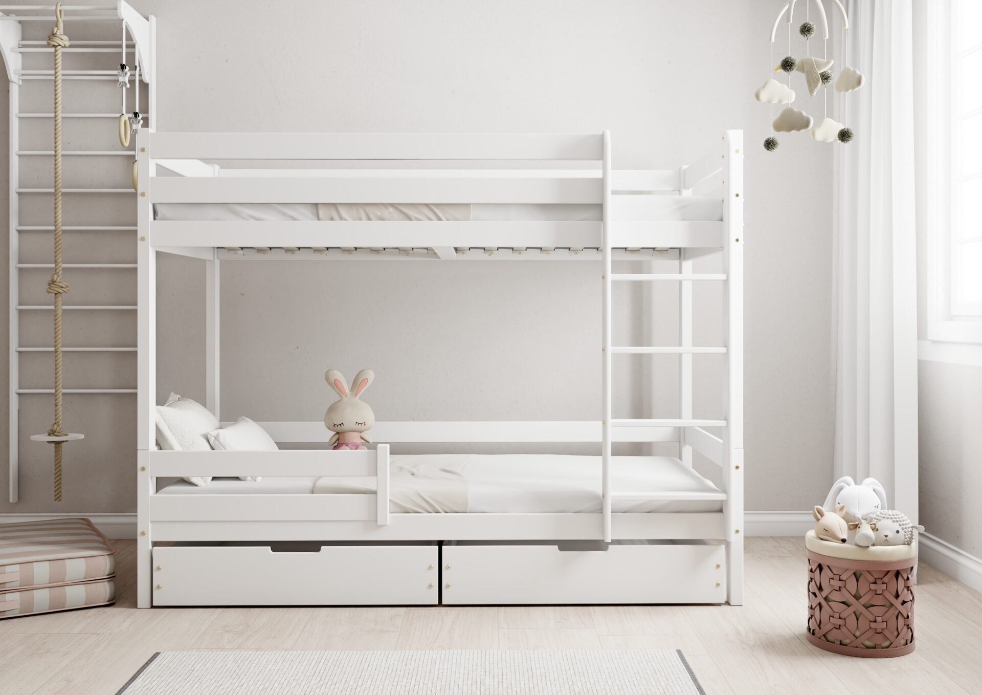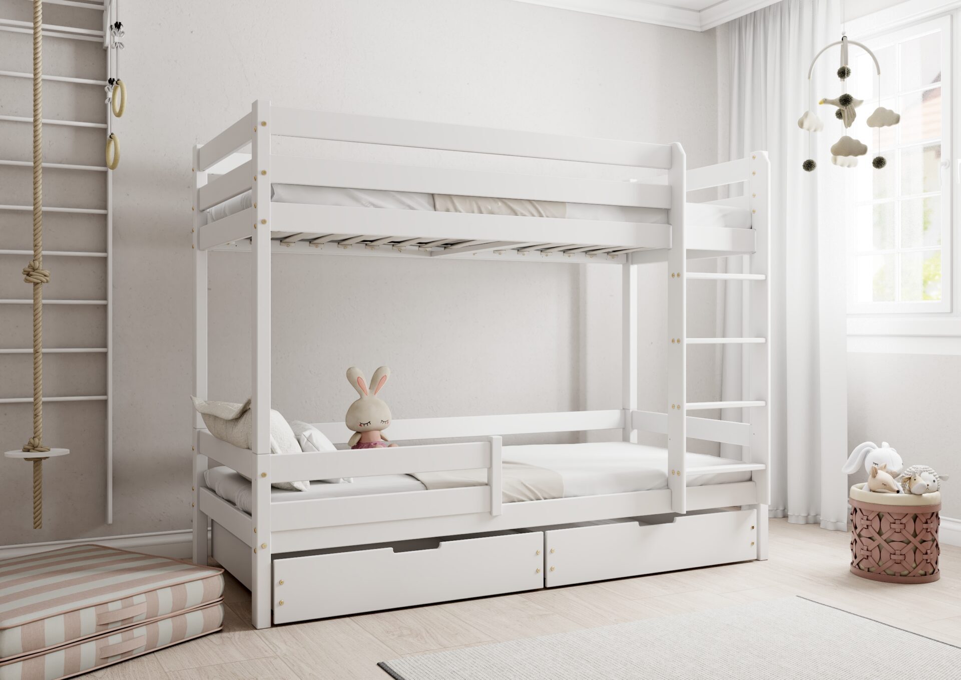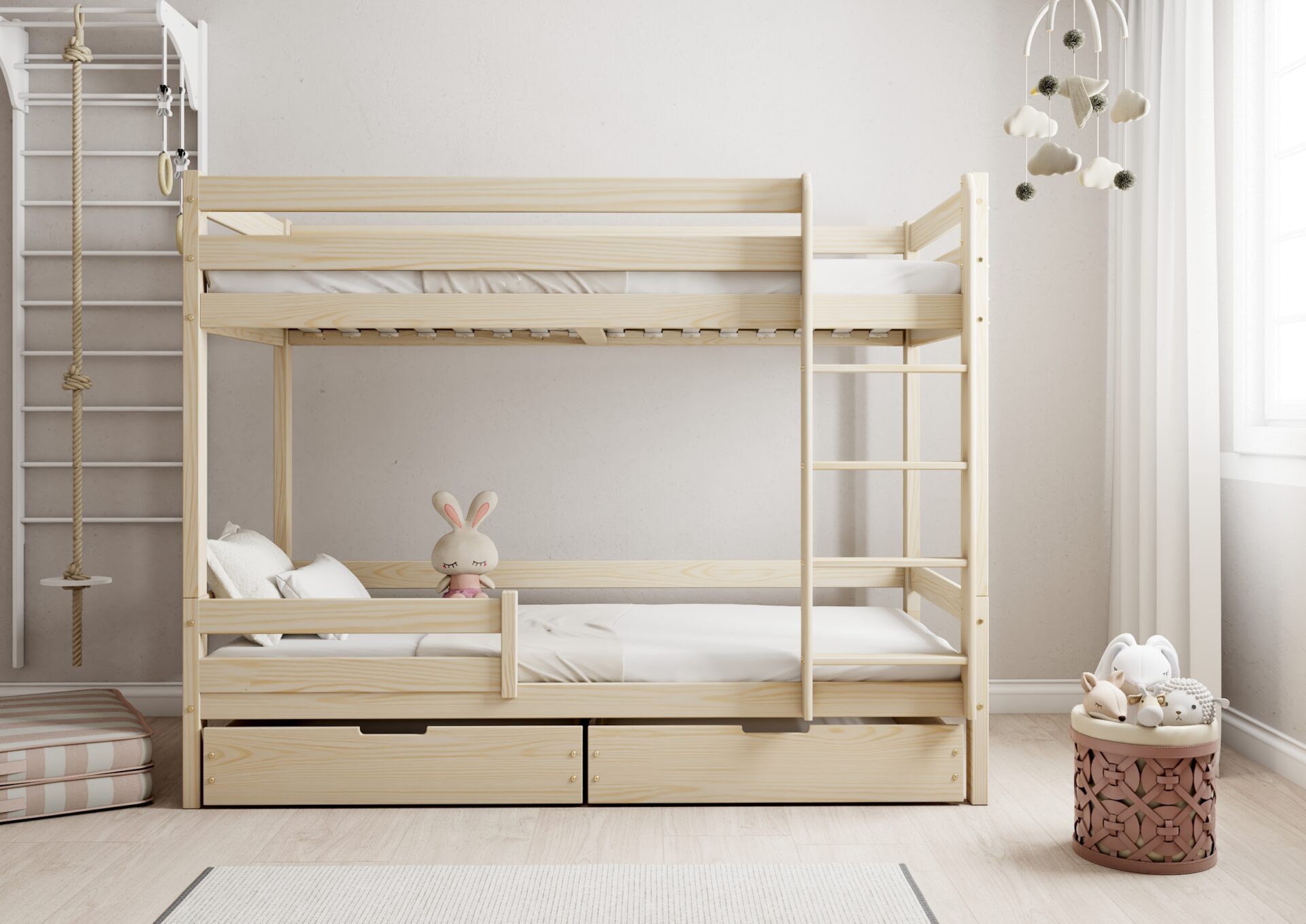 Praktyczność: możliwość zamontowania drabinki po lewej lub prawej stronie, pojemne szuflady na pościel.