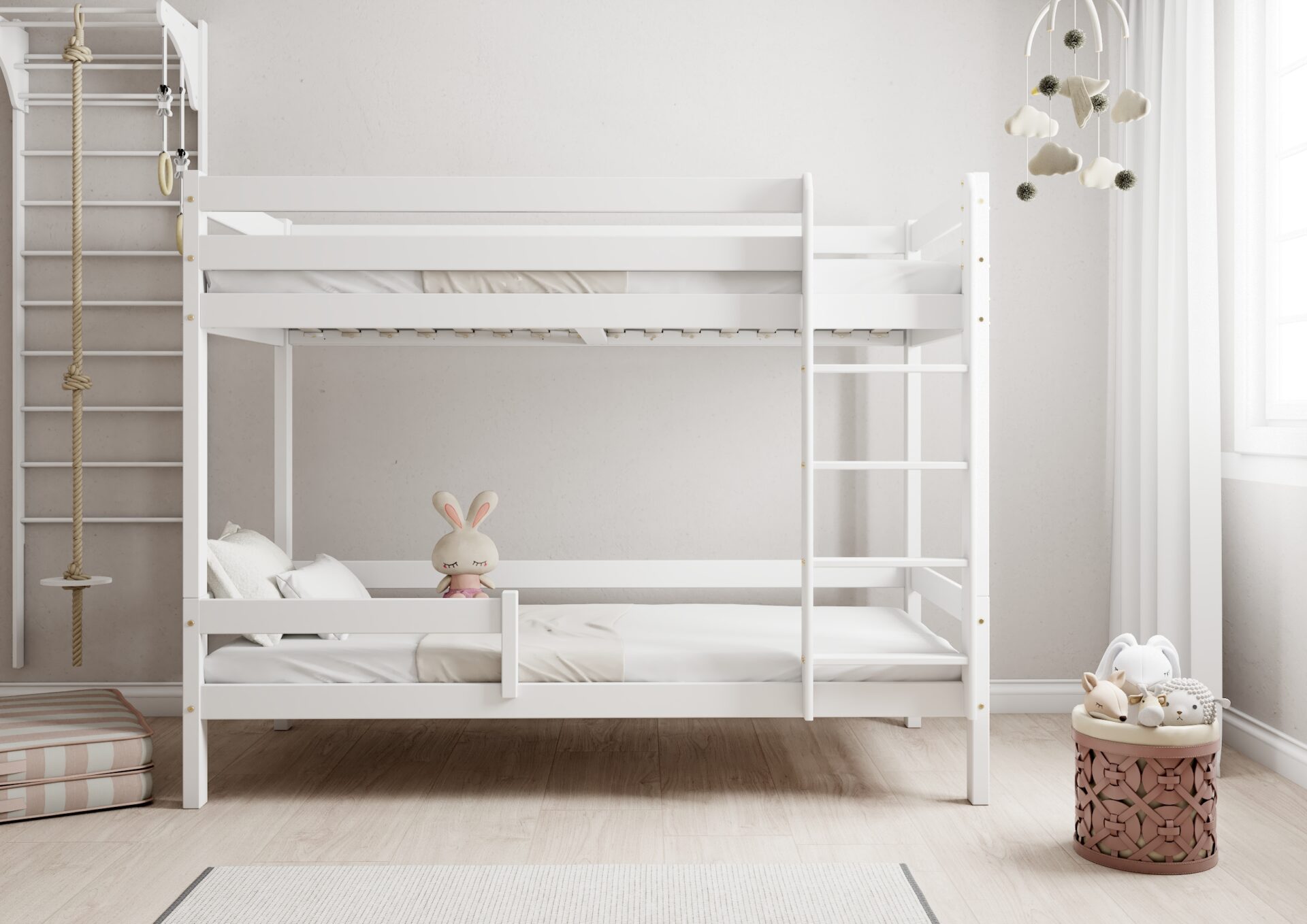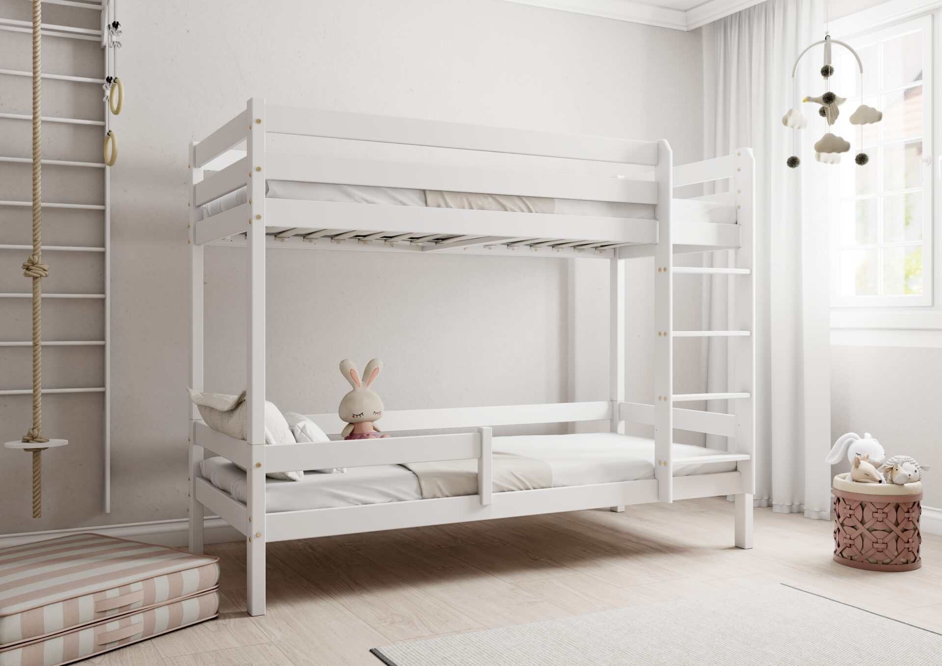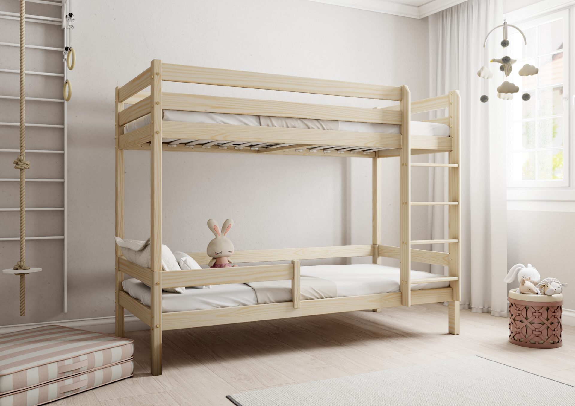 Bezpieczeństwo dzieci podczas snu i zabawy jest priorytetem w konstrukcji łóżka EDDIE. Wyposażone w mocne barierki ochronne w formie poziomych desek, zapewniają one ochronę przed przypadkowym wypadnięciem. Dostęp do górnego łóżka jest łatwy i bezpieczny dzięki stabilnej i ergonomicznej drabinie.
