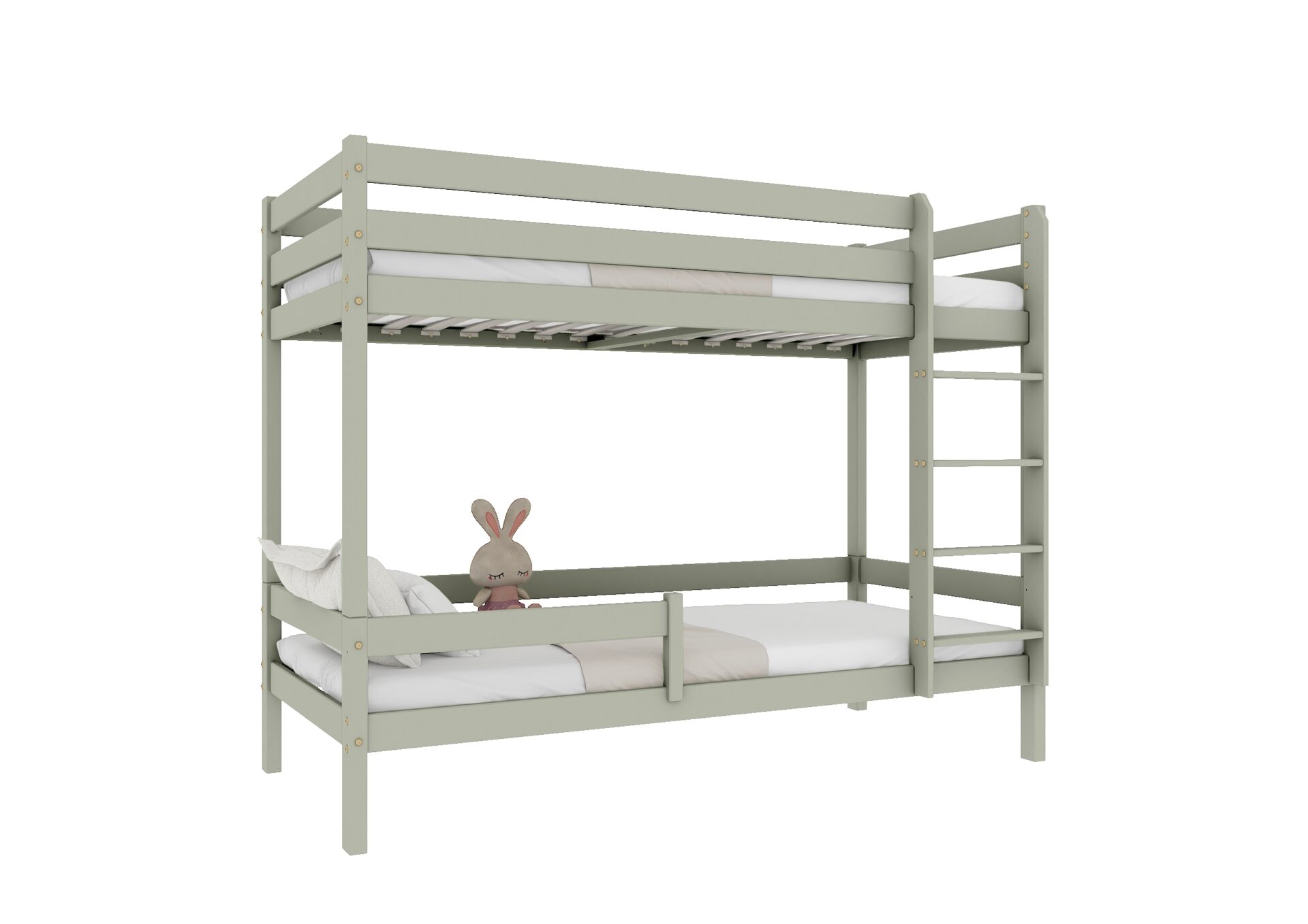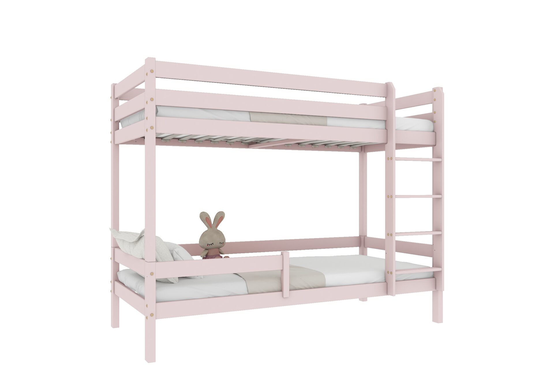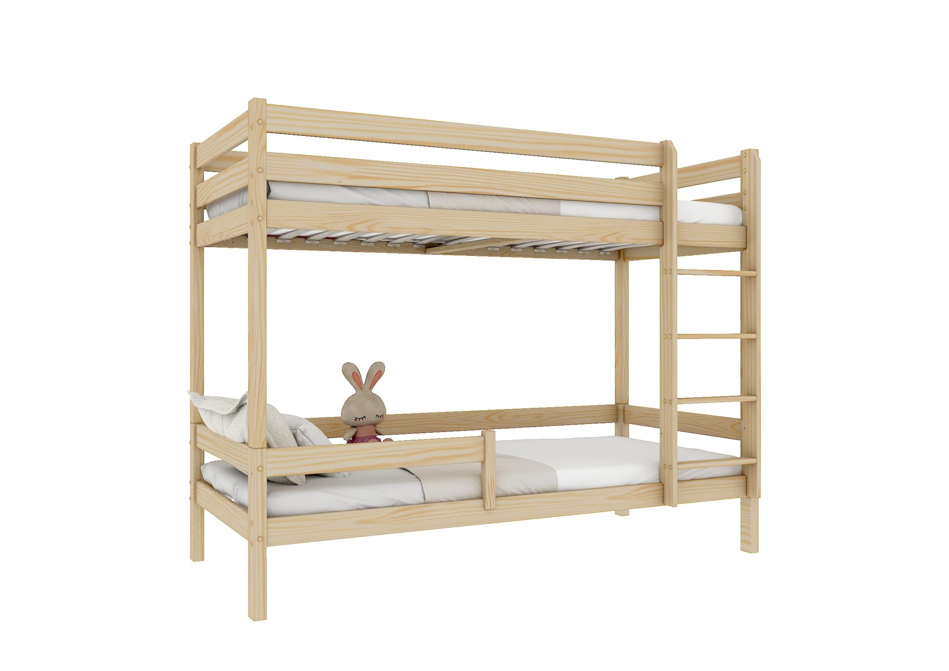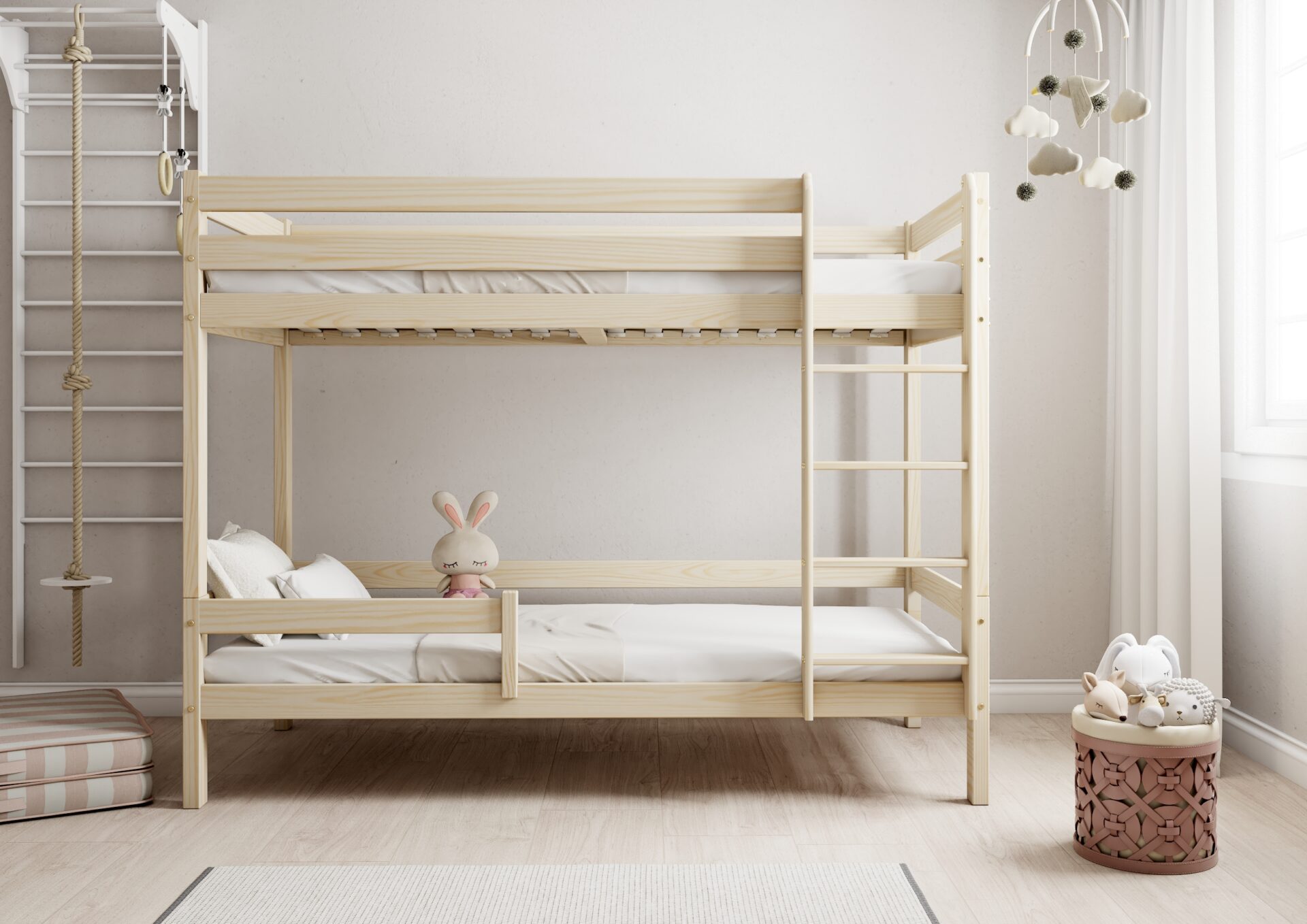 Bezpieczeństwo dzieci podczas snu i zabawy jest priorytetem w konstrukcji łóżka EDDIE. Wyposażone w mocne barierki ochronne w formie poziomych desek, zapewniają one ochronę przed przypadkowym wypadnięciem. Dostęp do górnego łóżka jest łatwy i bezpieczny dzięki stabilnej i ergonomicznej drabinie.