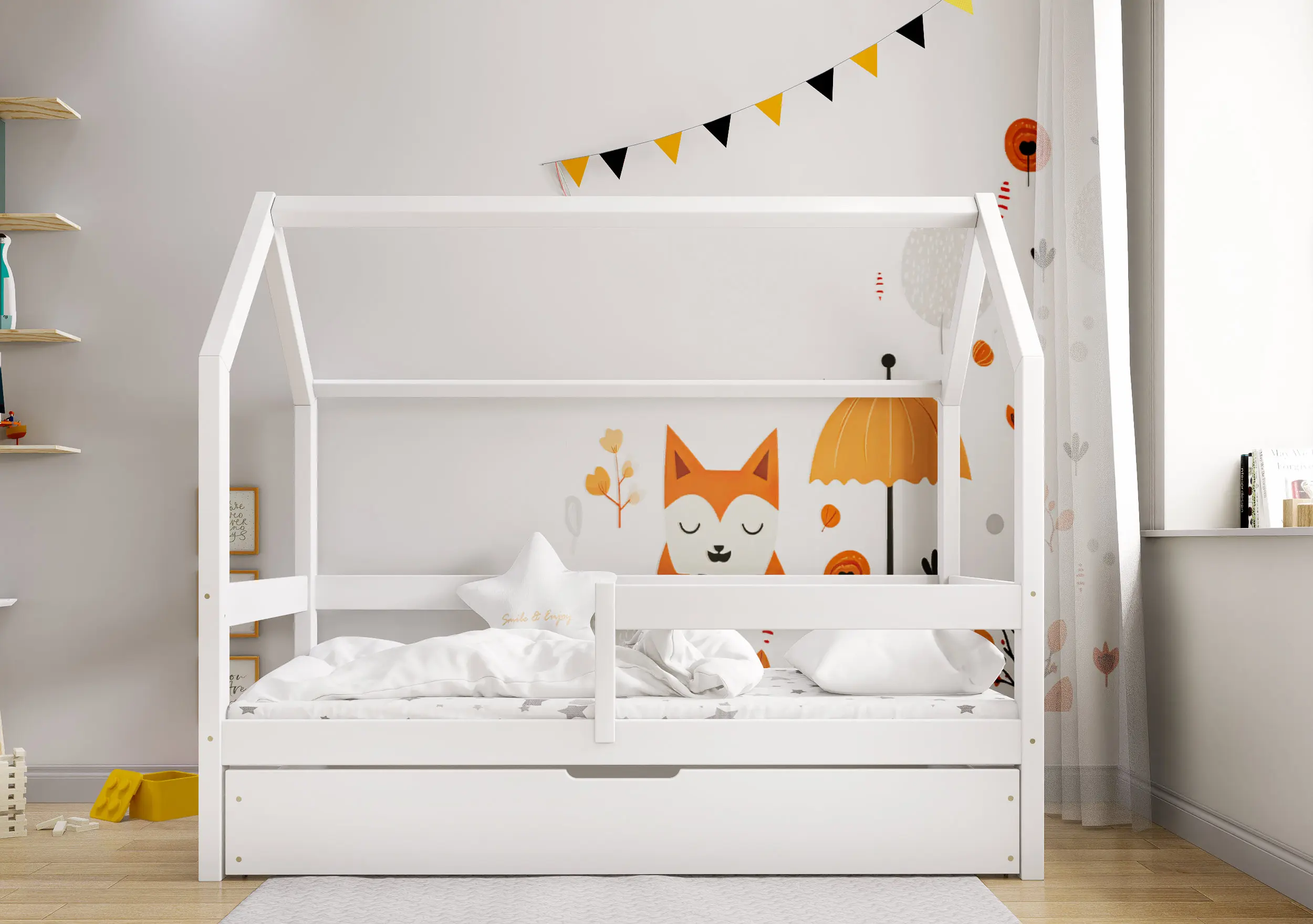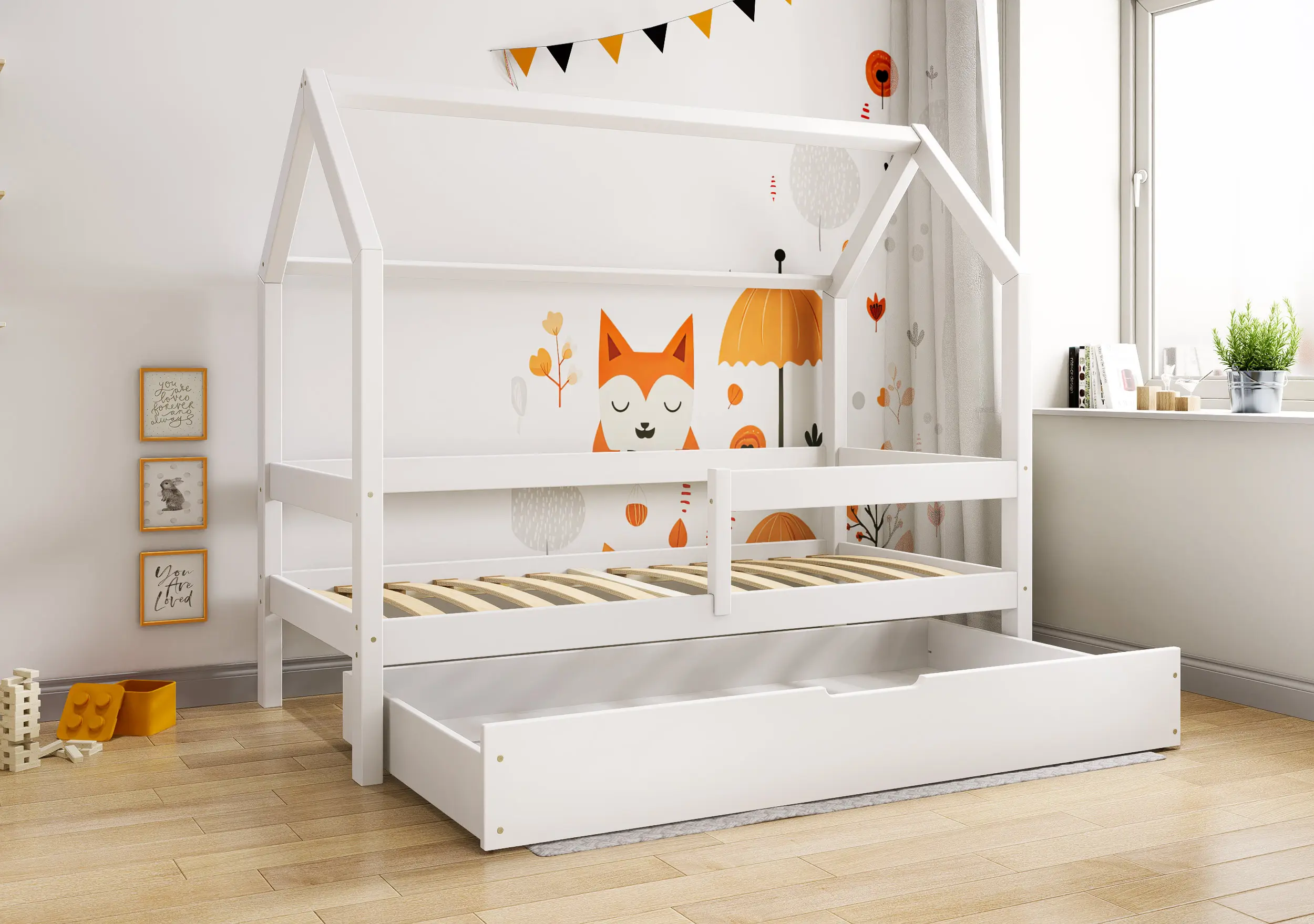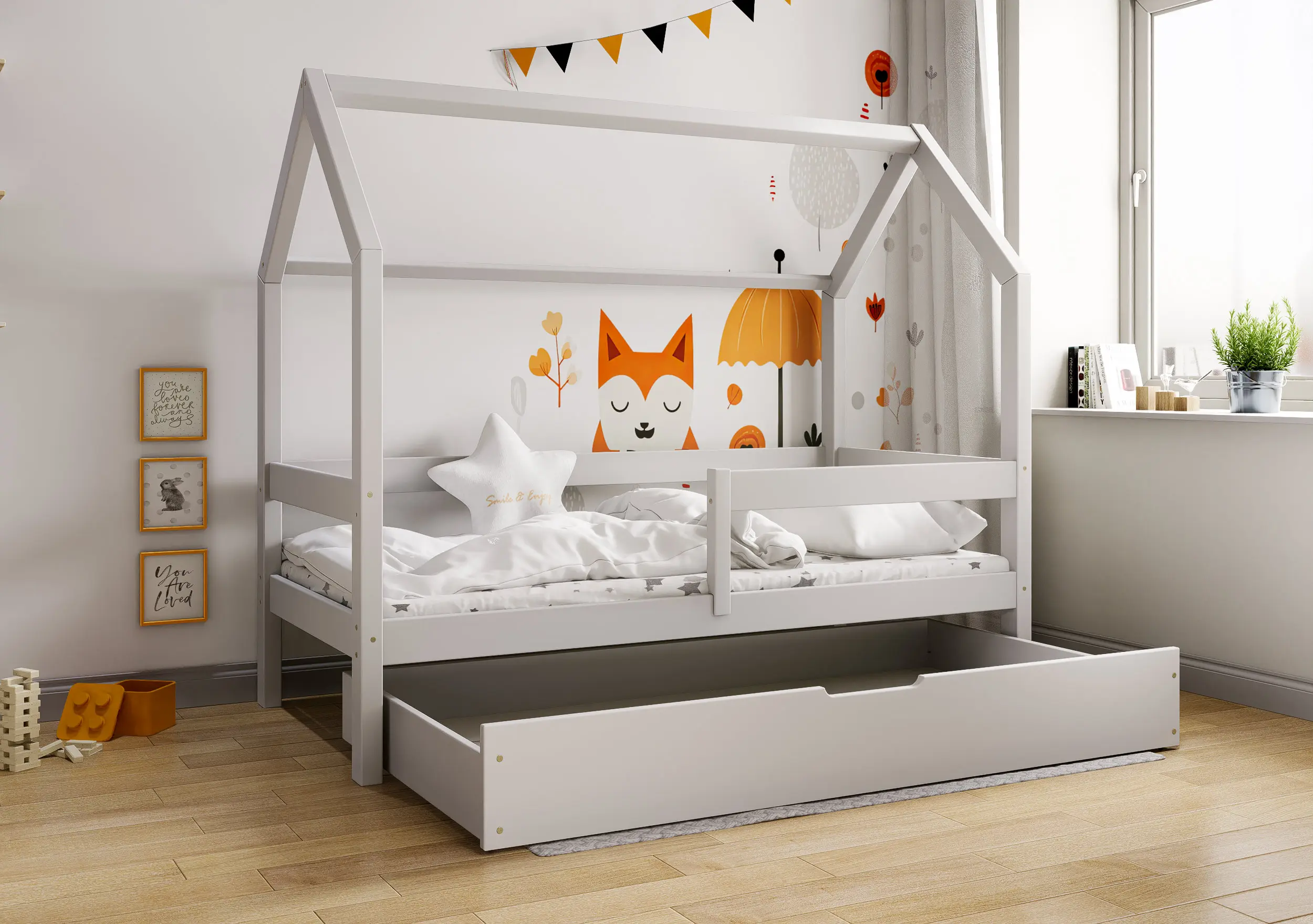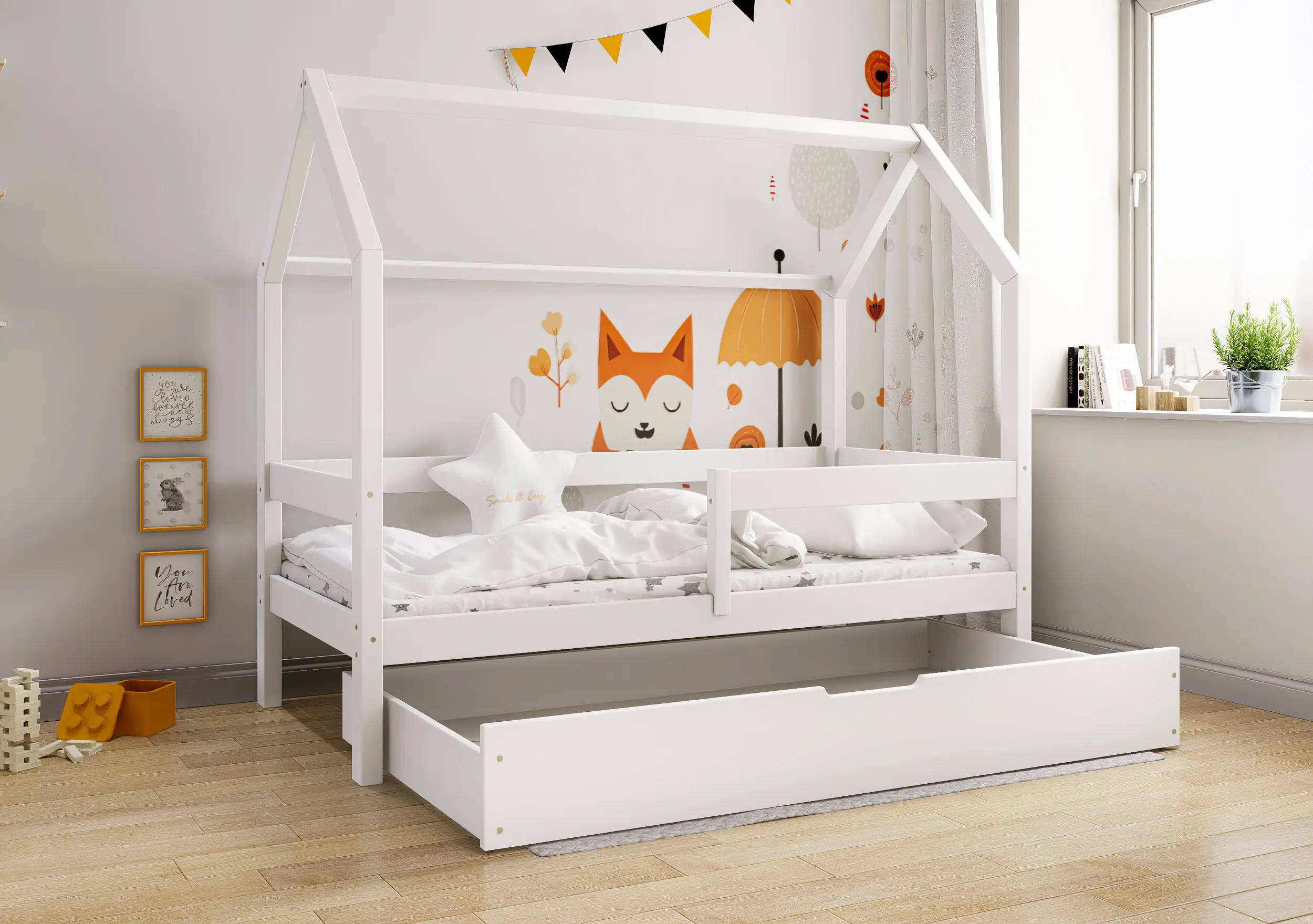 Łóżko dziecięce Flo Bis, swoją skandynawską stylistyką rozbudzi wyobraźnię i kreatywność Twojego malucha. Nietuzinkowa rama łóżka w kształcie domku z prostymi barierkami, w otoczeniu delikatnego oświetlenia wiszących lampek, miękkich zasłon czy kolorowych girland, oferuje nieograniczone możliwości aranżacyjne. Jeśli doda się do tego wysoką wytrzymałość mebla, precyzję jego wykonania oraz użycie wyłącznie naturalnych i ekologicznych surowców, to otrzymujemy idealnie miejsce do snu dla Twojego dziecka. Prezentowany model wyposażony został w funkcjonalną szufladę na pościel, wysuwaną na rolkach o miękkiej gumowej powłoce zabezpieczającej podłogę przez zarysowaniami.