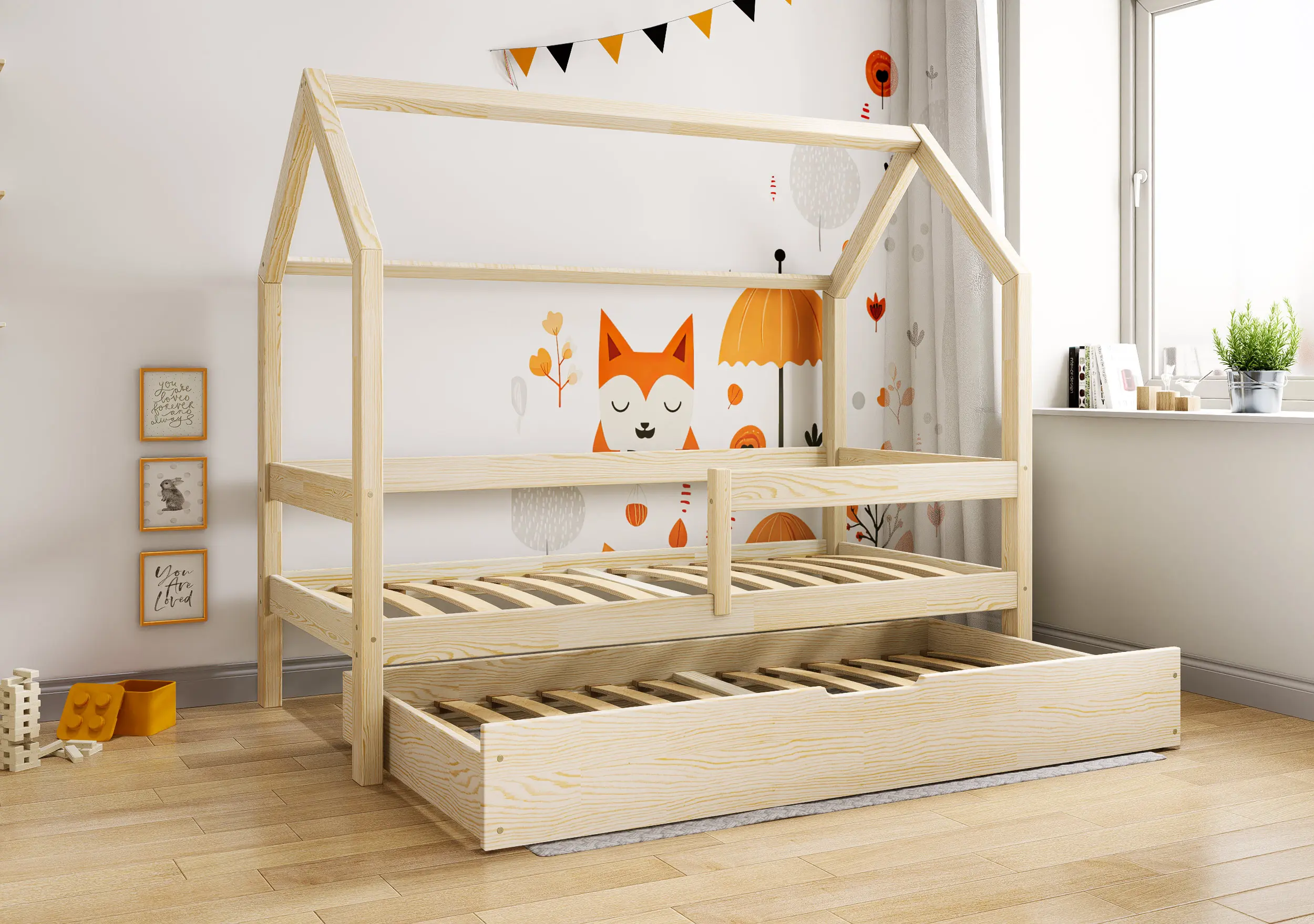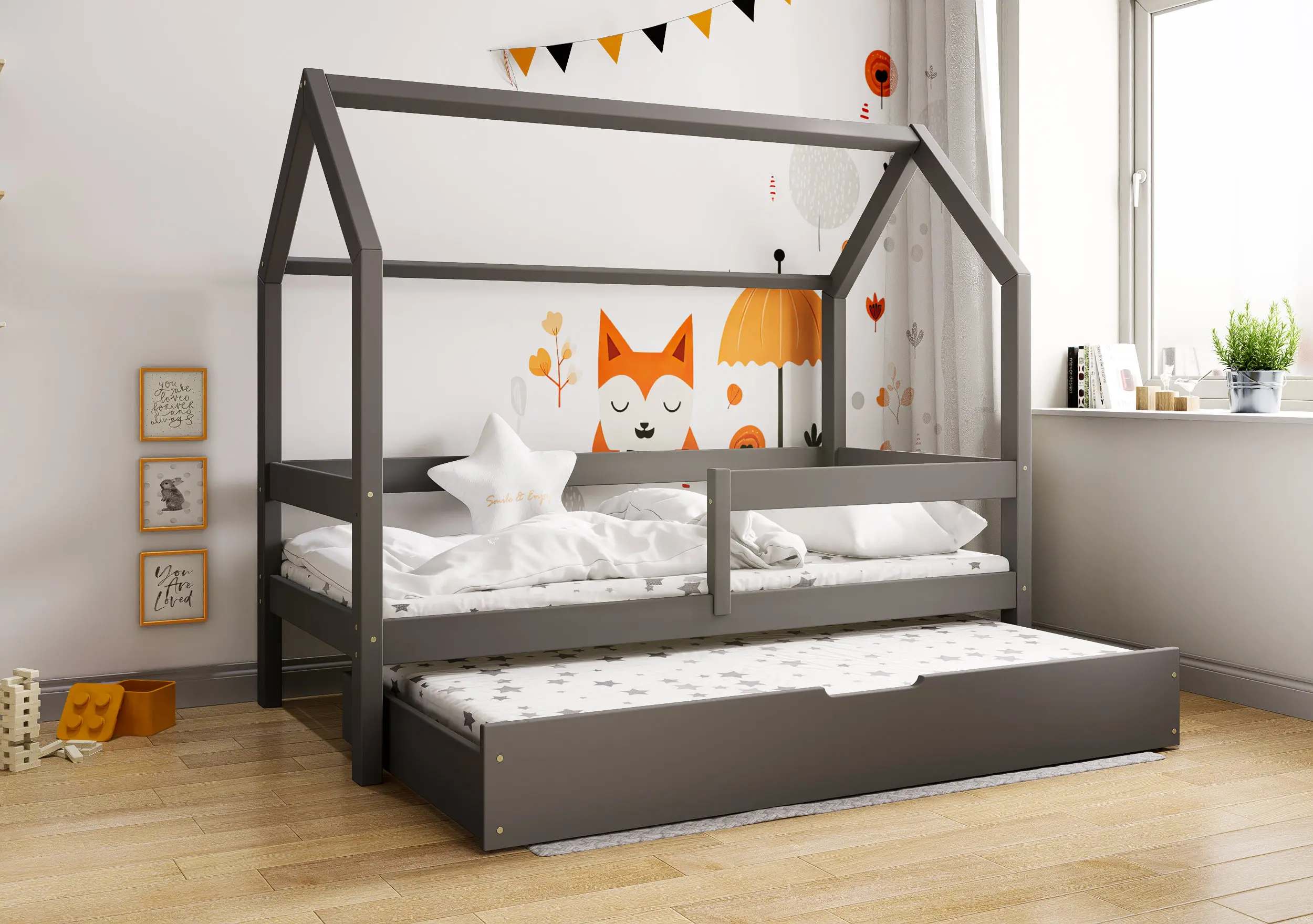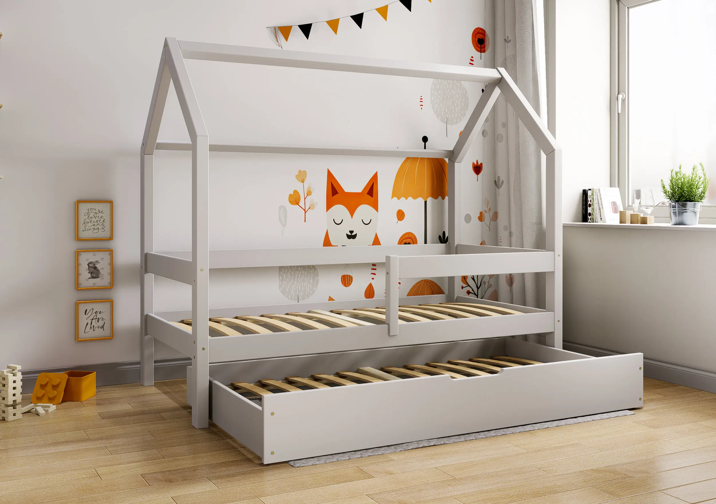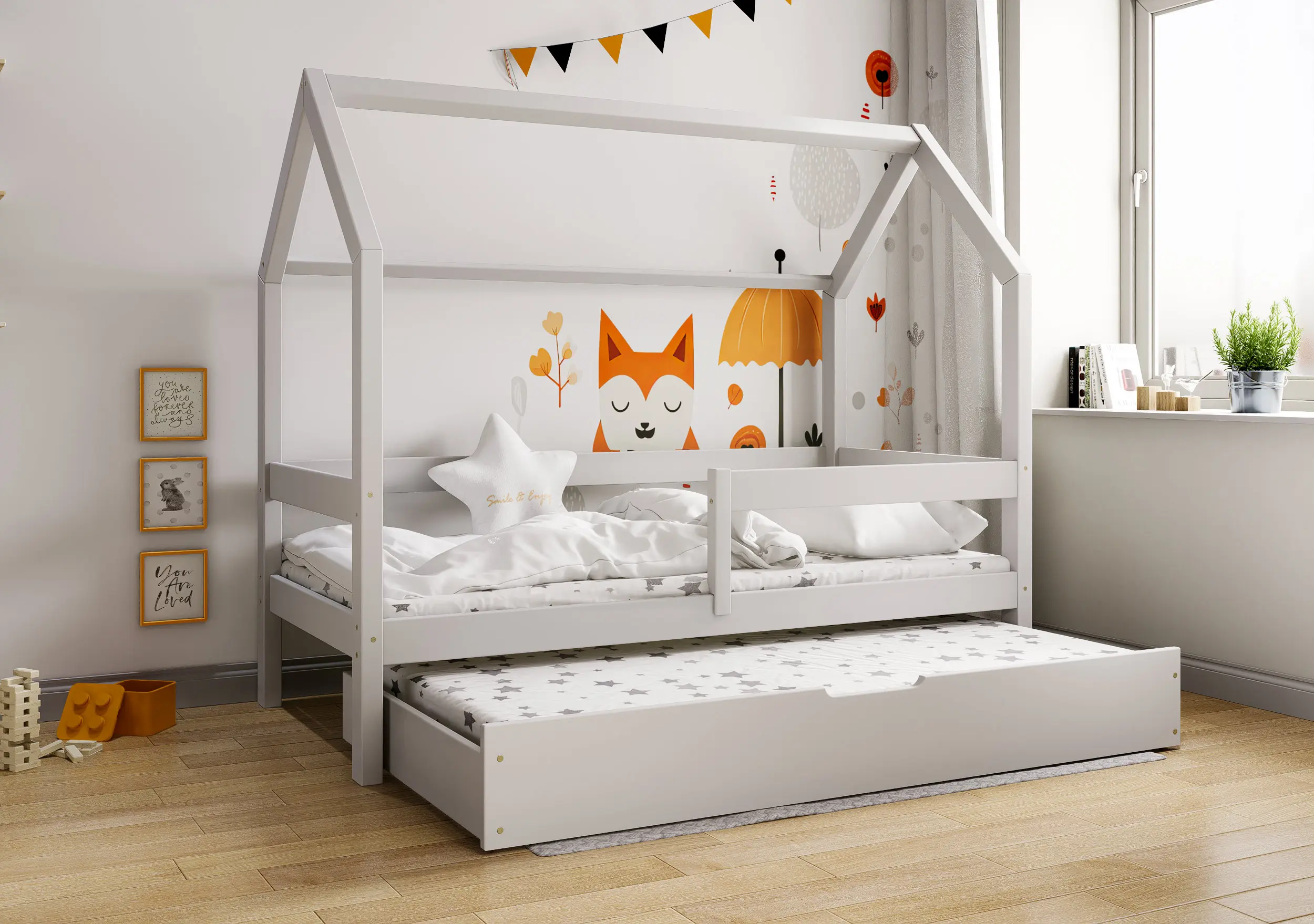 Łóżko dziecięce Flo Bis2 pobudzi kreatywność i pomysłowość Twojego malucha. Przemyślana konstrukcja mebla w formie domku z prostymi barierkami, dzięki ciekawym tekstylnym dodakom pozwoli stworzyć zarówno przytulną jak i bezpieczną przestrzeń do wypoczynku i zabawy. Łóżko Flo Bis2 jest modelem dwuosobowym. Za sprawą dodatkowej powierzchni spania w wysywanej szufladzie bedziesz mógł zapewnić miejsce do snu dla drugiego dziecka, bez konieczności zagracania dziecięcego pokoju. W naszej ofercie znajduje się ciekawa paleta kolorystyczna oraz duża ilość rozmiarów pozwalająca dobrać model na miarę Twoich potrzeb.