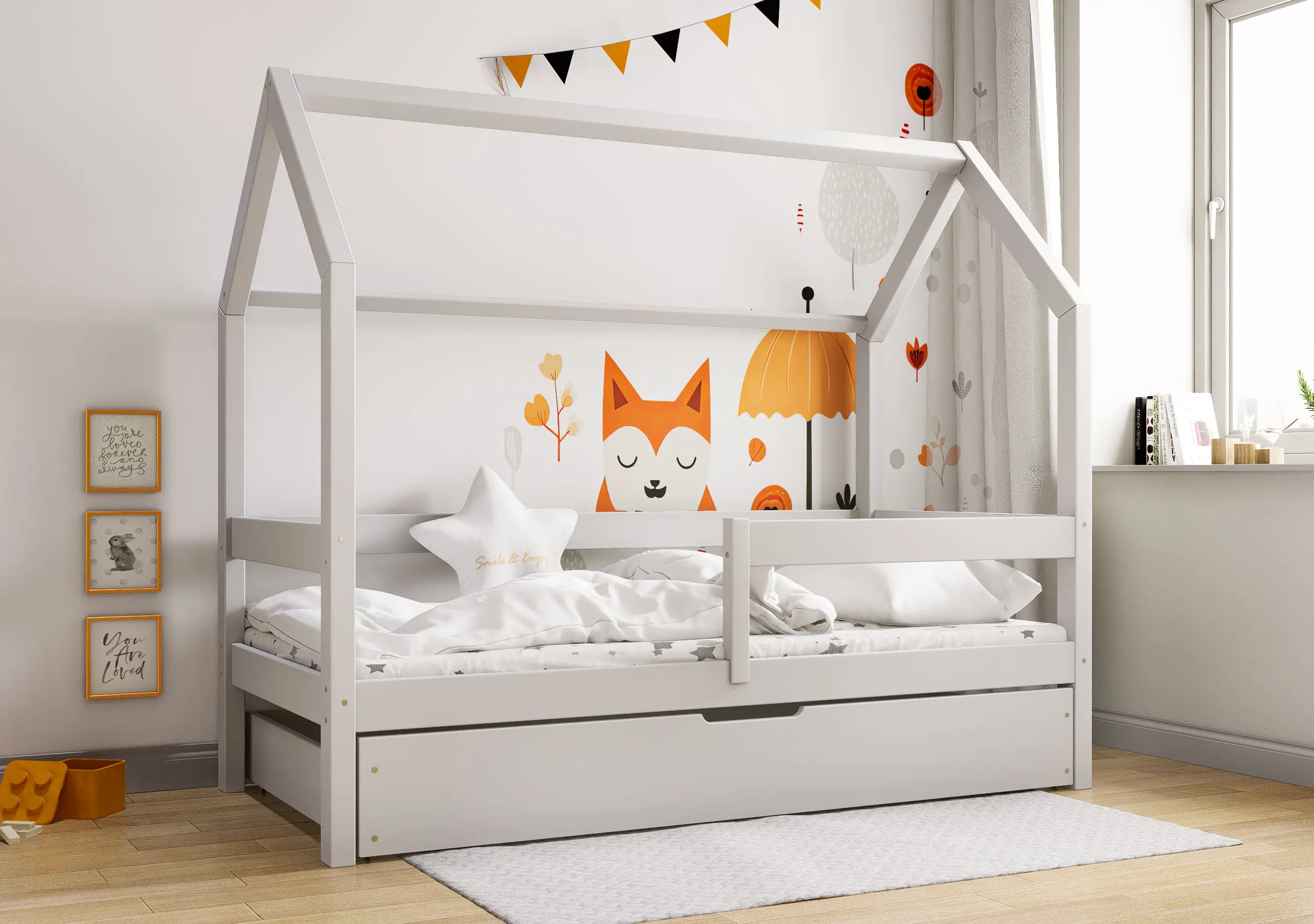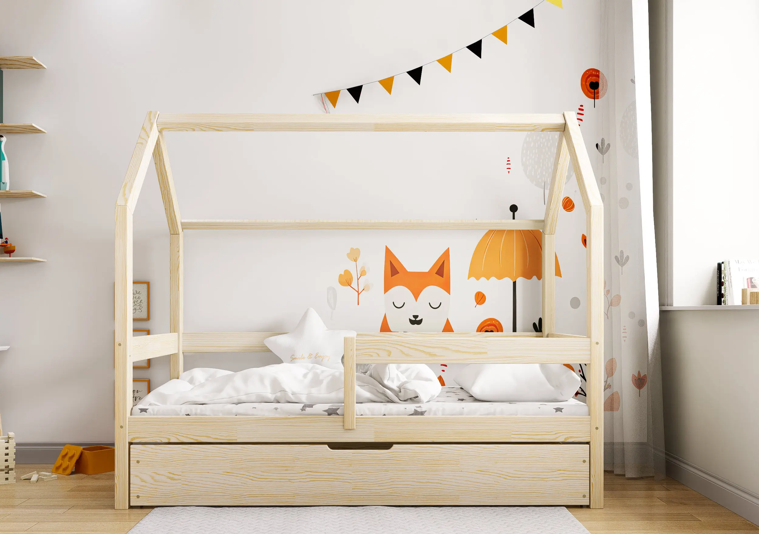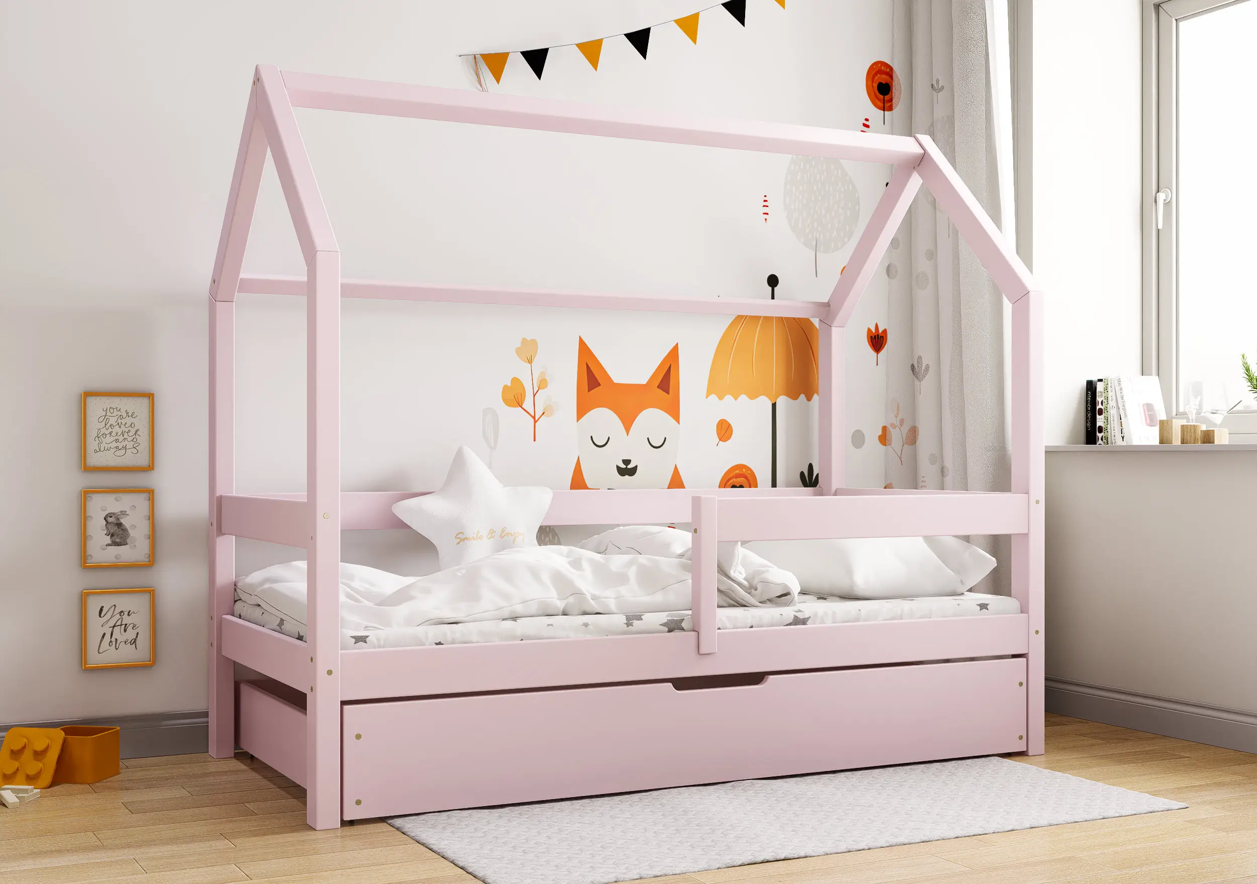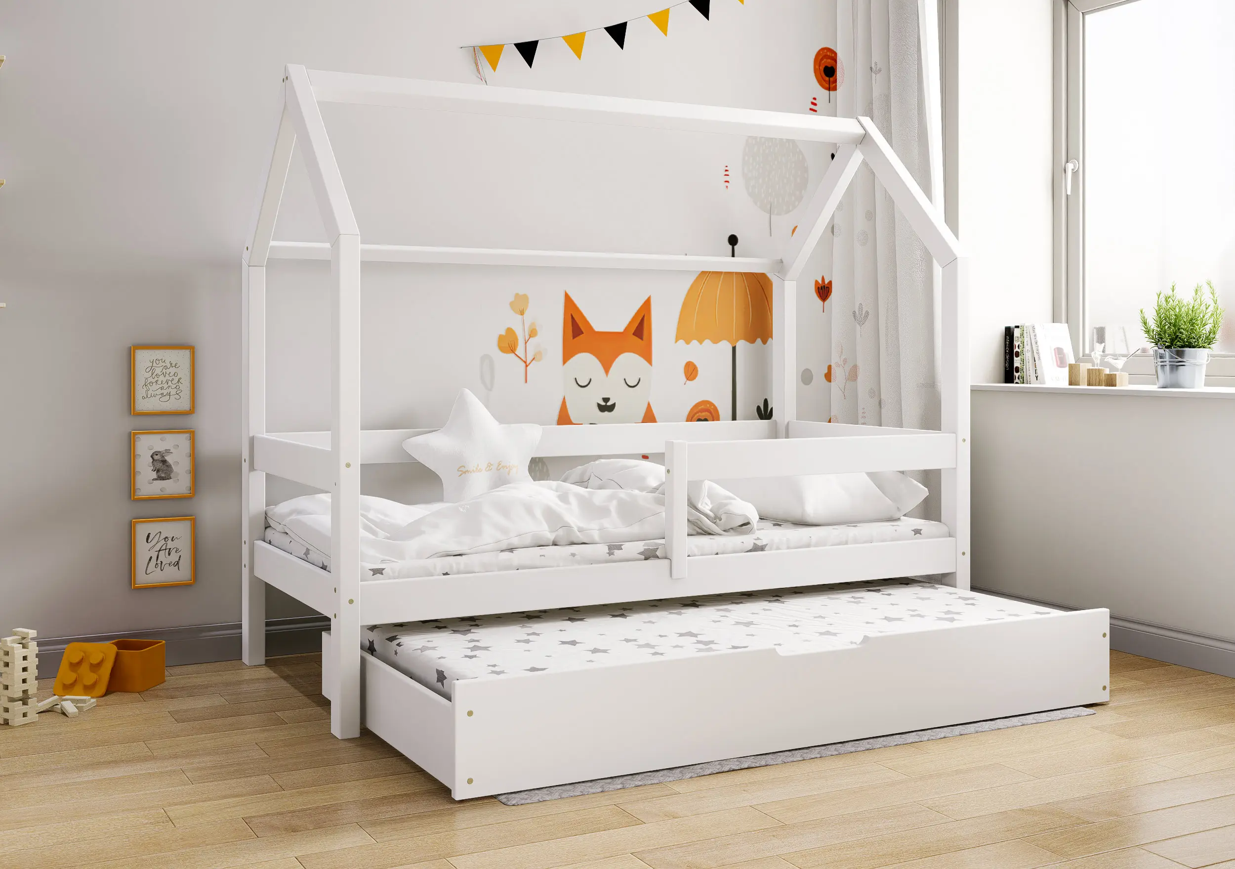 Łóżko dziecięce Flo Bis2 pobudzi kreatywność i pomysłowość Twojego malucha. Przemyślana konstrukcja mebla w formie domku z prostymi barierkami, dzięki ciekawym tekstylnym dodakom pozwoli stworzyć zarówno przytulną jak i bezpieczną przestrzeń do wypoczynku i zabawy. Łóżko Flo Bis2 jest modelem dwuosobowym. Za sprawą dodatkowej powierzchni spania w wysywanej szufladzie bedziesz mógł zapewnić miejsce do snu dla drugiego dziecka, bez konieczności zagracania dziecięcego pokoju. W naszej ofercie znajduje się ciekawa paleta kolorystyczna oraz duża ilość rozmiarów pozwalająca dobrać model na miarę Twoich potrzeb.