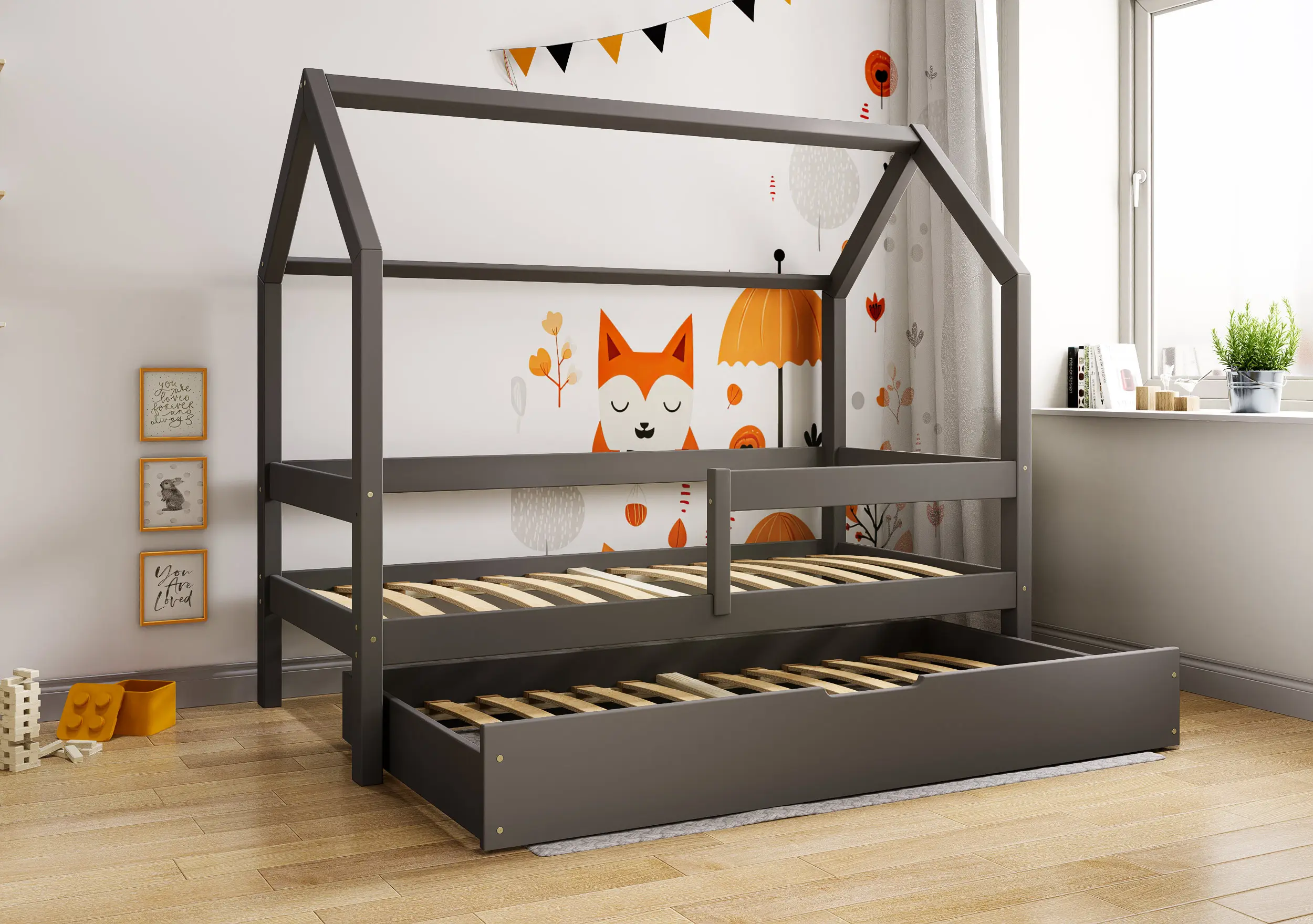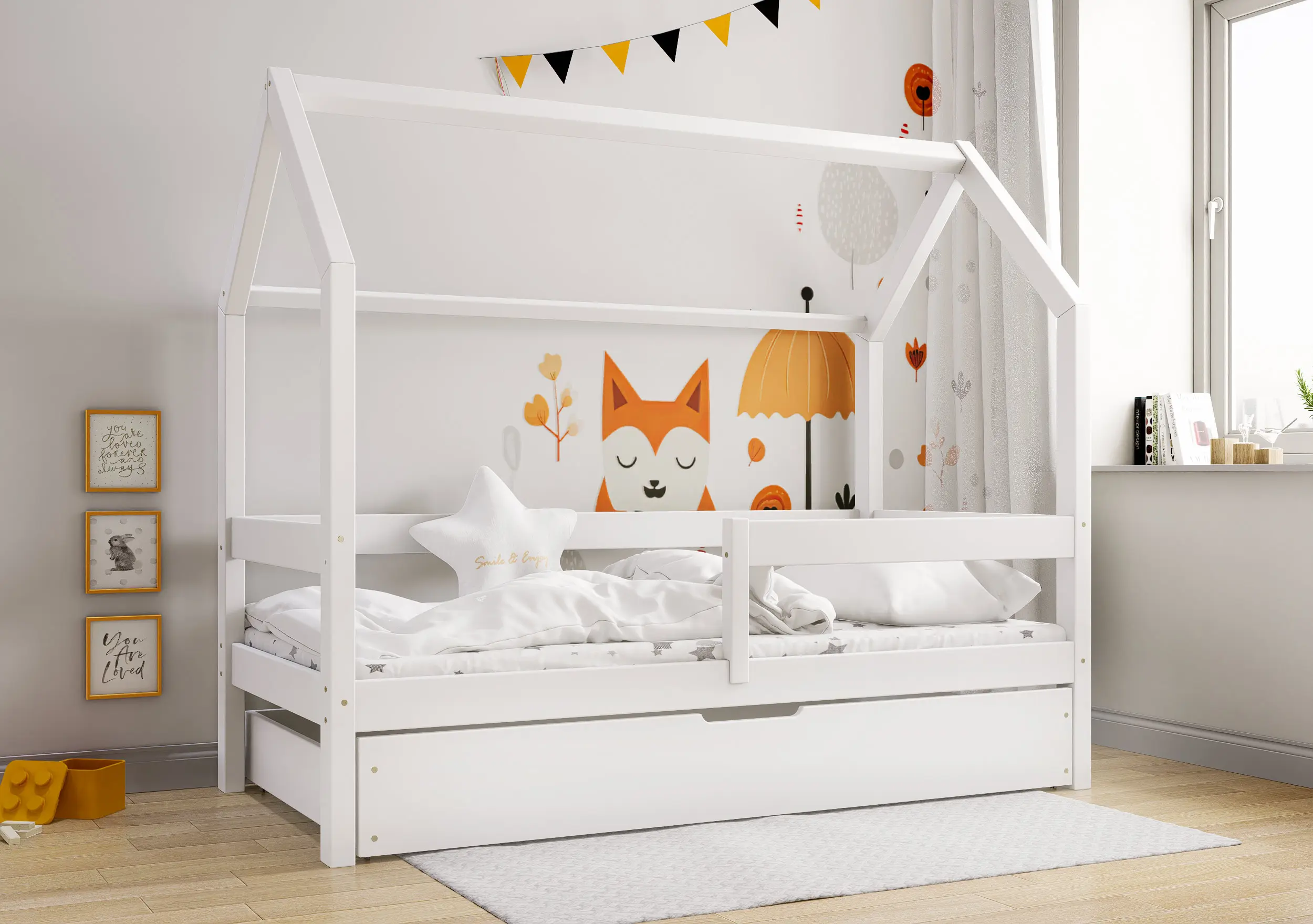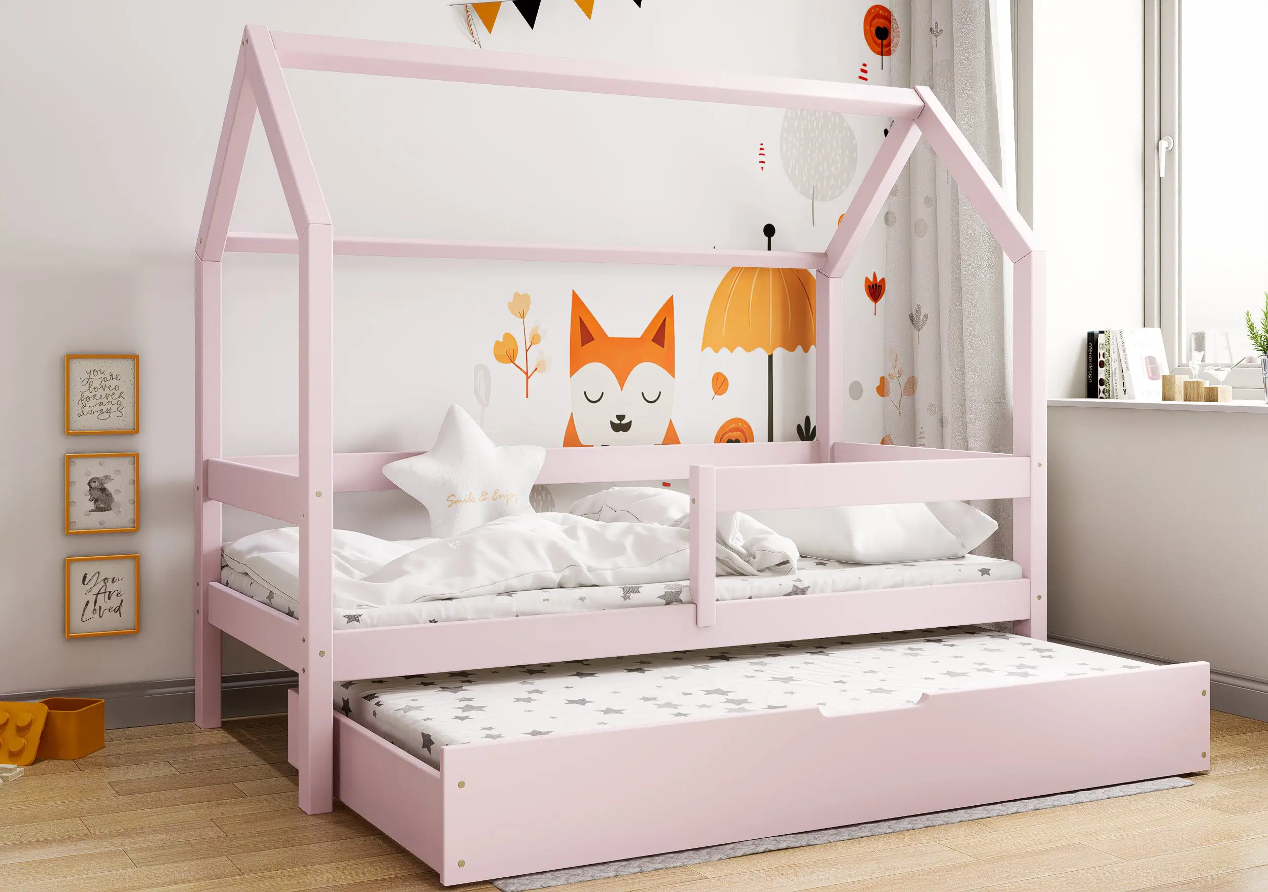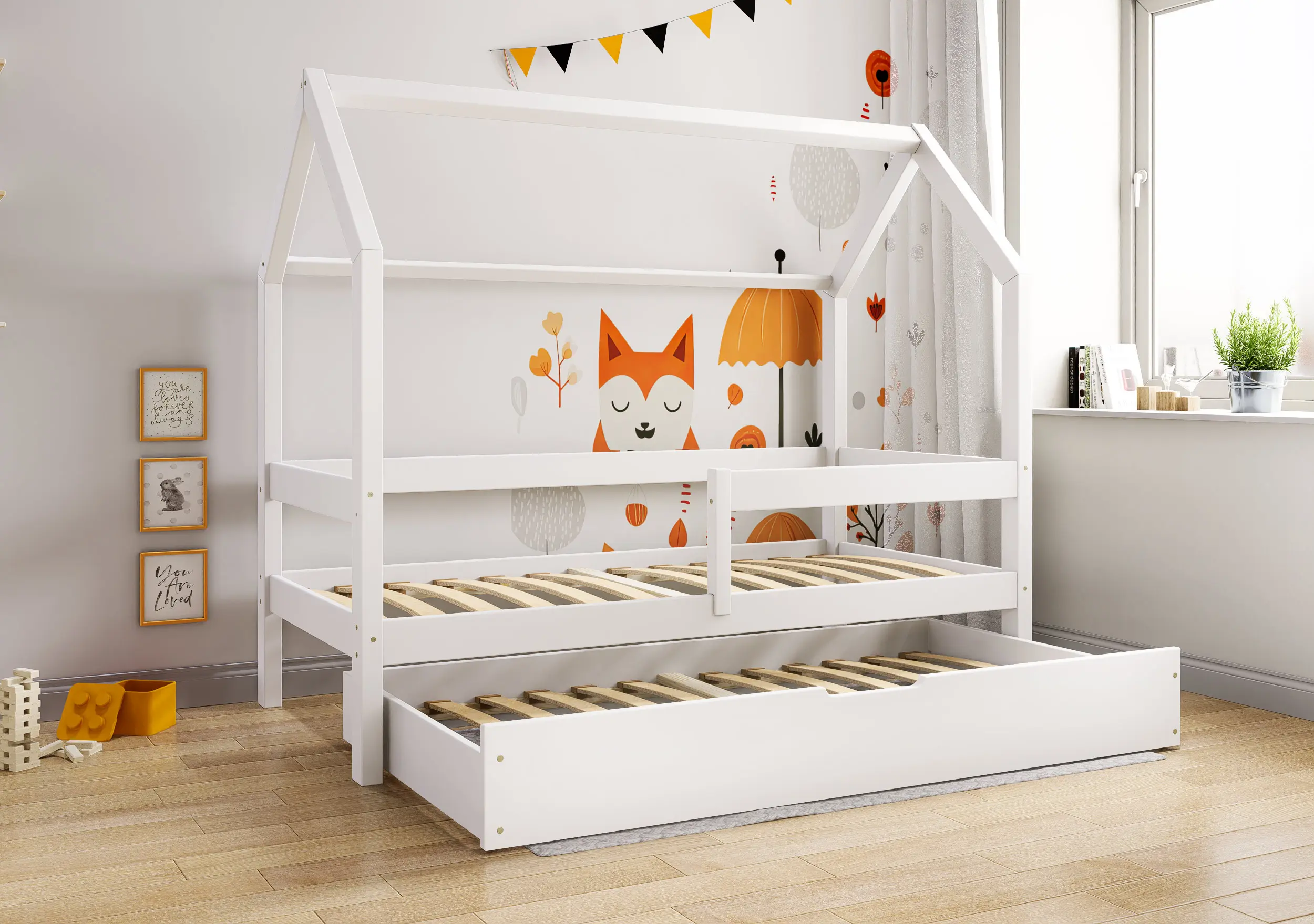 Łóżko dziecięce Flo Bis2 pobudzi kreatywność i pomysłowość Twojego malucha. Przemyślana konstrukcja mebla w formie domku z prostymi barierkami, dzięki ciekawym tekstylnym dodakom pozwoli stworzyć zarówno przytulną jak i bezpieczną przestrzeń do wypoczynku i zabawy. Łóżko Flo Bis2 jest modelem dwuosobowym. Za sprawą dodatkowej powierzchni spania w wysywanej szufladzie bedziesz mógł zapewnić miejsce do snu dla drugiego dziecka, bez konieczności zagracania dziecięcego pokoju. W naszej ofercie znajduje się ciekawa paleta kolorystyczna oraz duża ilość rozmiarów pozwalająca dobrać model na miarę Twoich potrzeb.