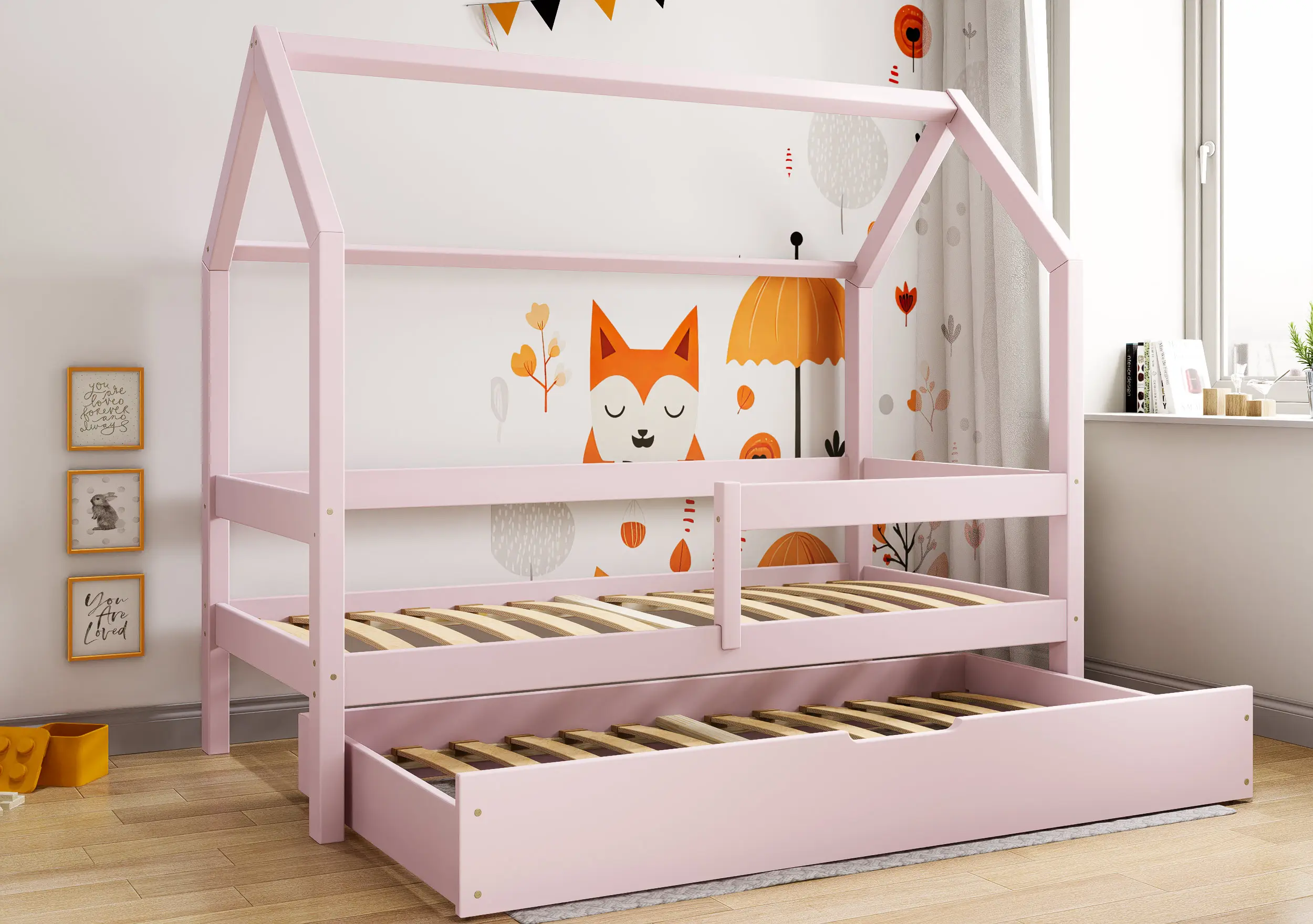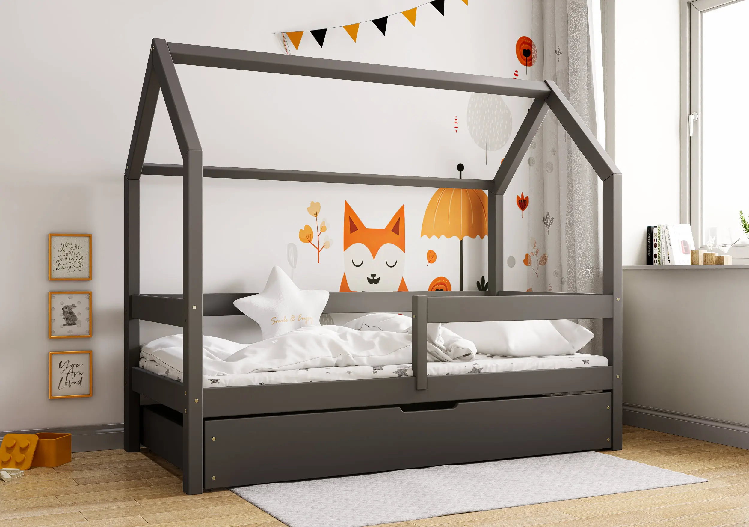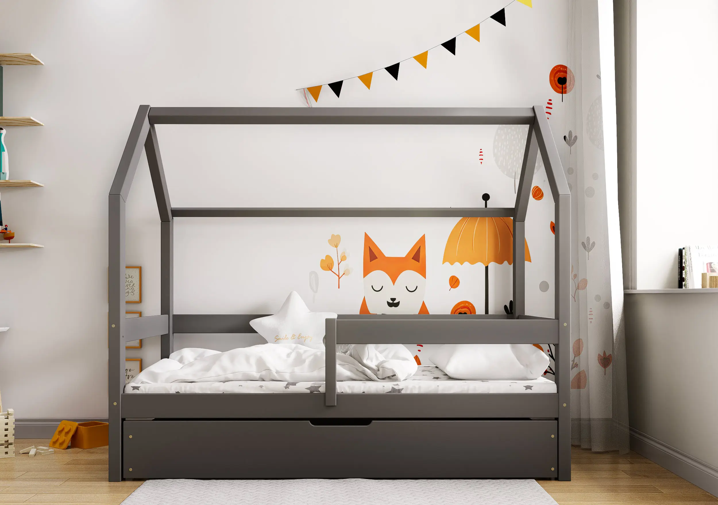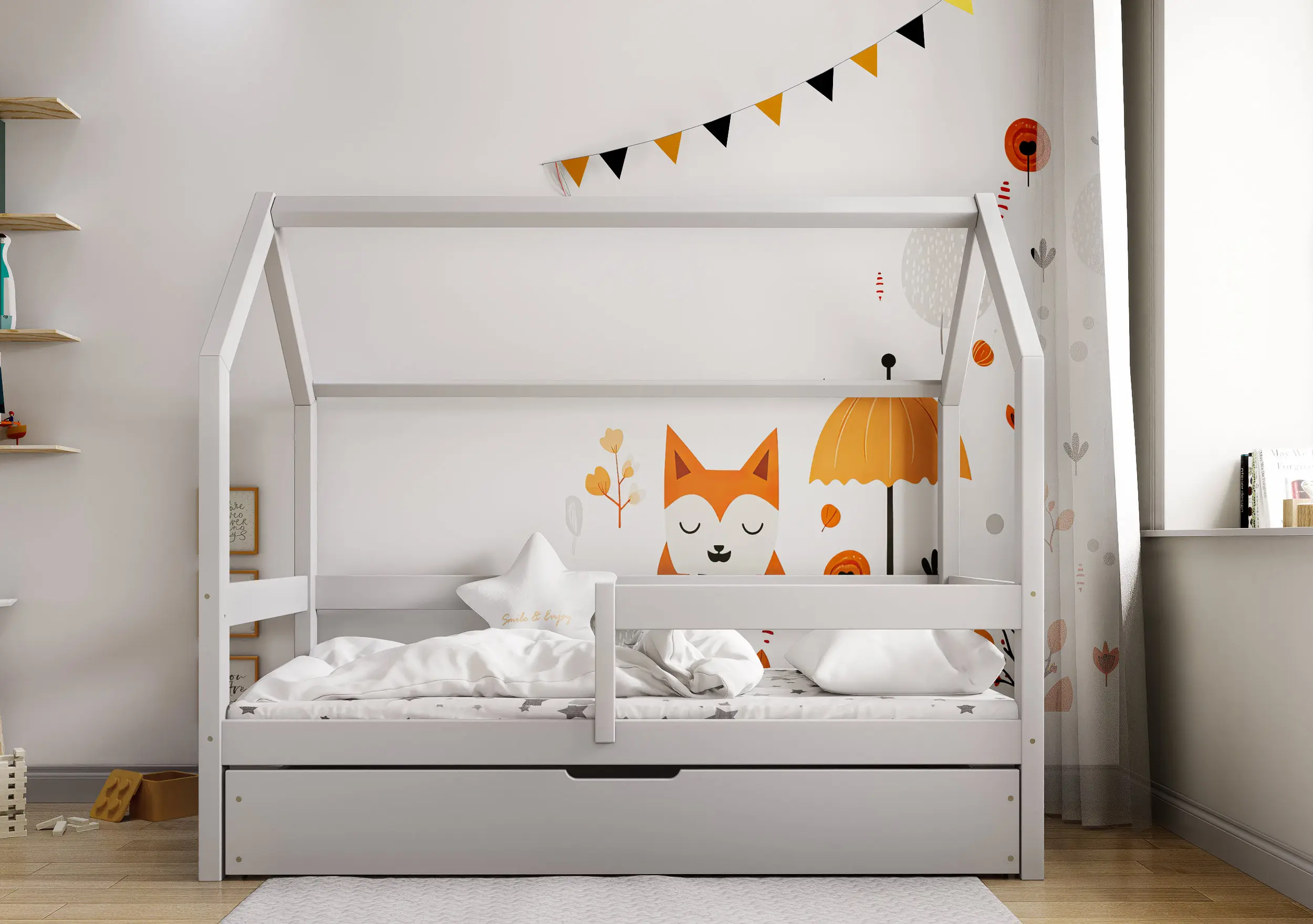 Łóżko dziecięce Flo Bis2 pobudzi kreatywność i pomysłowość Twojego malucha. Przemyślana konstrukcja mebla w formie domku z prostymi barierkami, dzięki ciekawym tekstylnym dodakom pozwoli stworzyć zarówno przytulną jak i bezpieczną przestrzeń do wypoczynku i zabawy. Łóżko Flo Bis2 jest modelem dwuosobowym. Za sprawą dodatkowej powierzchni spania w wysywanej szufladzie bedziesz mógł zapewnić miejsce do snu dla drugiego dziecka, bez konieczności zagracania dziecięcego pokoju. W naszej ofercie znajduje się ciekawa paleta kolorystyczna oraz duża ilość rozmiarów pozwalająca dobrać model na miarę Twoich potrzeb.