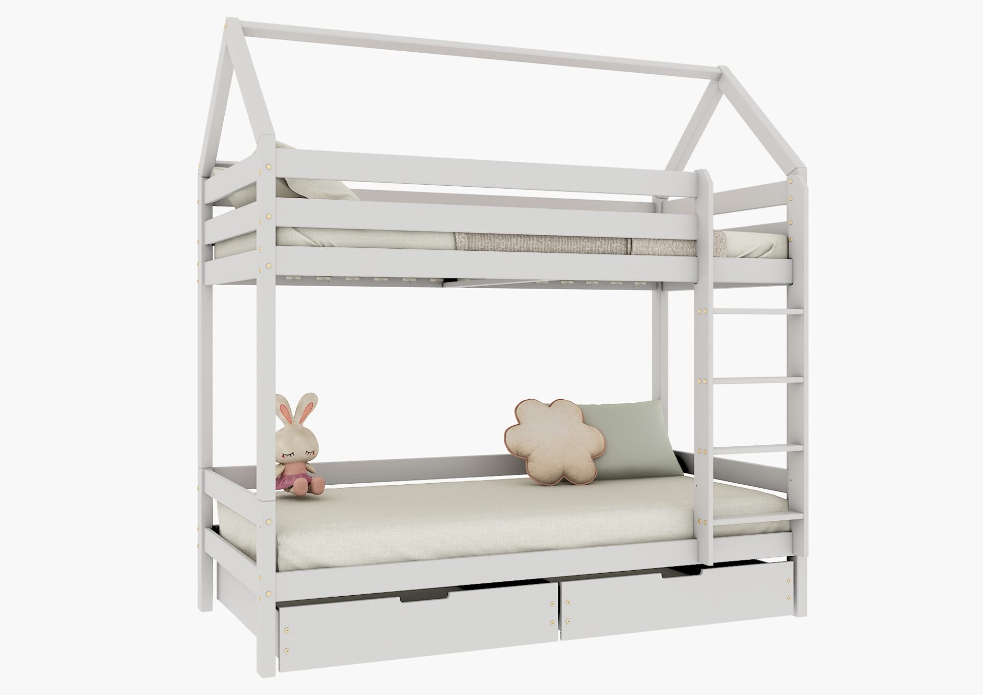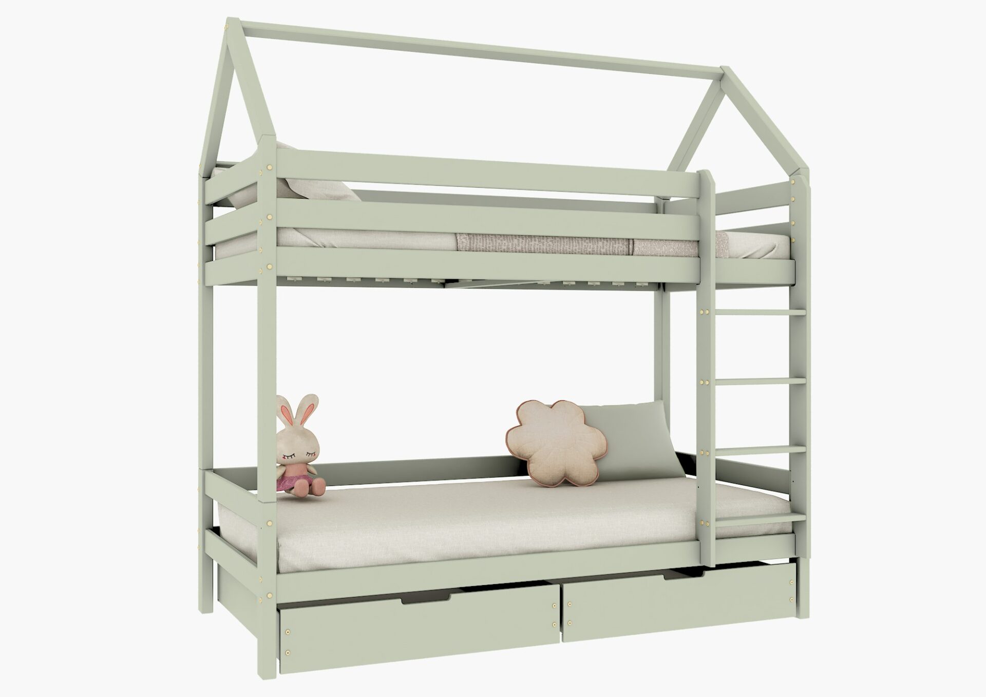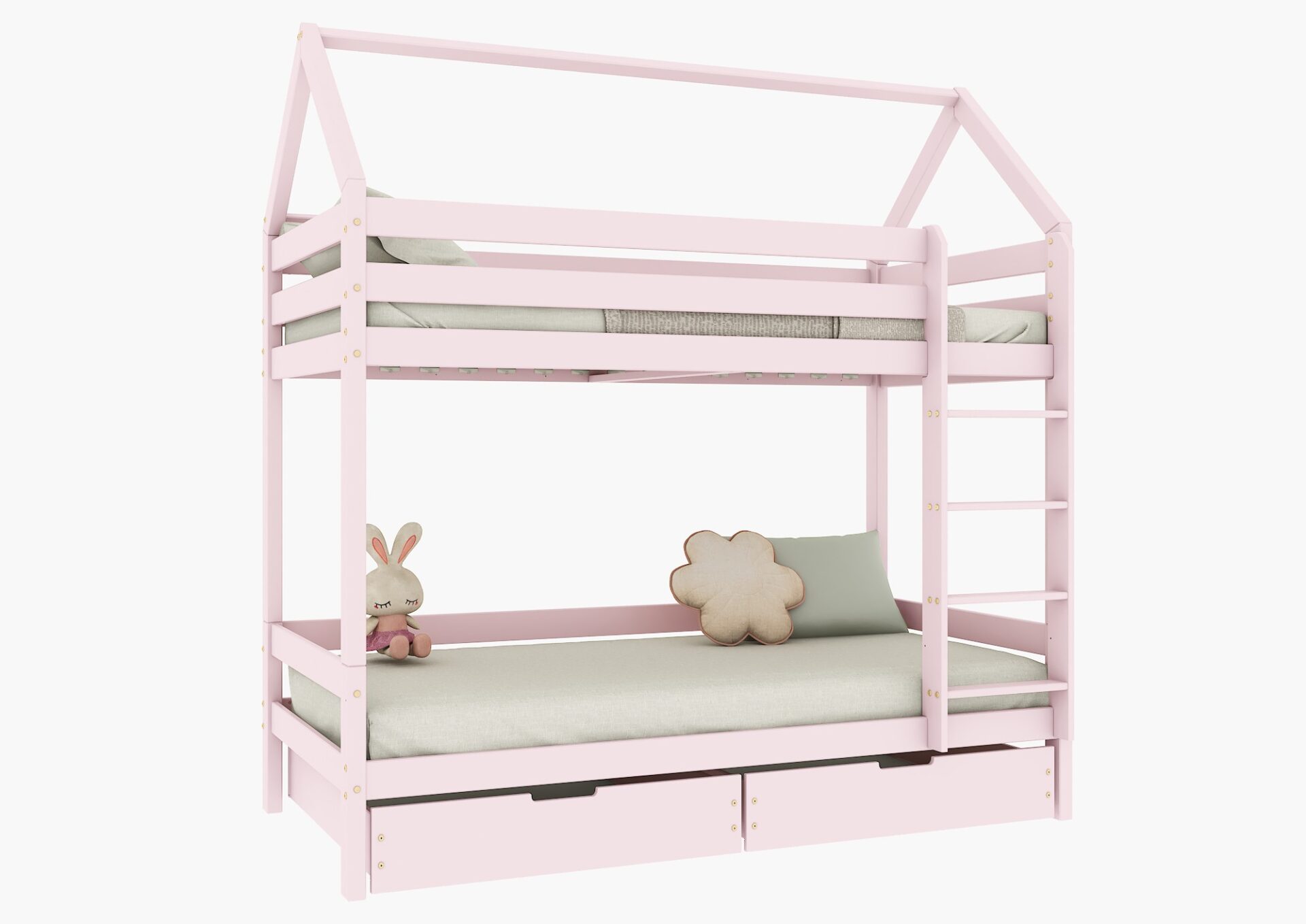 FLO BIS PIĘTROWE drewniane łóżko piętrowe domek z prostymi barierkami i szufladami na pościel