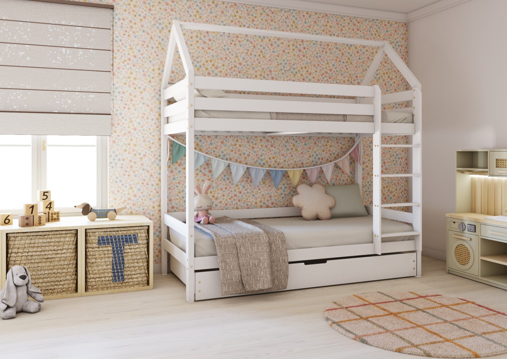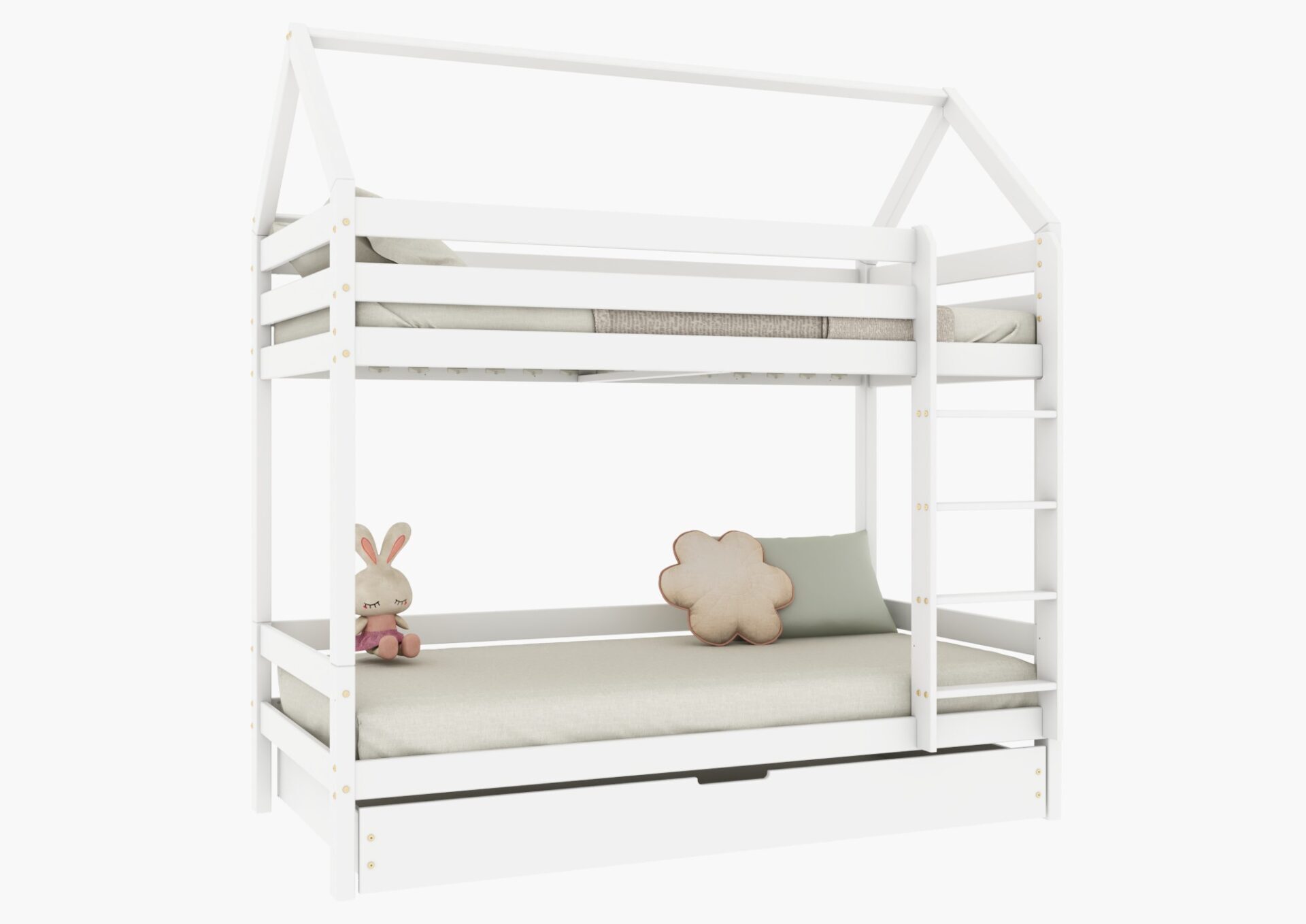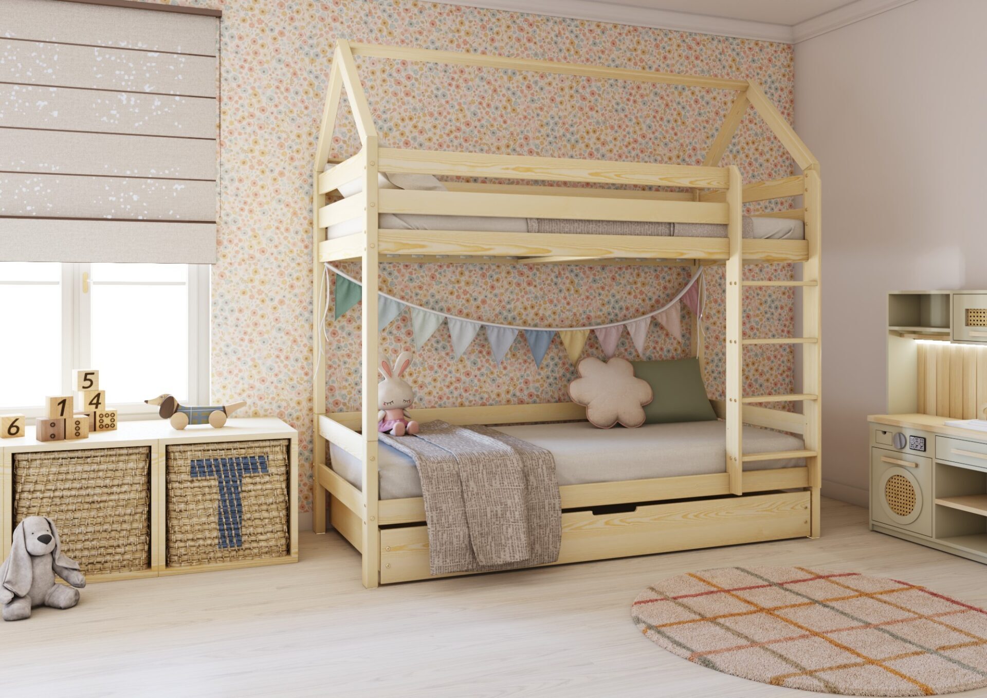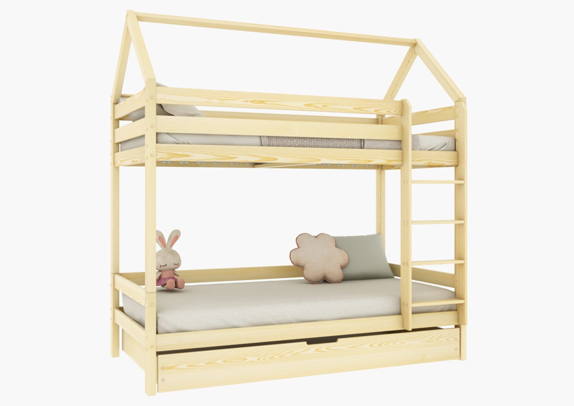 FLORENCE DUO PIĘTROWE – sosnowe łóżko dziecięce piętrowe domek z prostymi barierkami.