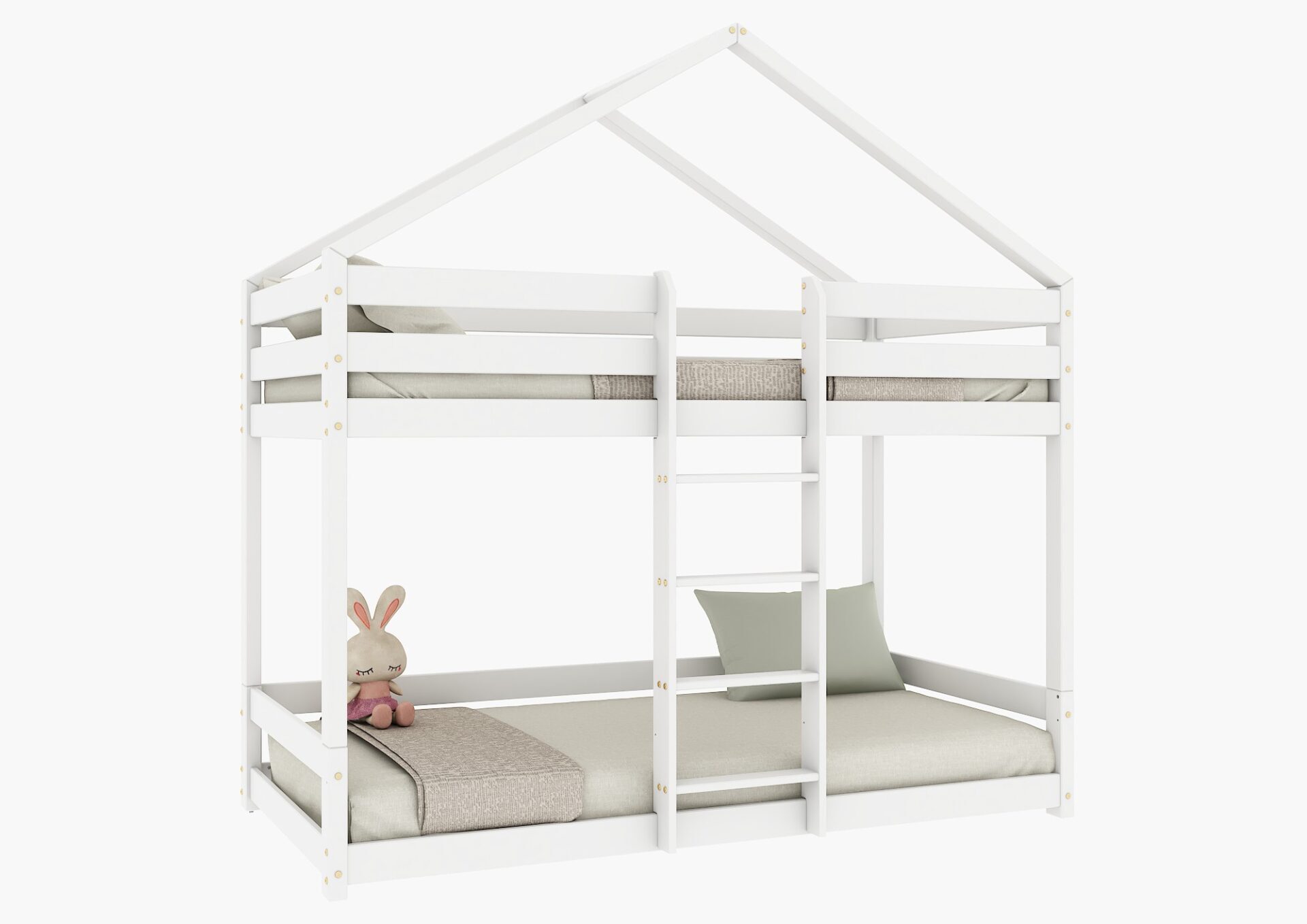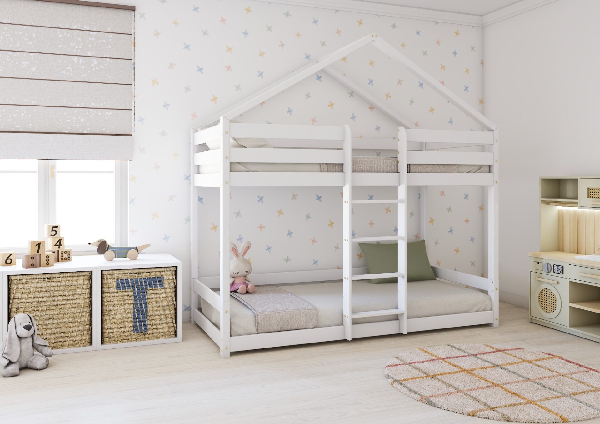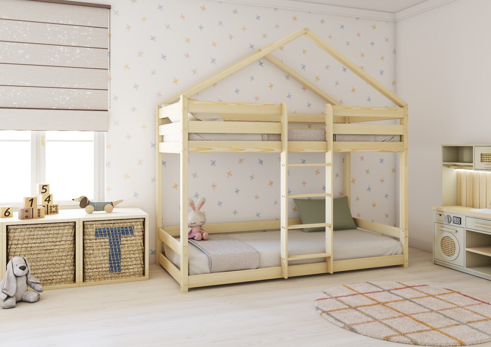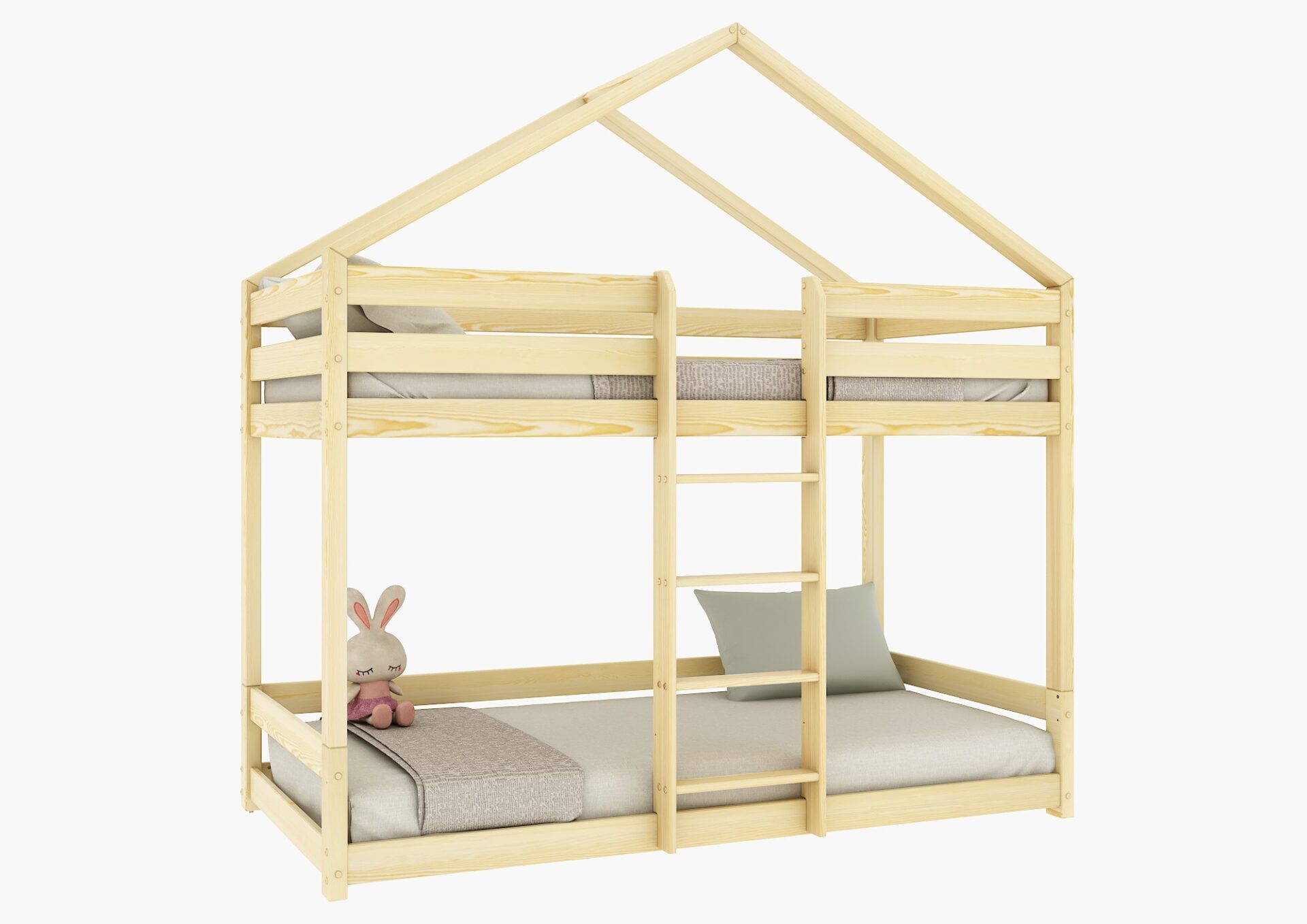 HUFFIE PIĘTROWE – sosnowe łóżko dziecięce domek z poziomymi barierkami