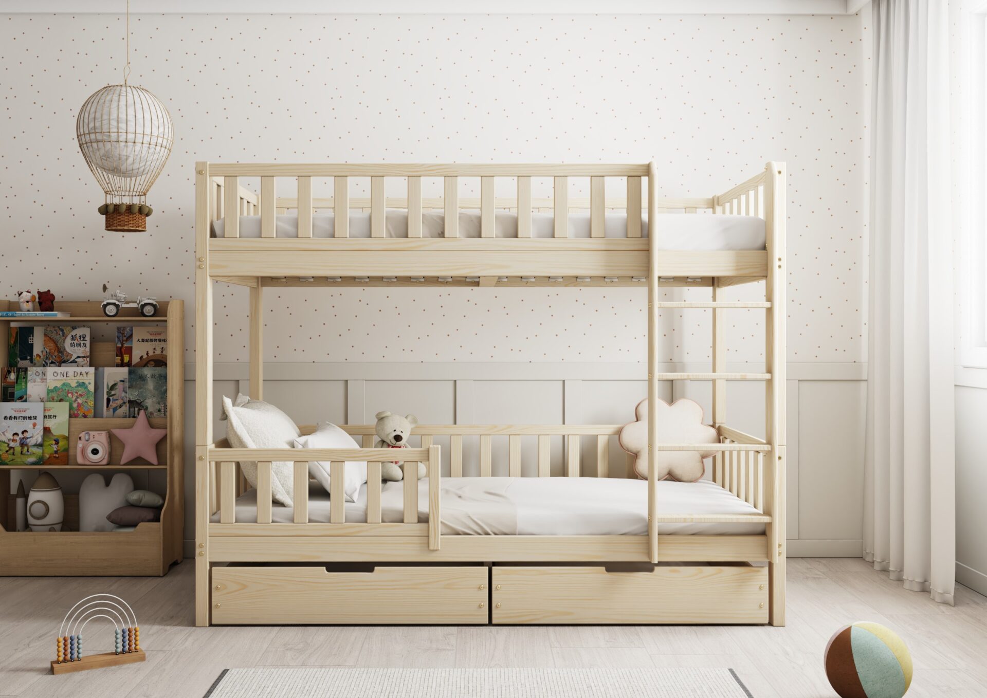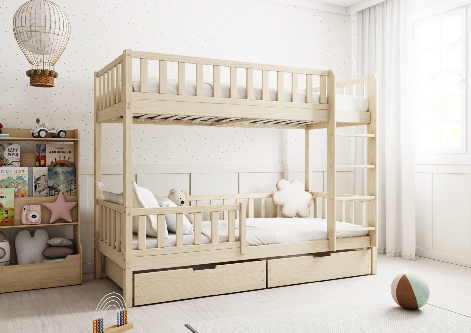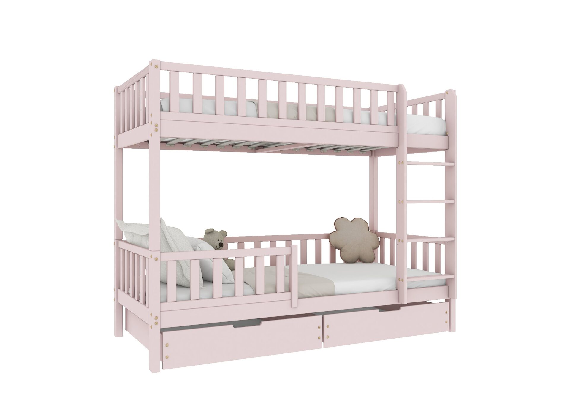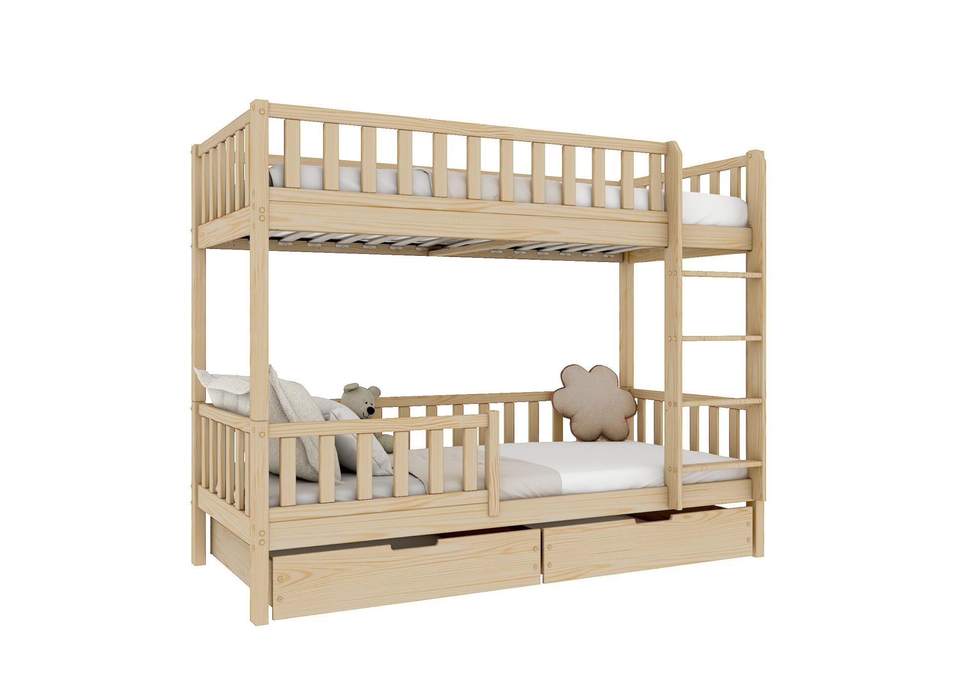 KARO BIS drewniane łóżko piętrowe z barierkami płotek i szufladami na pościel