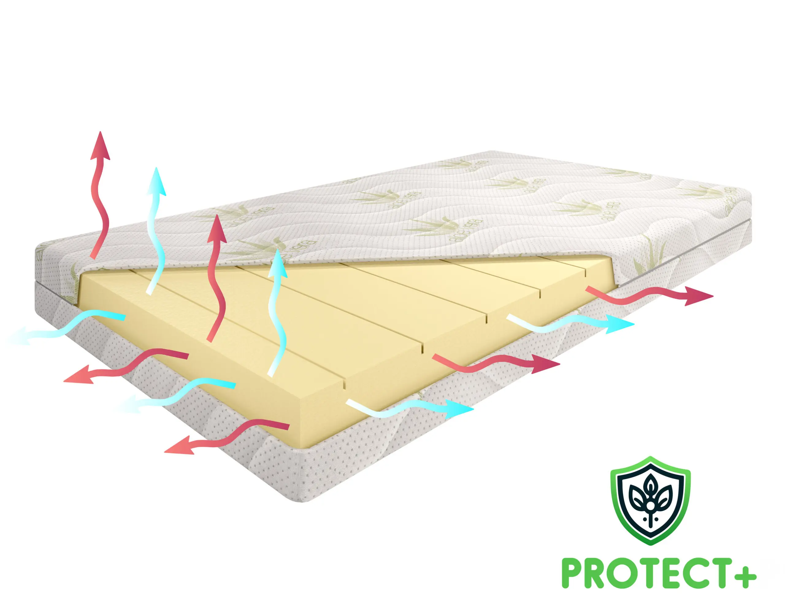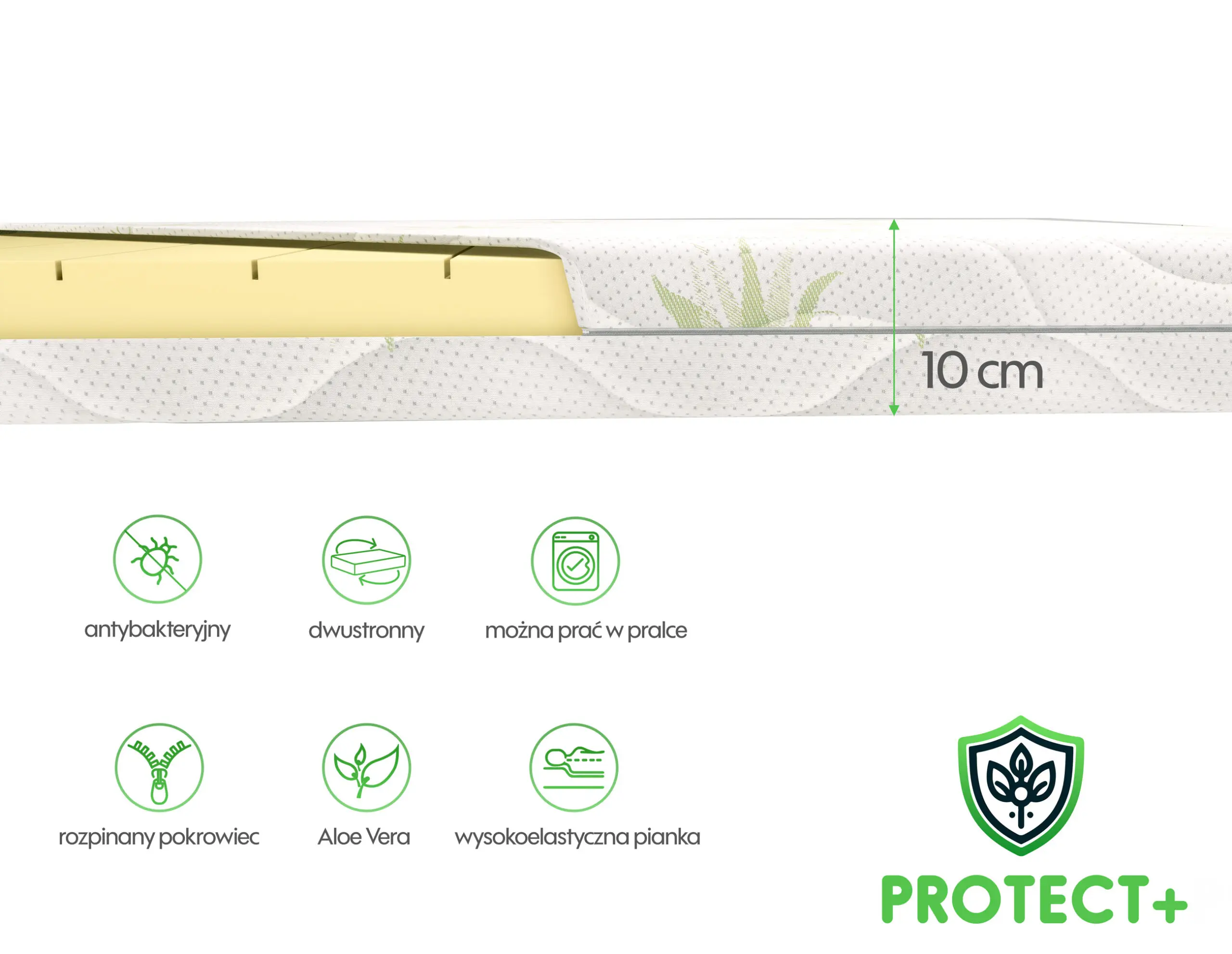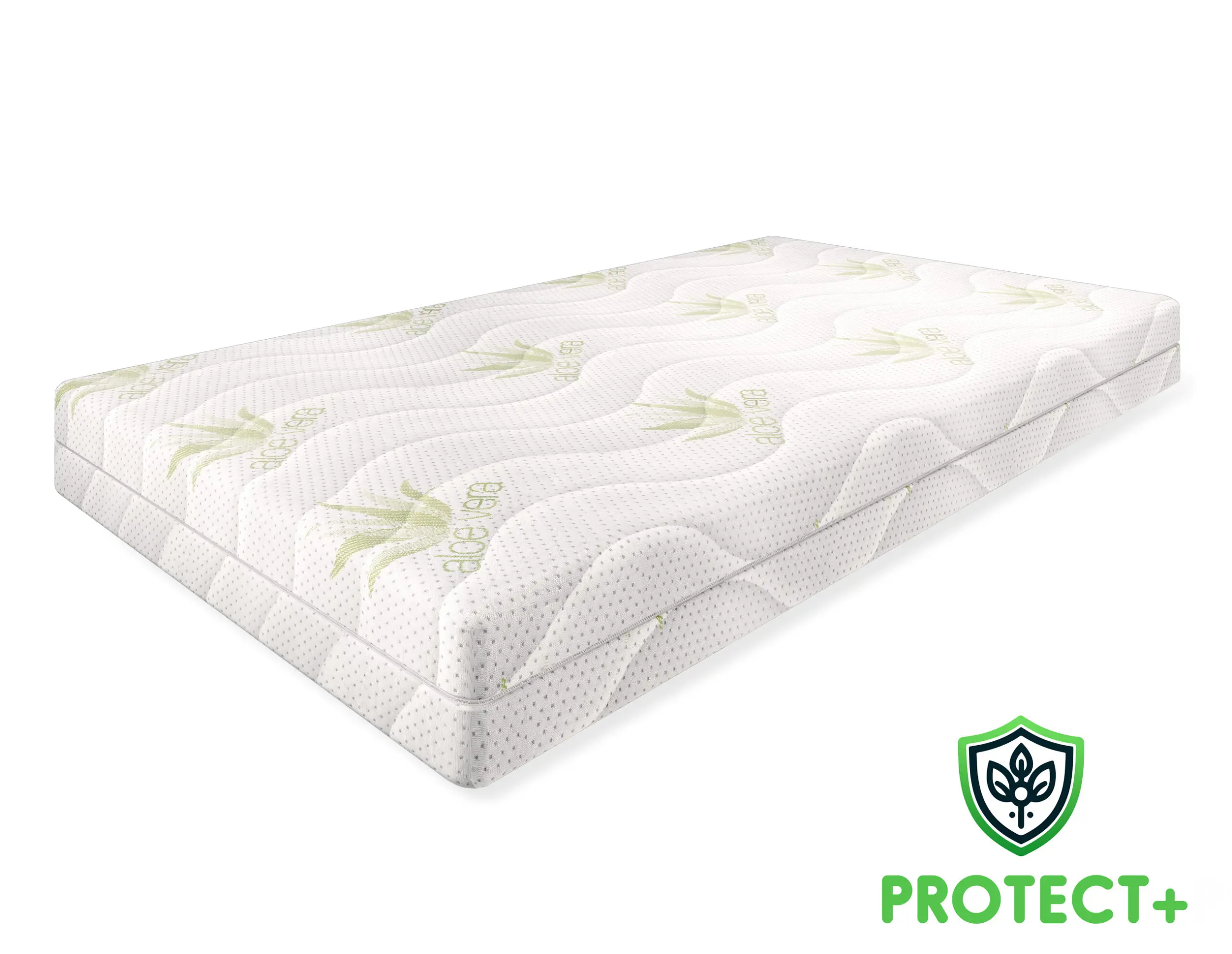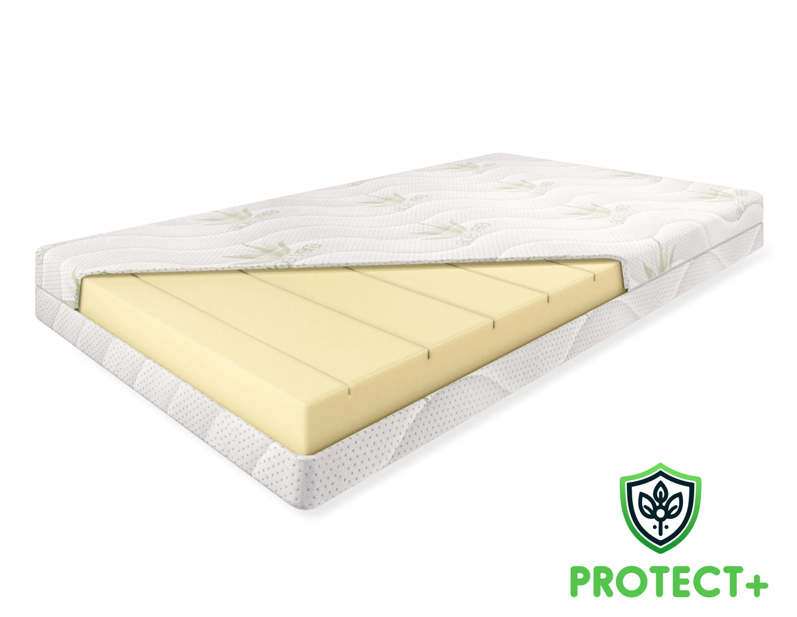 Materac PROTECT+ został wykonany z wysokiej jakości pianki poliuretanowej. Zapewnia optymalną elastyczność oraz trwałość. Materac zachowuje swoje właściwości nawet po wielokrotnych ściśnięciach. Dzięki zastosowaniu zaawansowanej technologii, materac zawsze wraca do swojego pierwotnego kształtu, gwarantując niezmienny komfort przez długi czas użytkowania.