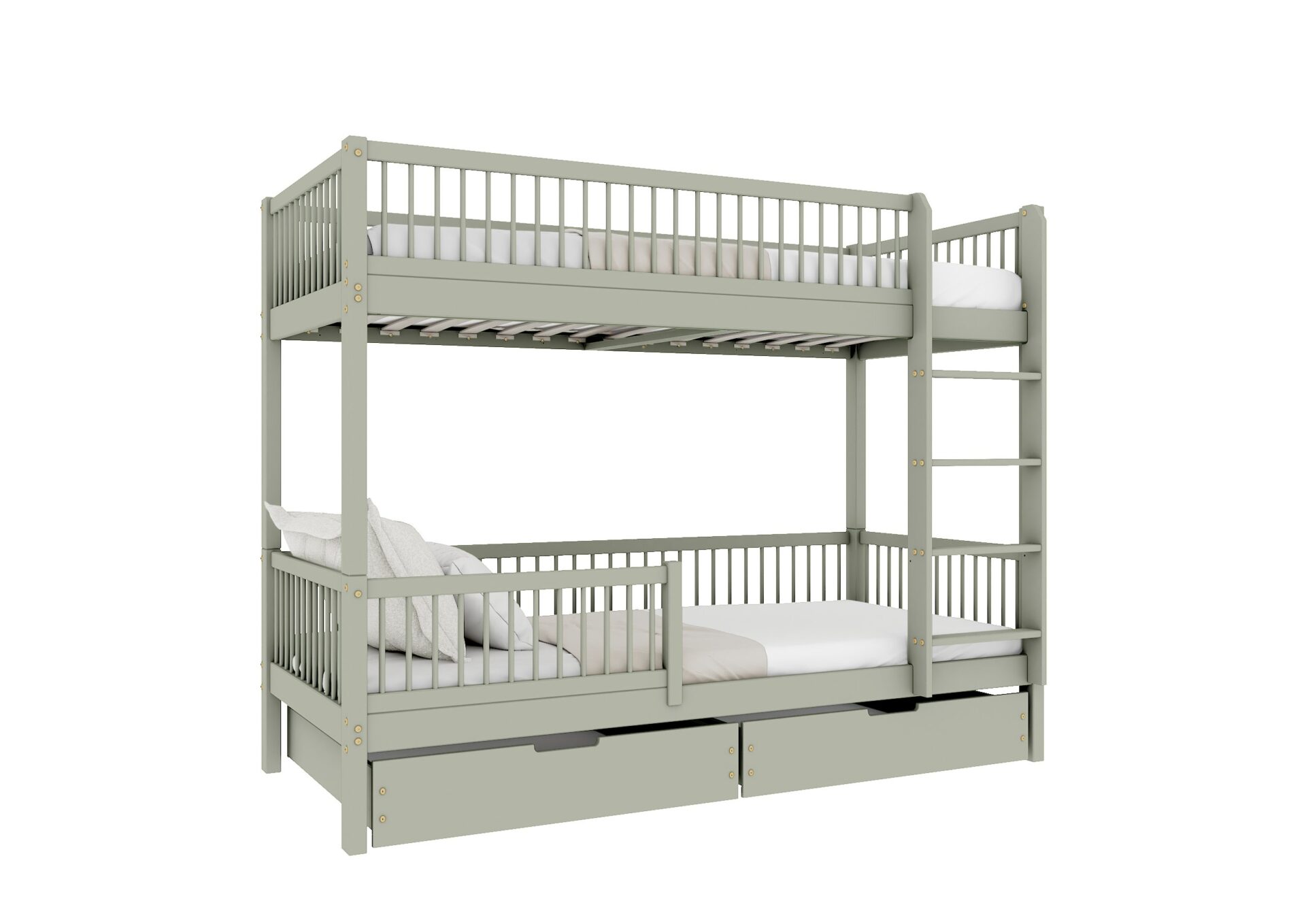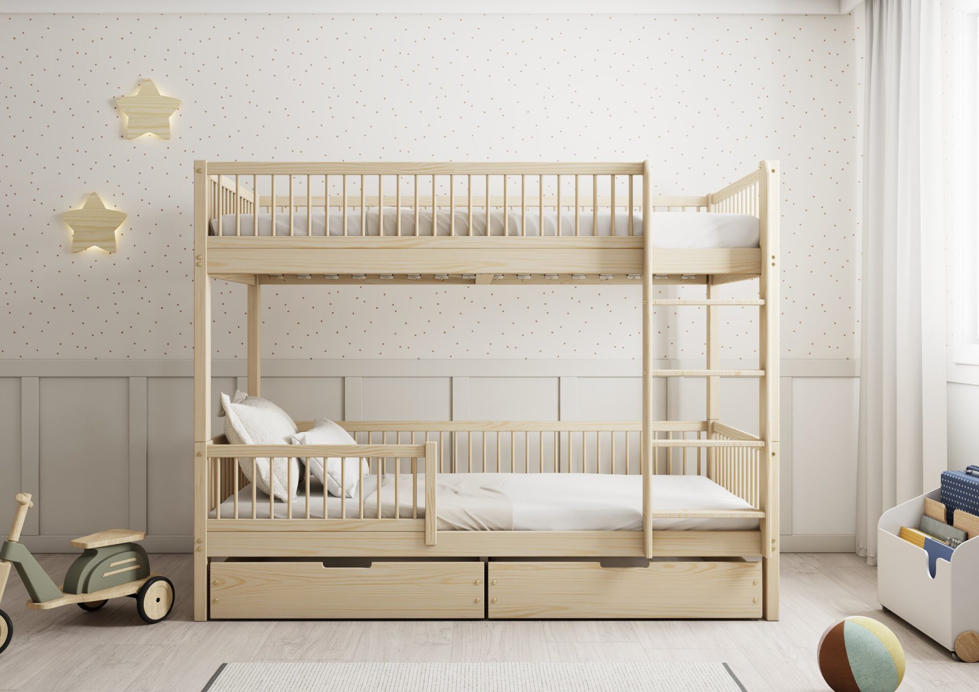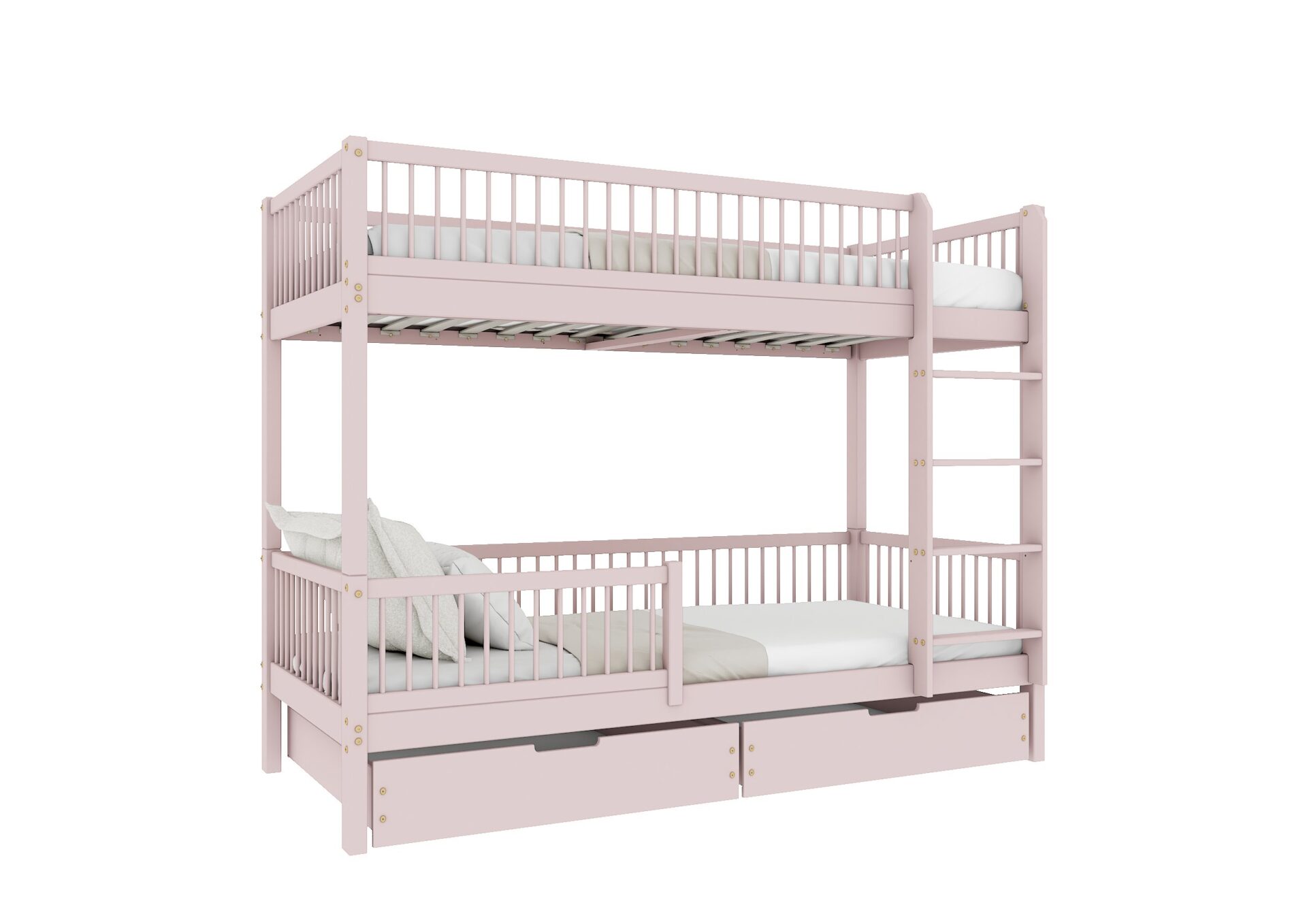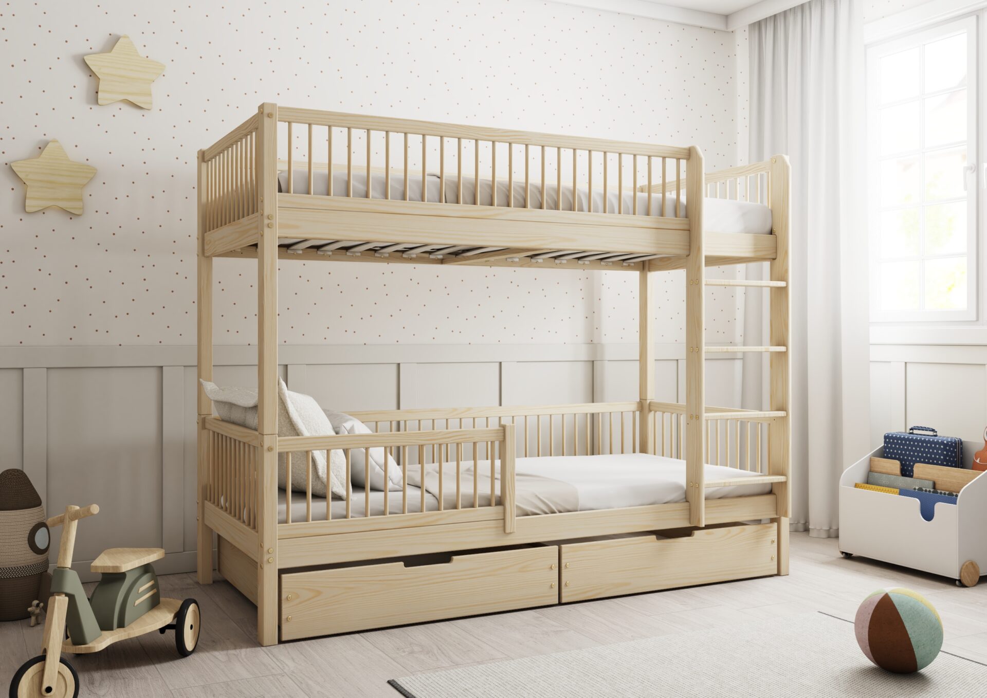 MOLLY BIS drewniane łóżko piętrowe z okrągłymi szczebelkami i szufladami na pościel