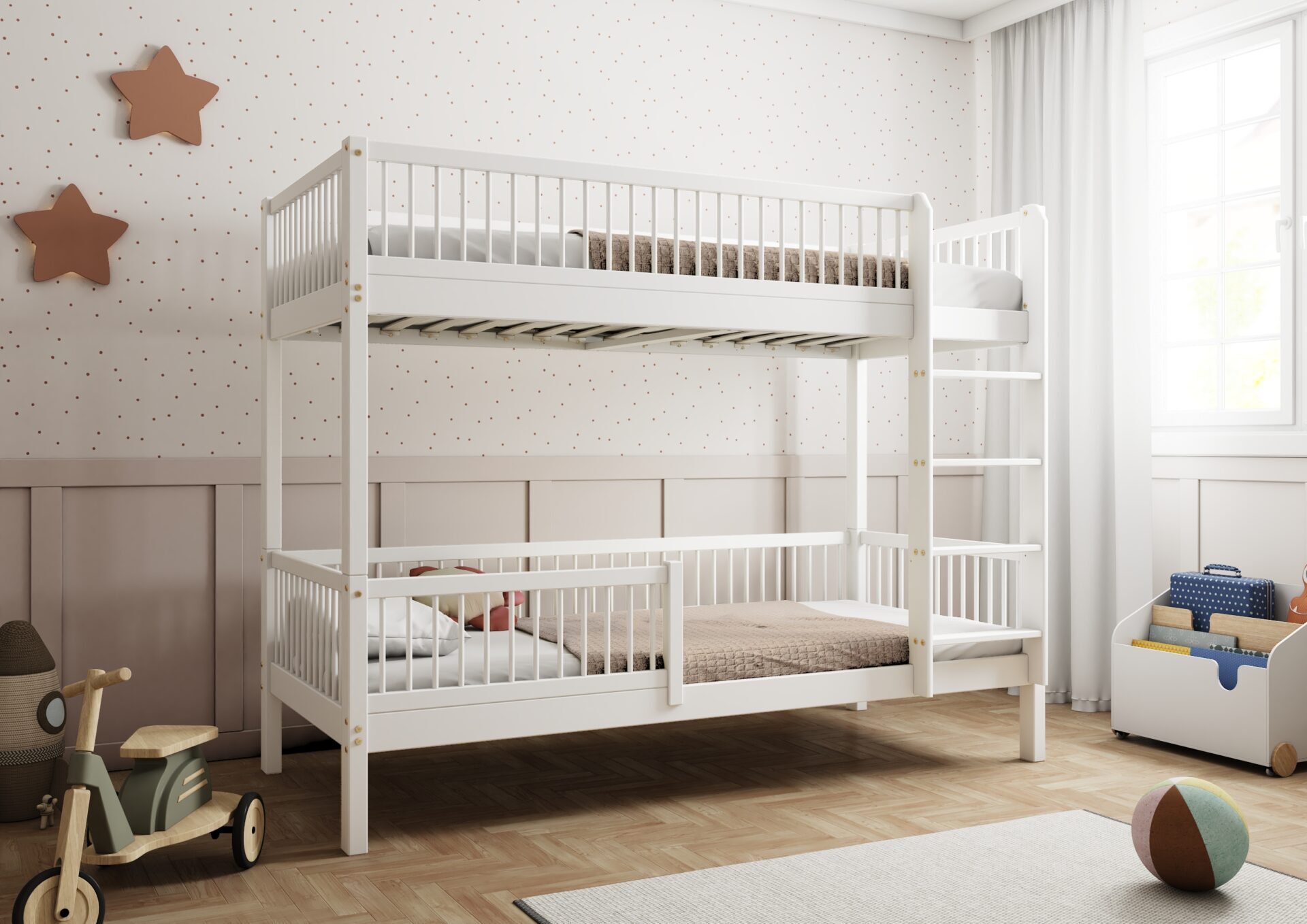 Łóżeczko Molly to doskonała propozycja dla rodziców, którzy cenią bezpieczeństwo, trwałość i estetykę. Barierki z okrągłymi szczebelkami, idealnie pasują zarówno do pokoju chłopca, jak i dziewczynki. Łóżko jest wykonane z naturalnych materiałów, a jego zaokrąglone brzegi zapewniają bezpieczeństwo podczas użytkowania. Dzięki stabilnej konstrukcji wytrzymuje nawet najbardziej aktywne zabawy.