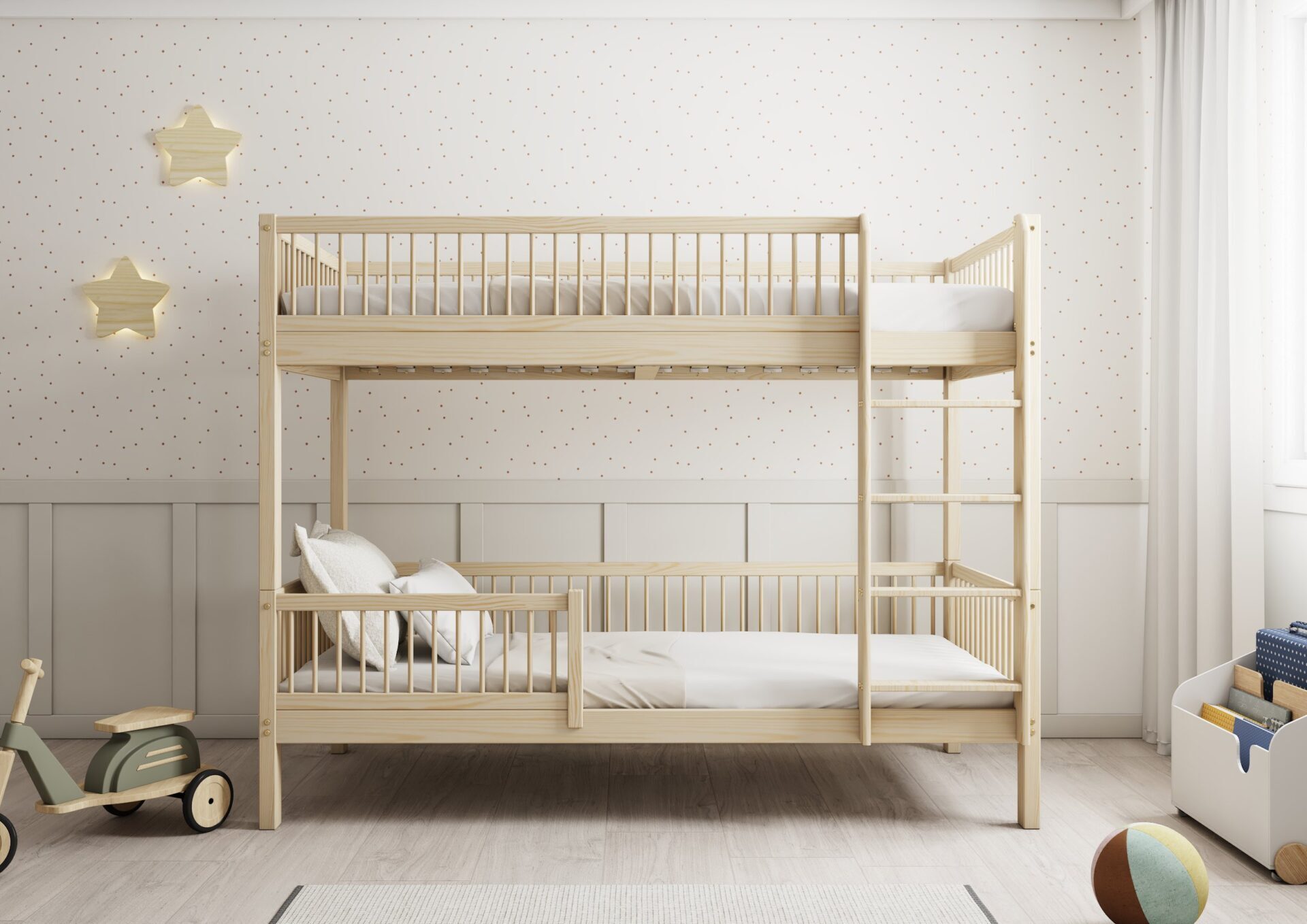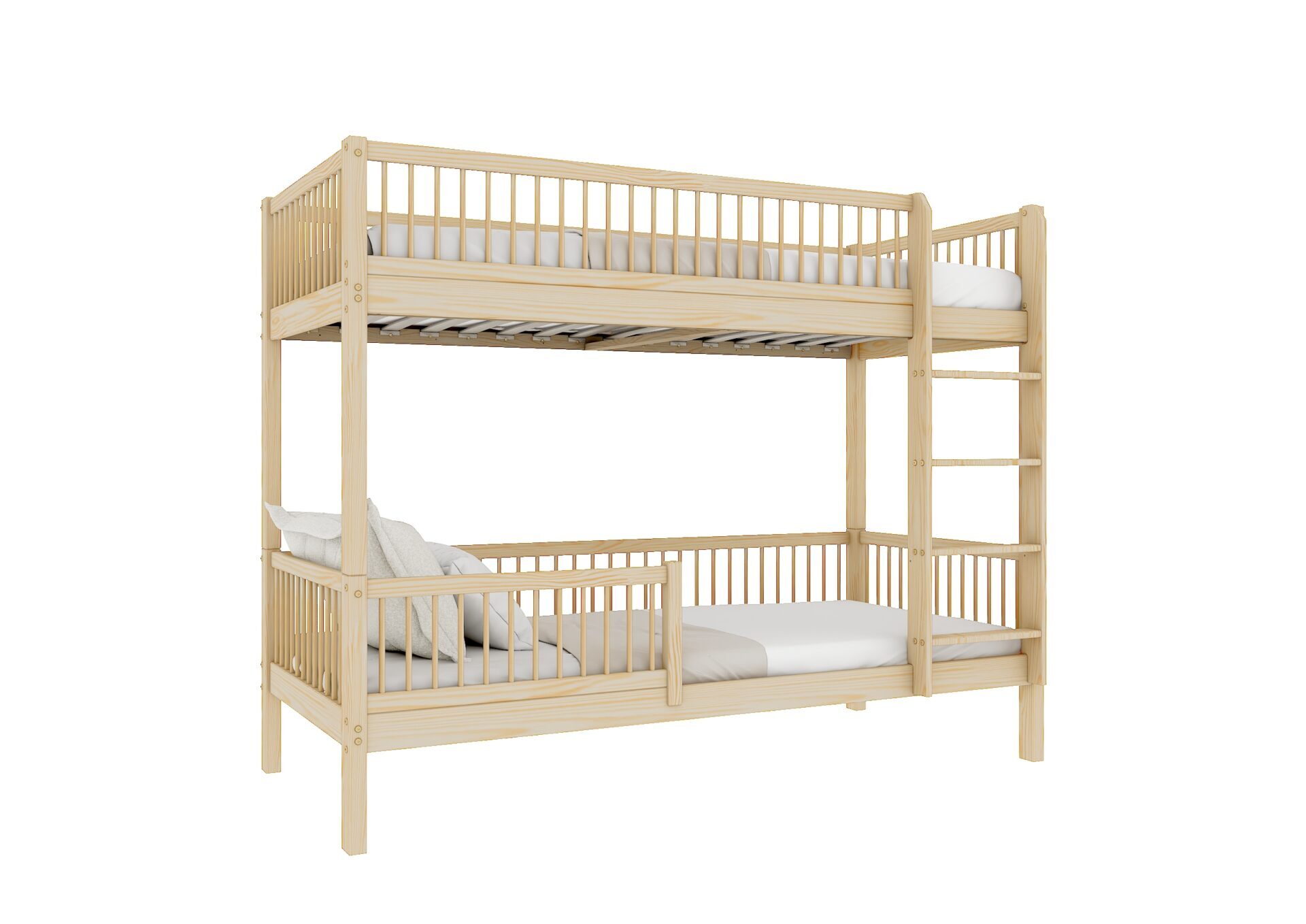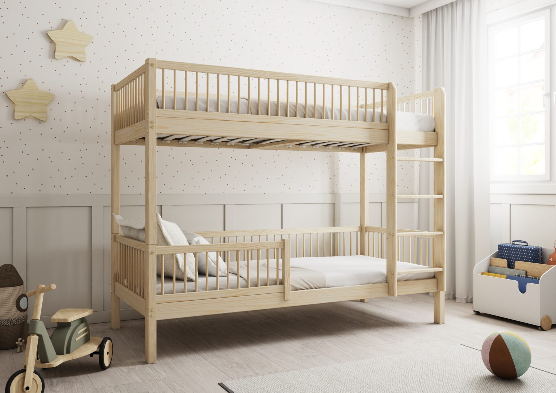 Molly – drewniane łóżko piętrowe z okrągłymi szczebelkami.