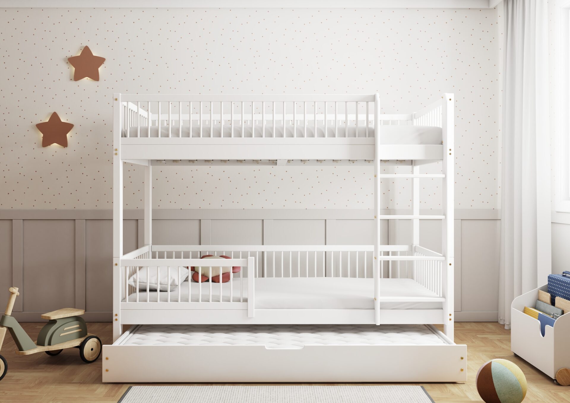Praktyczność: możliwość zamontowania drabinki po lewej lub prawej stronie, pojemne szuflady na pościel.
