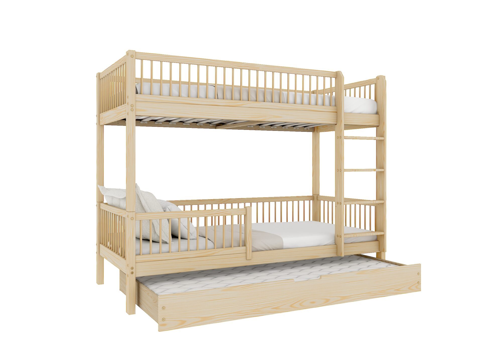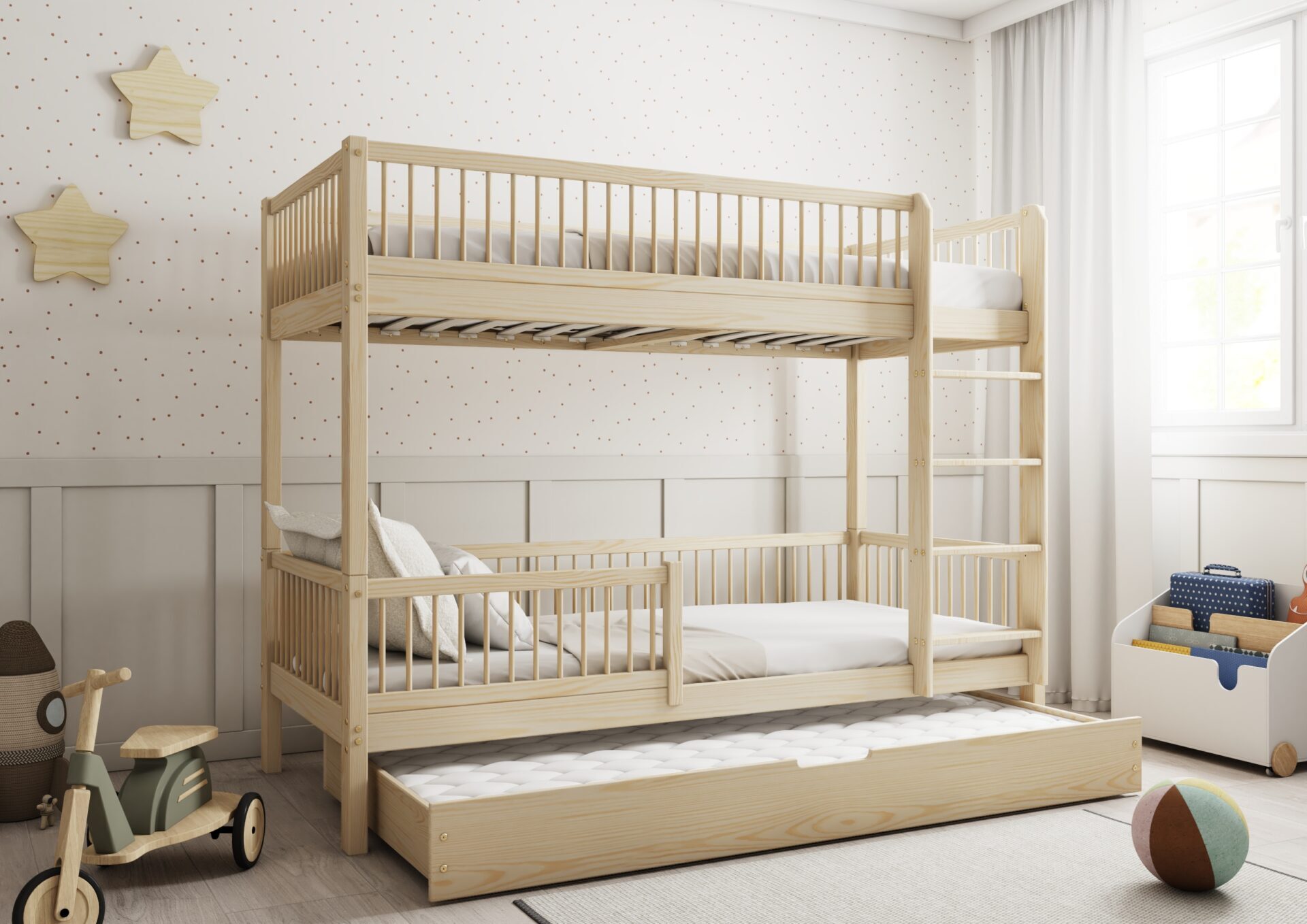 Molly DUO– drewniane łóżko piętrowe z okrągłymi szczebelkami.