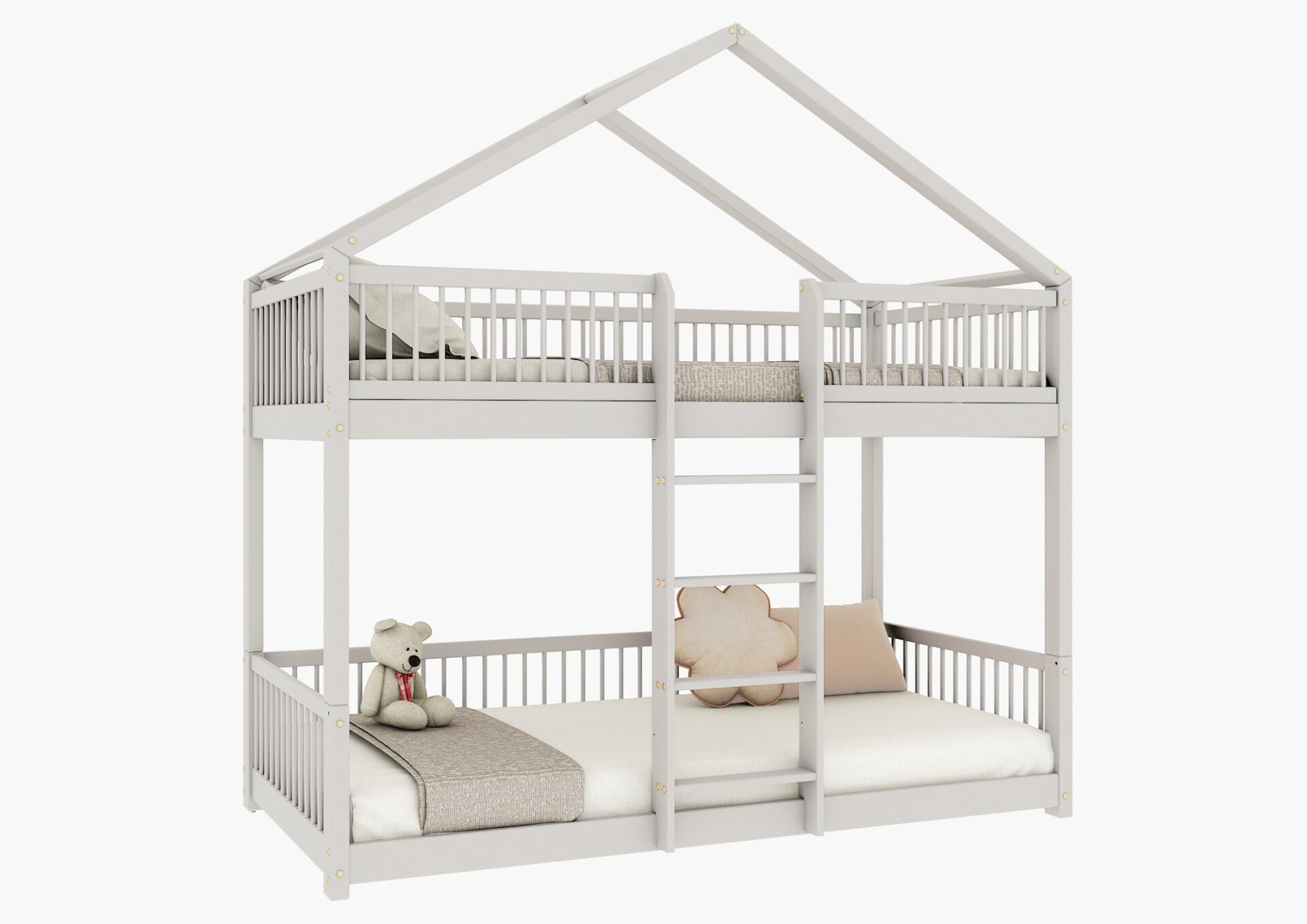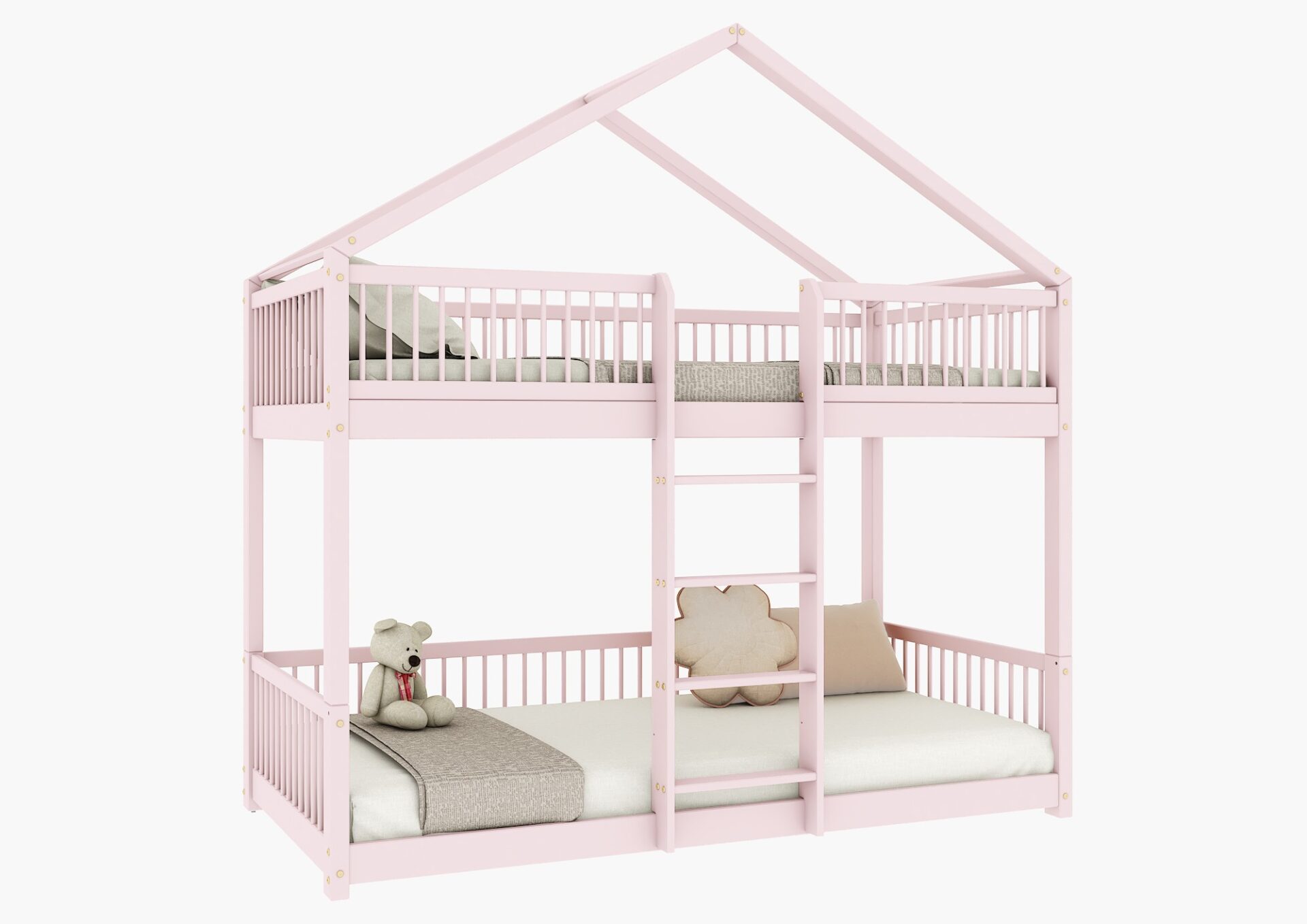 MUSA PIĘTROWA drewniane łóżko piętrowe domek z okrągłymi szczebelkami na niskich nogach