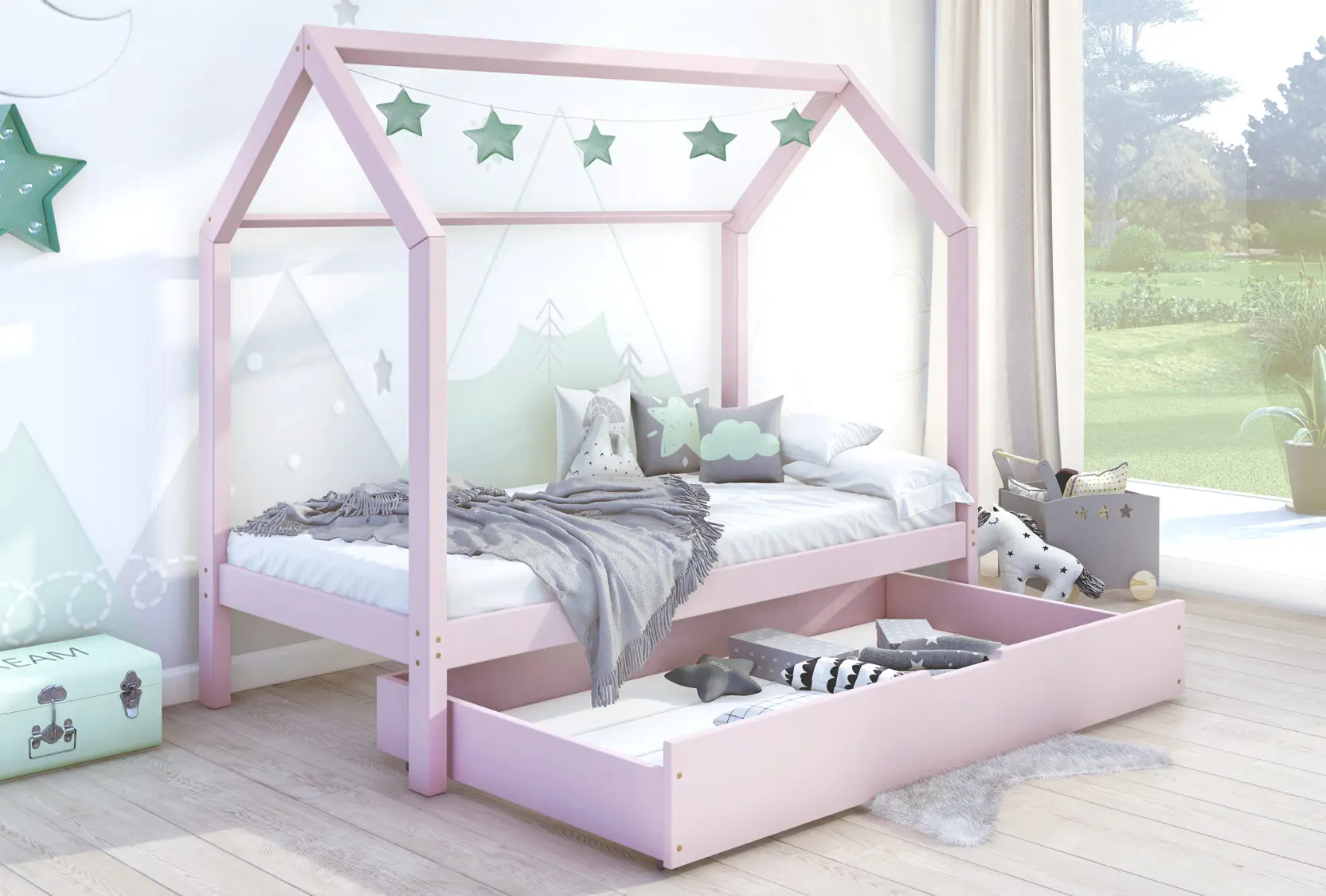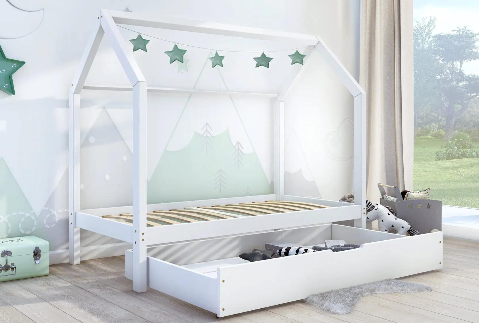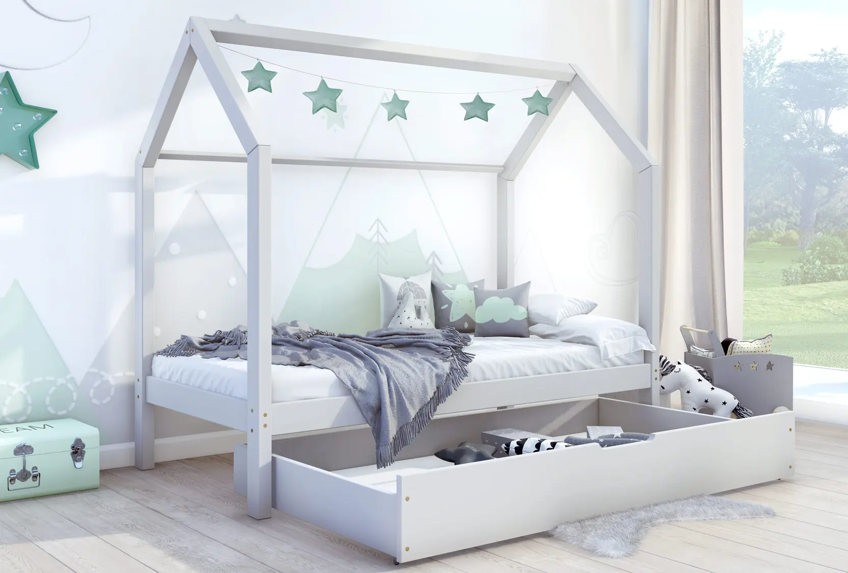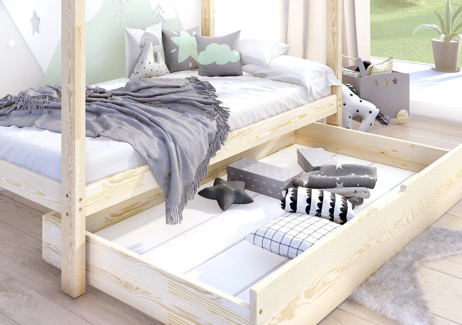 Podstawowa cena obejmuje ramę łóżeczka domek Nala Bis z nóżkami 23 cm oraz stelażem z listew sprężynujących i szufladą. Mebel do samodzielnego złożenia. W paczkach znajdą Państwo przejrzystą instrukcję oraz niezbędne elementy montażowe.