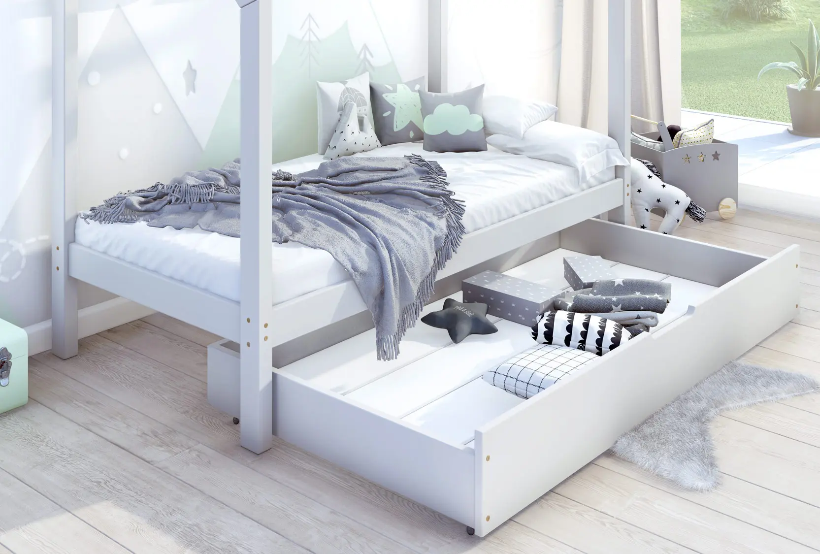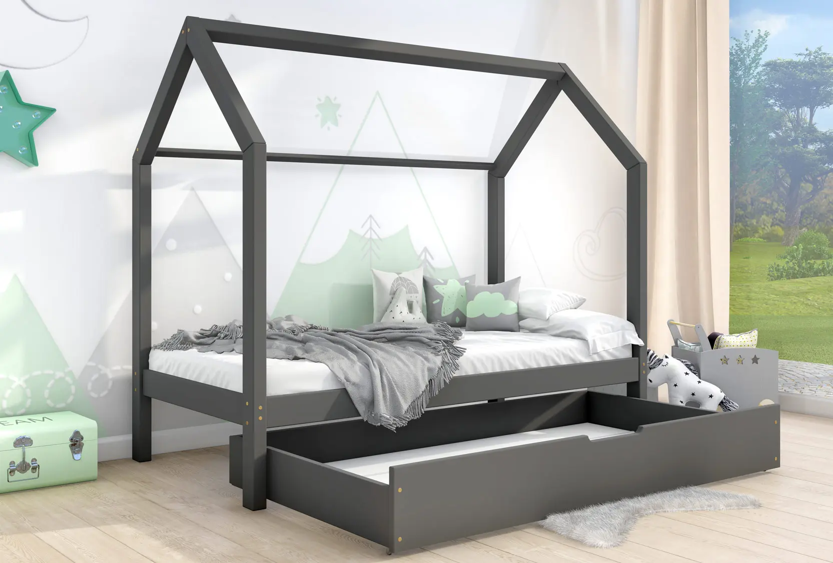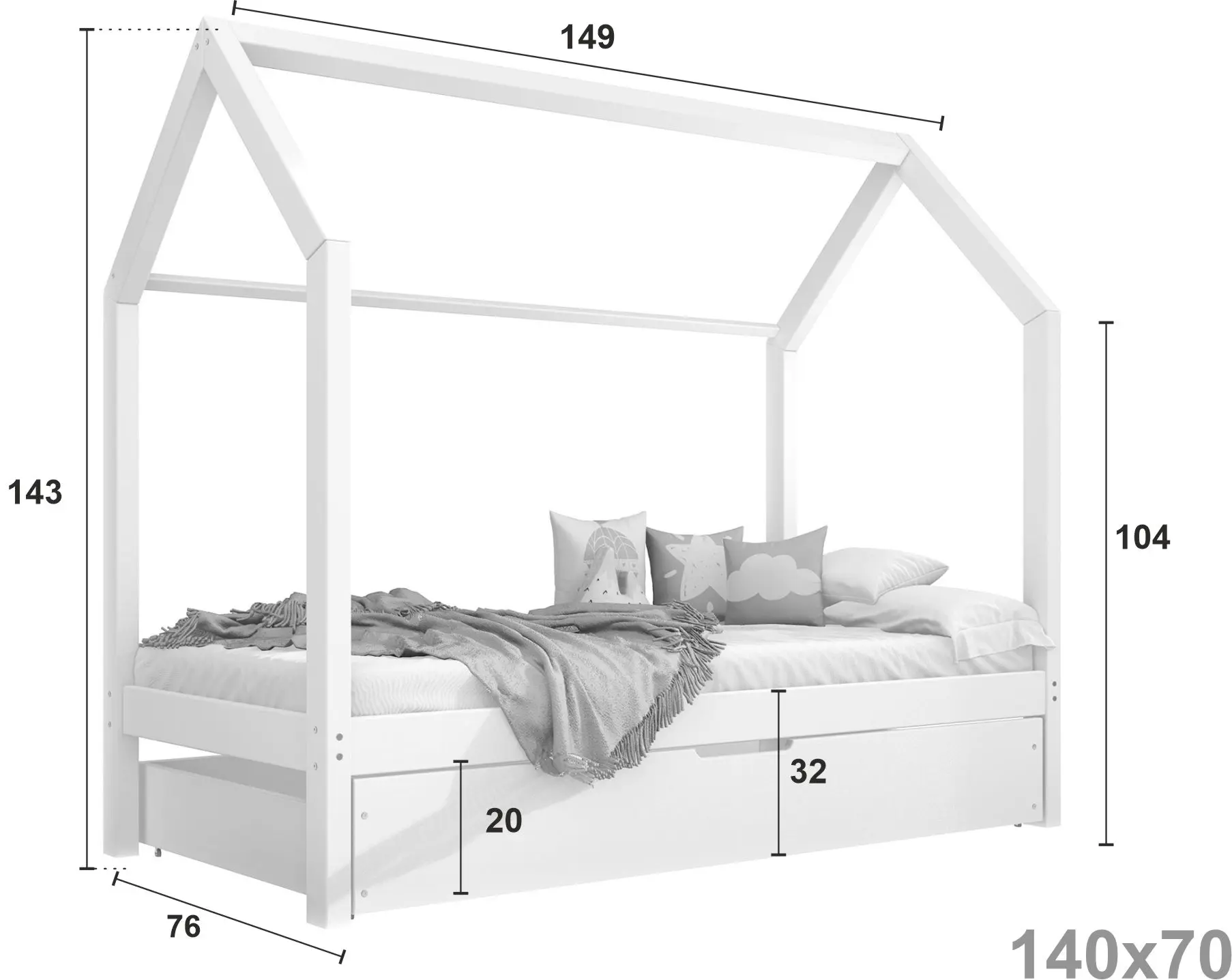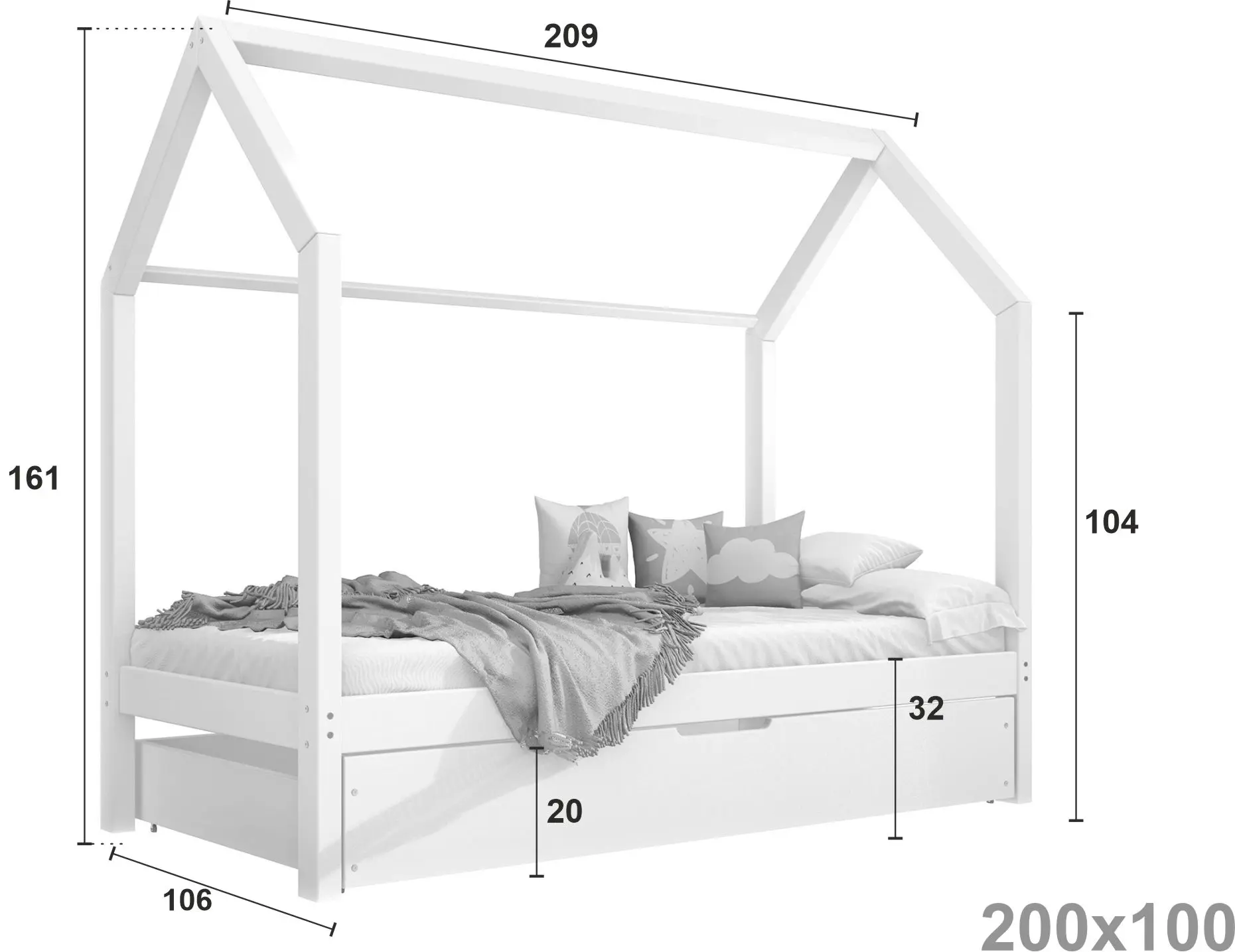 Podstawowa cena obejmuje ramę łóżeczka domek Nala Bis z nóżkami 23 cm oraz stelażem z listew sprężynujących i szufladą. Mebel do samodzielnego złożenia. W paczkach znajdą Państwo przejrzystą instrukcję oraz niezbędne elementy montażowe.