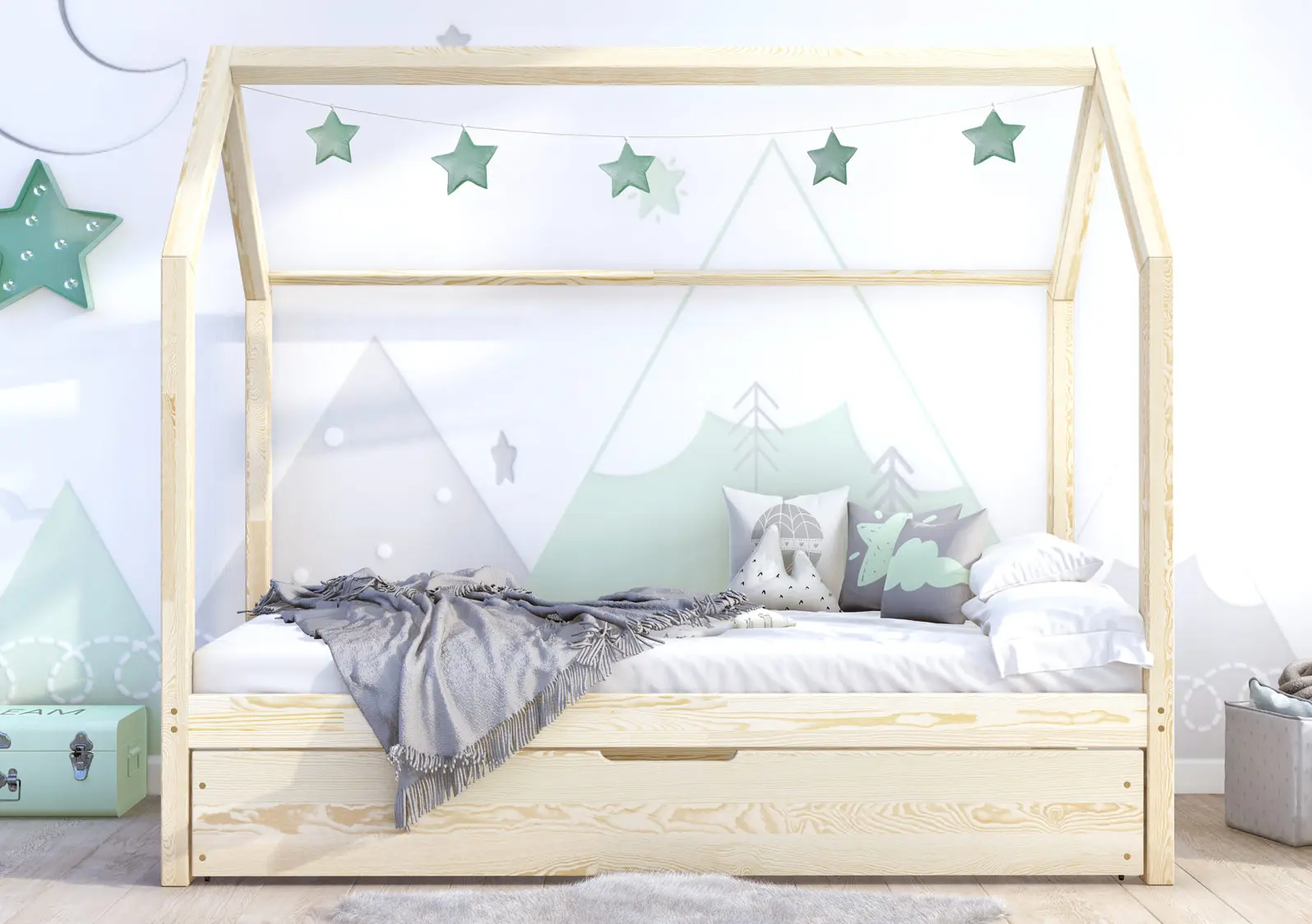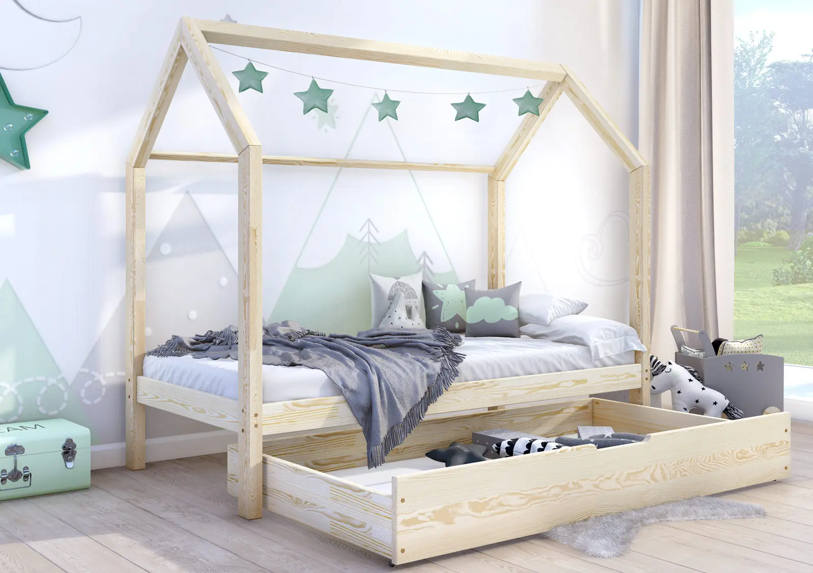 Klasyczne łóżko domek od lat zachwyca swoją prostą konstrukcją oraz skandynawskim designem. Geometryczne kształty ramy przypominają szkielet domku bez ścian. Nala Bis wyróżnia się na tle innych popularnych mebli do snu dla dzieci wysoką jakością wykonania z dbałością o każdy szczegół oraz ekologicznymi materiałami. W produkcji użyty wyłącznie drewna naturalnego sosnowego o warstwowym klejeniu, co zapewnia wysoką wytrzymałość. Gładko wyszlifowane rama łóżka jest wolna od niedoskonałości, które mogą powodować urazy, zadrapania w postaci drzazg czy obtarć. Otwarta budowa modelu zapewnia swobodę z korzystania.