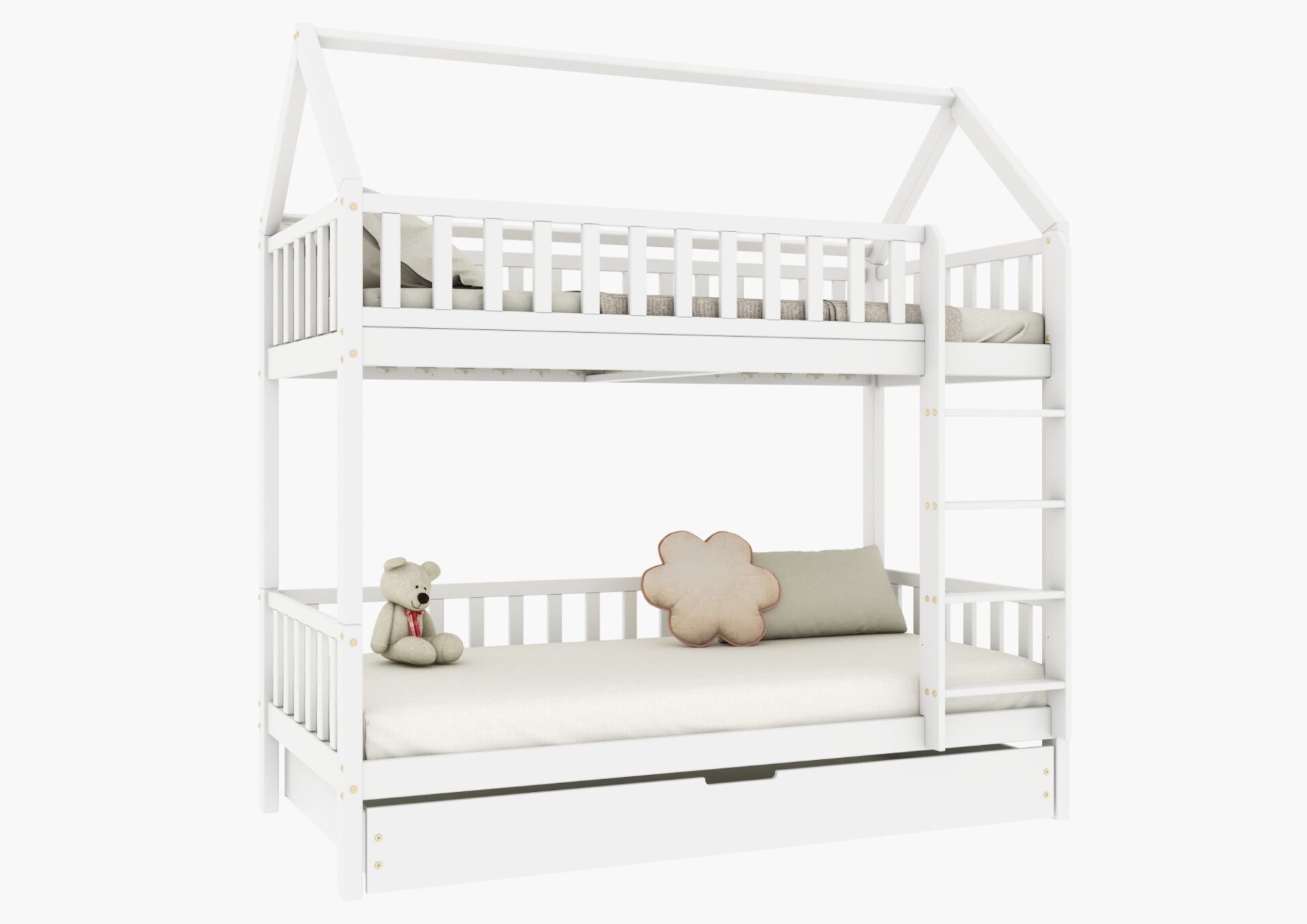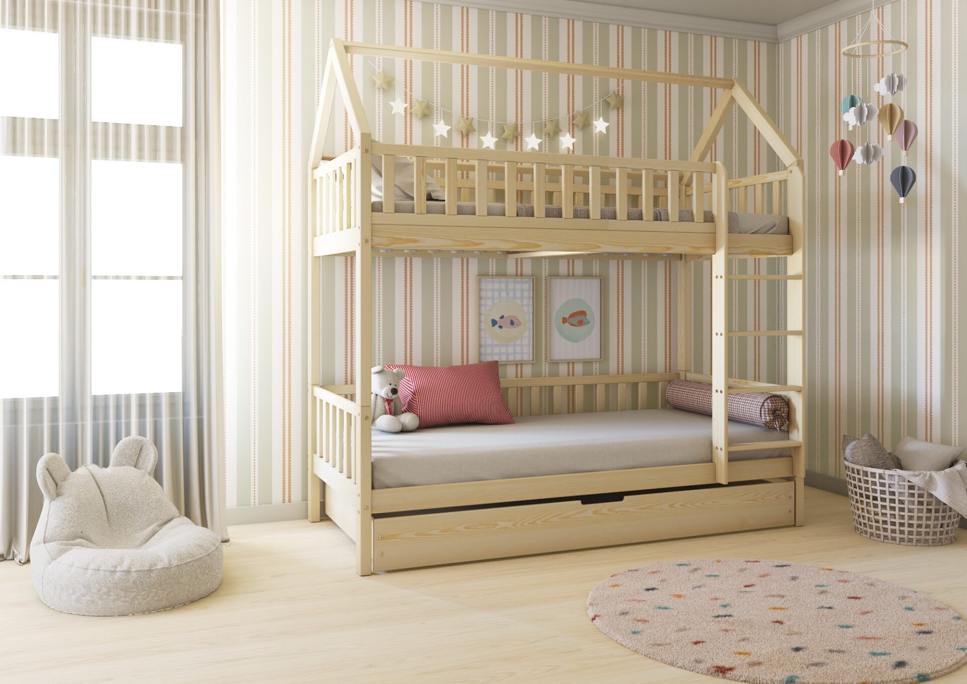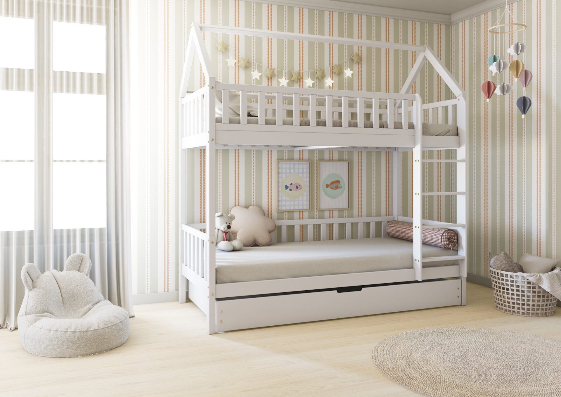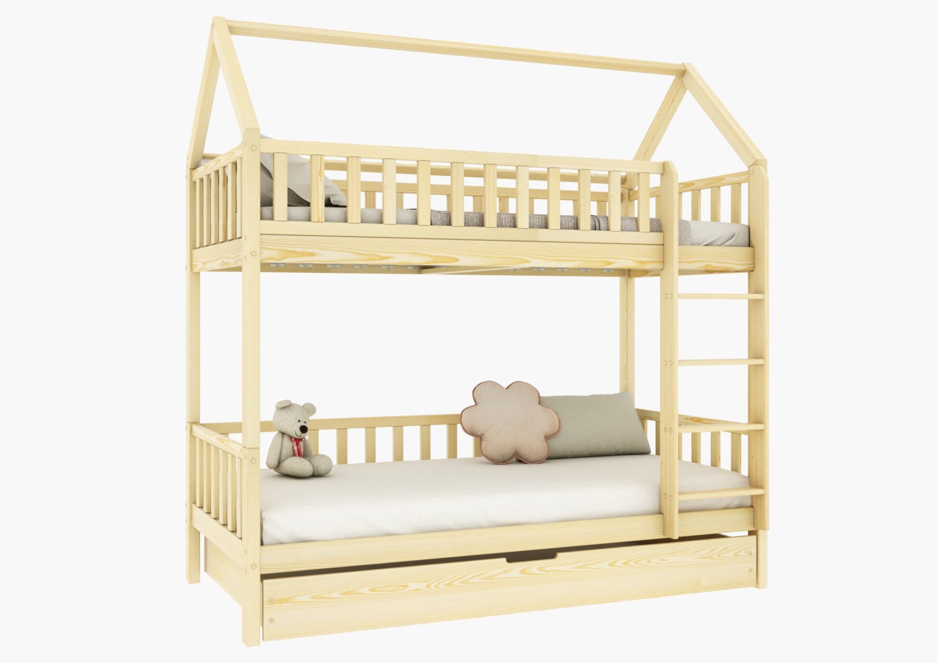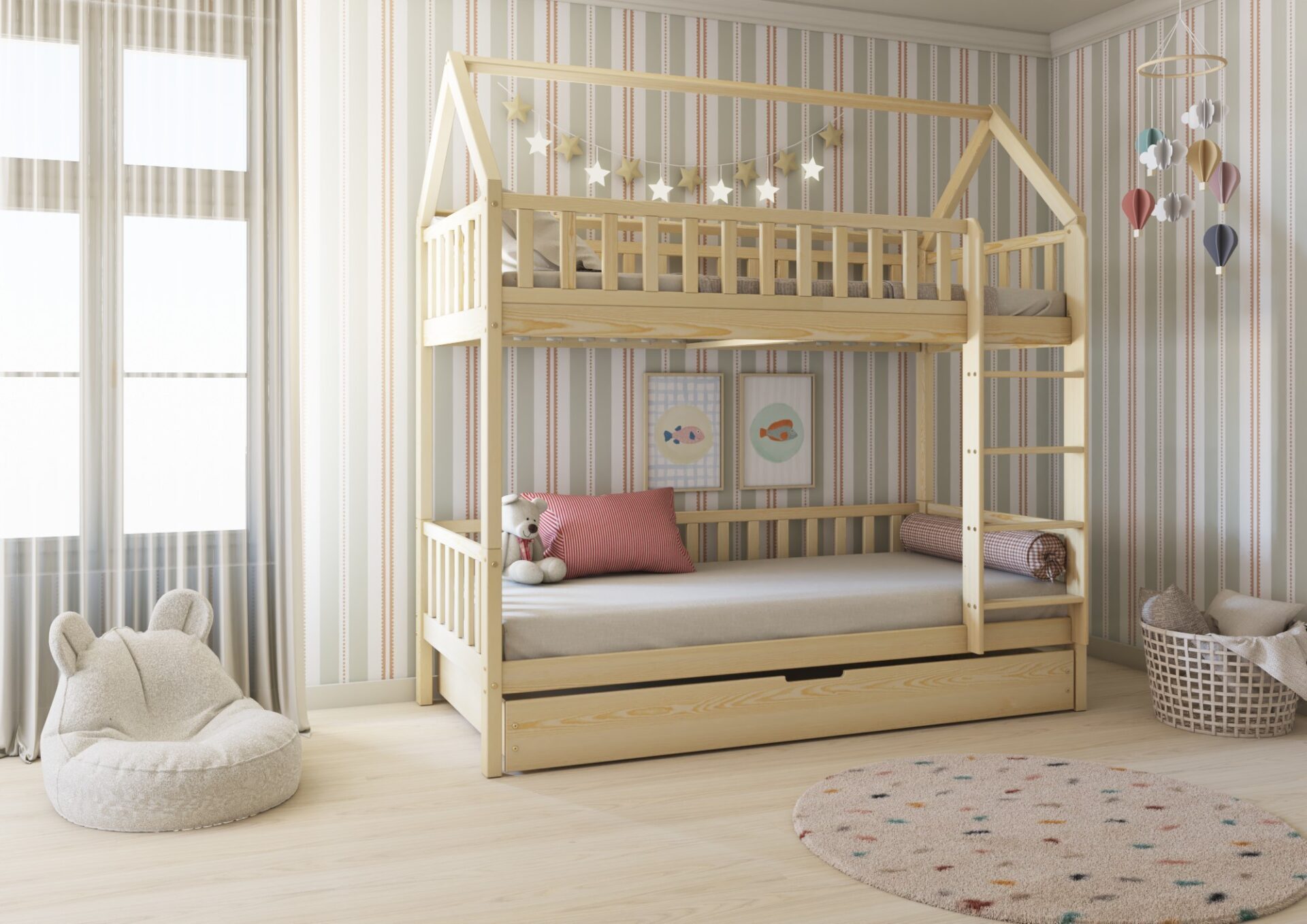 POLLIE DUO PIĘTROWE – drewniane łóżko piętrowe domek z barierkami płotek.