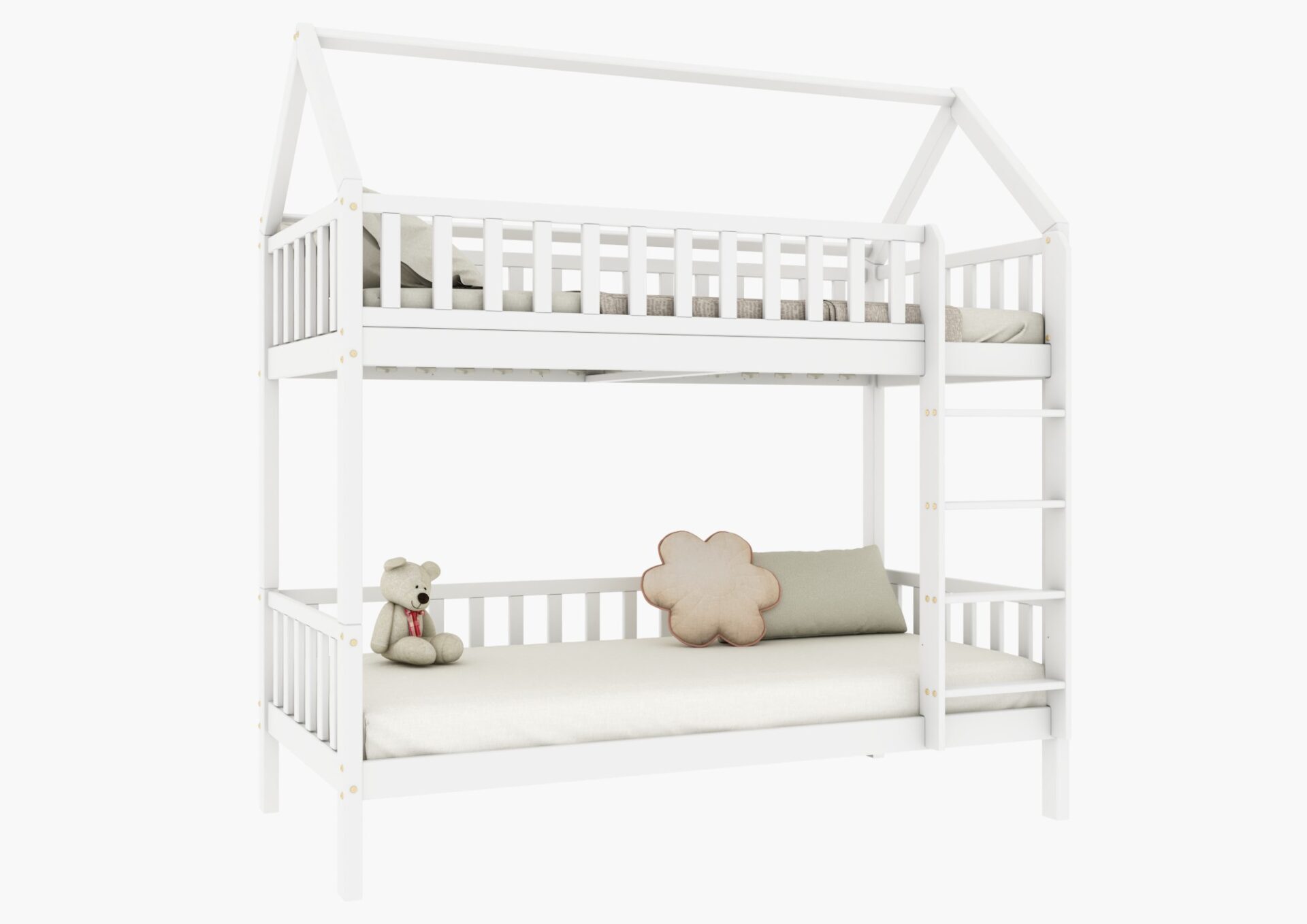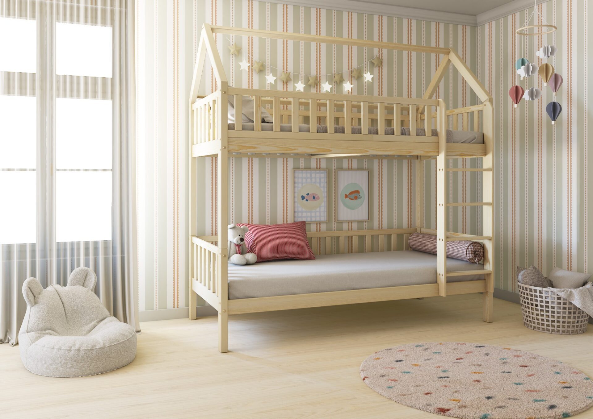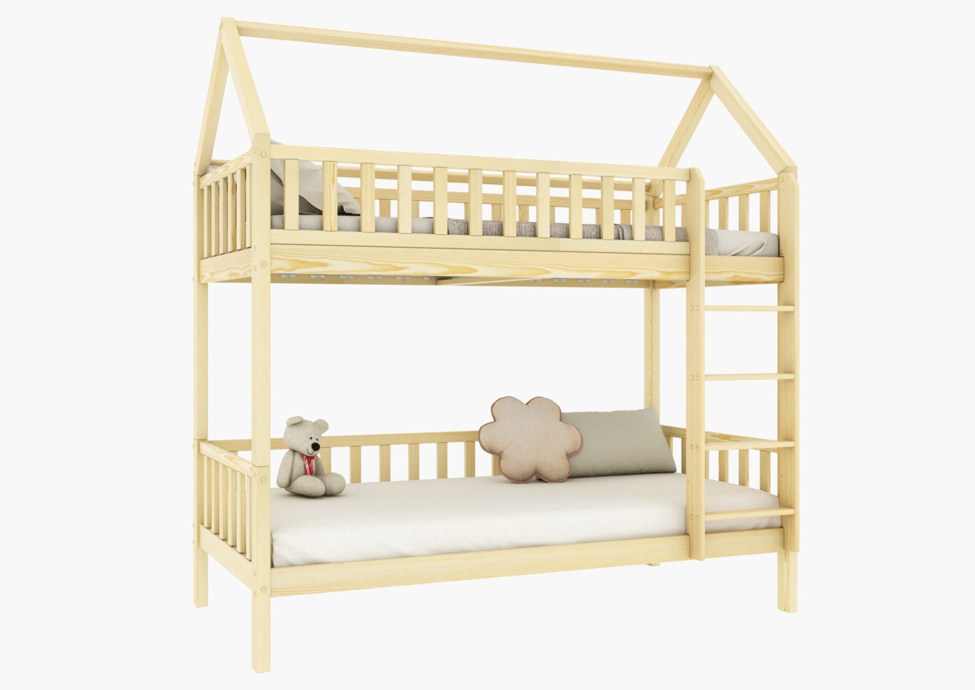 Łóżeczko POLLIE PIĘTROWE to minimalistyczny i nowoczesny mebel, który zachwyci zarówno dzieci, jak i rodziców. Dzięki dachowi w kształcie stodoły łóżko staje się nie tylko miejscem do spania, ale także kreatywną przestrzenią do zabawy. Wysokiej jakości drewno sosnowe, ekologiczne farby oraz zaokrąglone brzegi dbają o bezpieczeństwo Twojego dziecka.