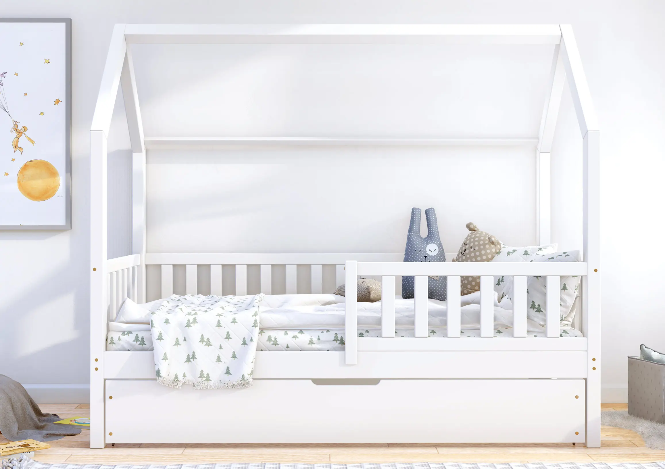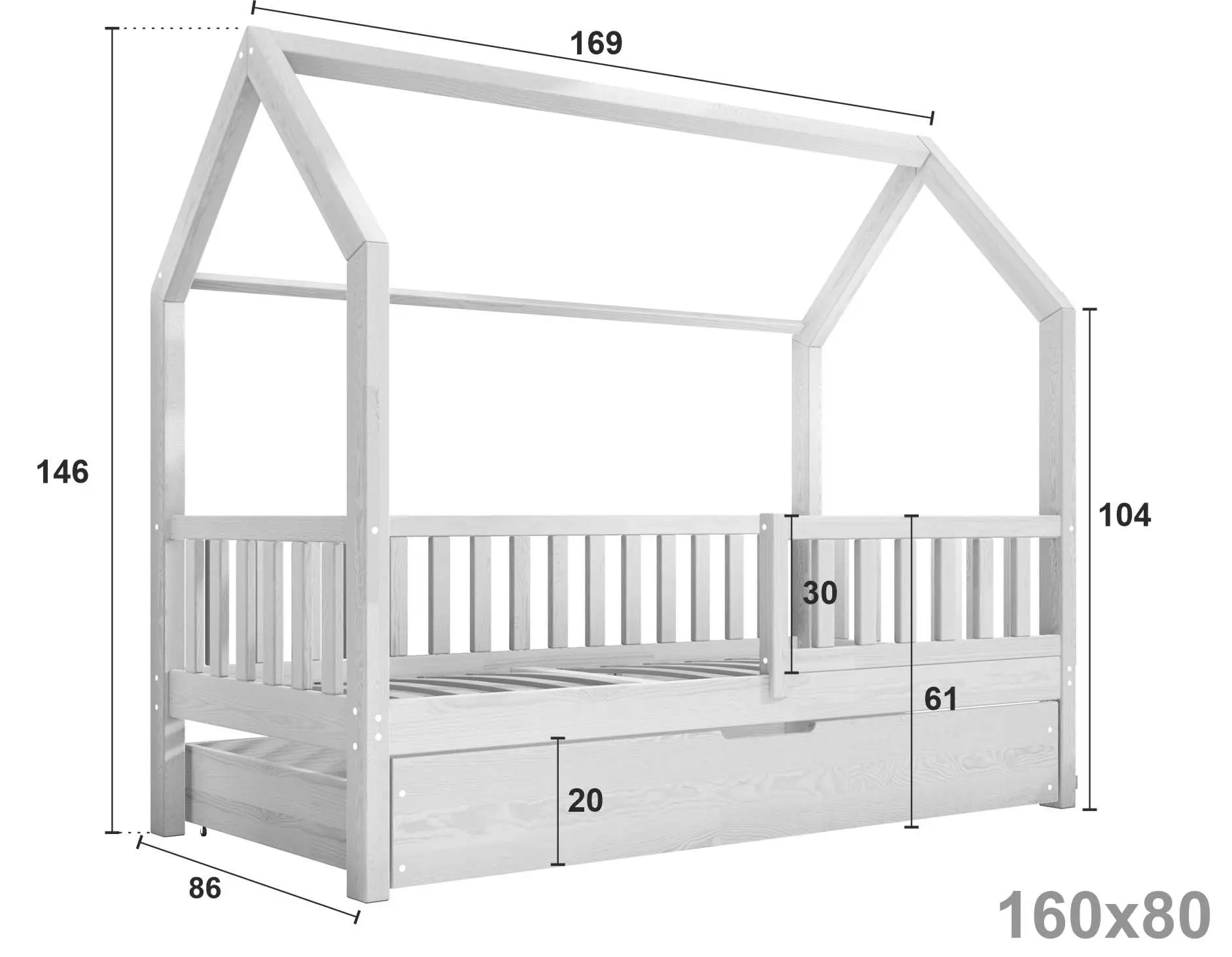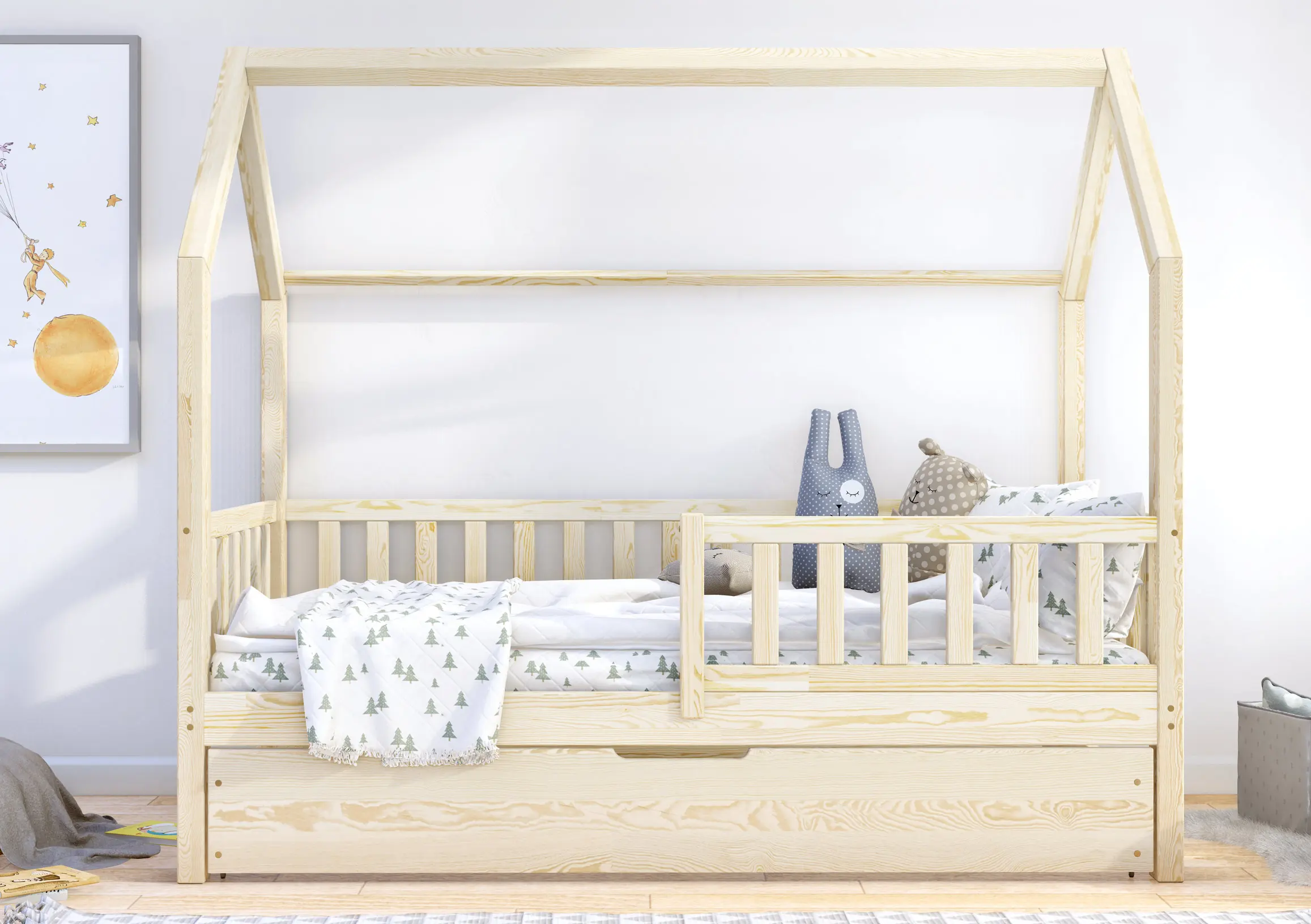 Podstawowa cena obejmuje ramę łóżeczka domek Portia Bis2 z nóżkami 23 cm, szufladą z funkcją spania, barierkami oraz 2 stelażami z listew sprężynujących. W paczkach znajdą Państwo przejrzystą instrukcję oraz niezbędne elementy montażowe. Łóżeczko do samodzielnego montażu.