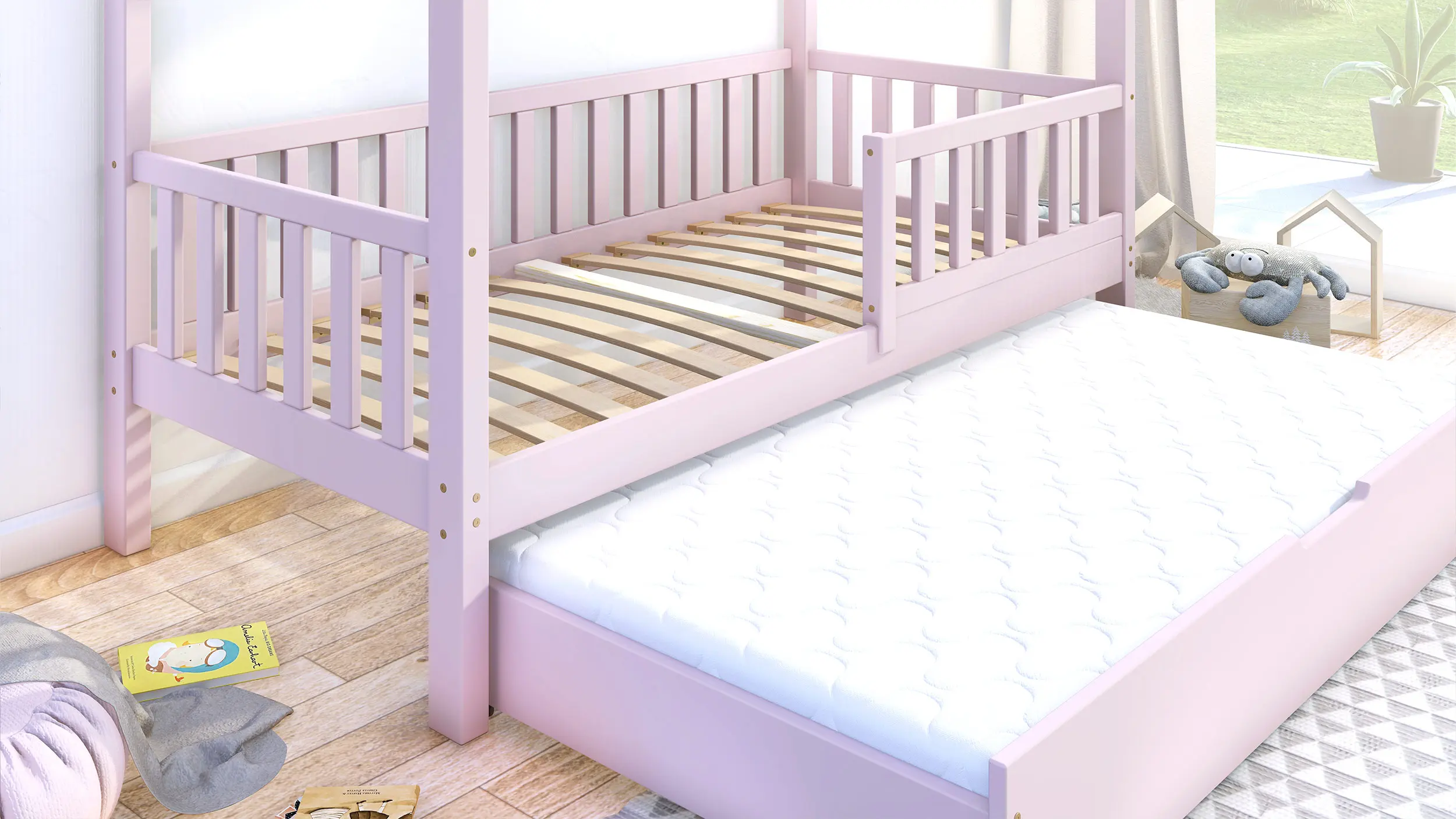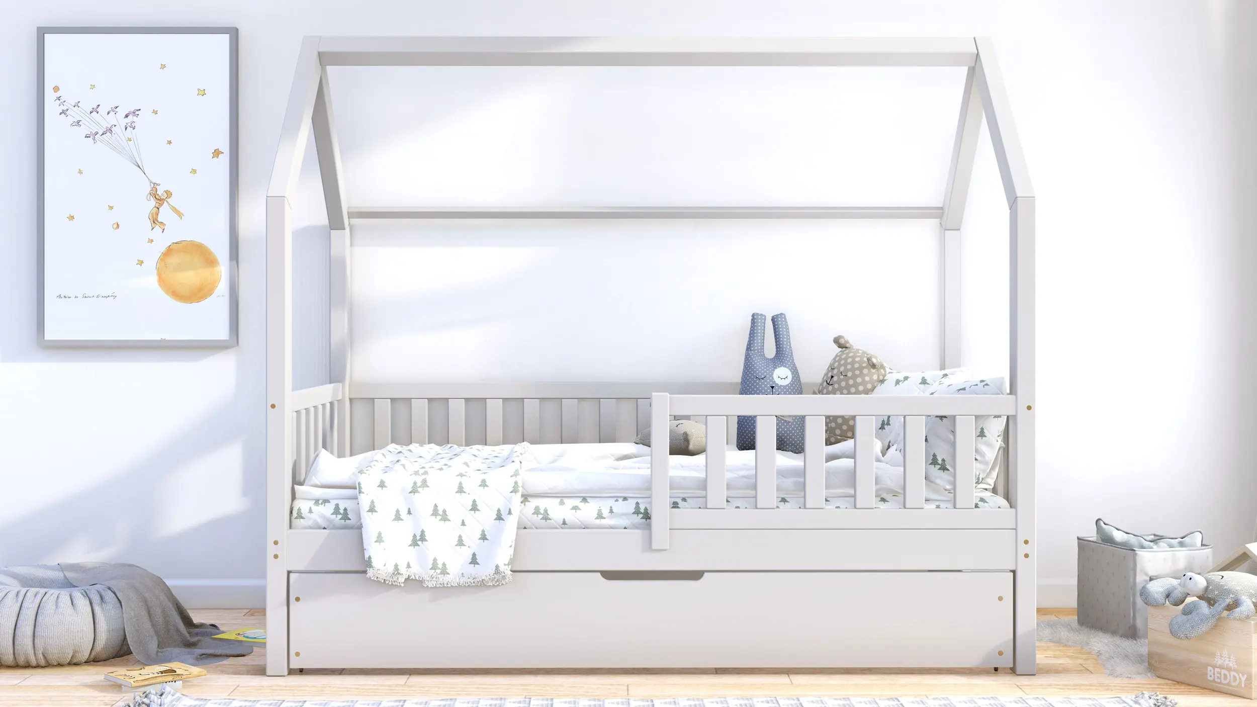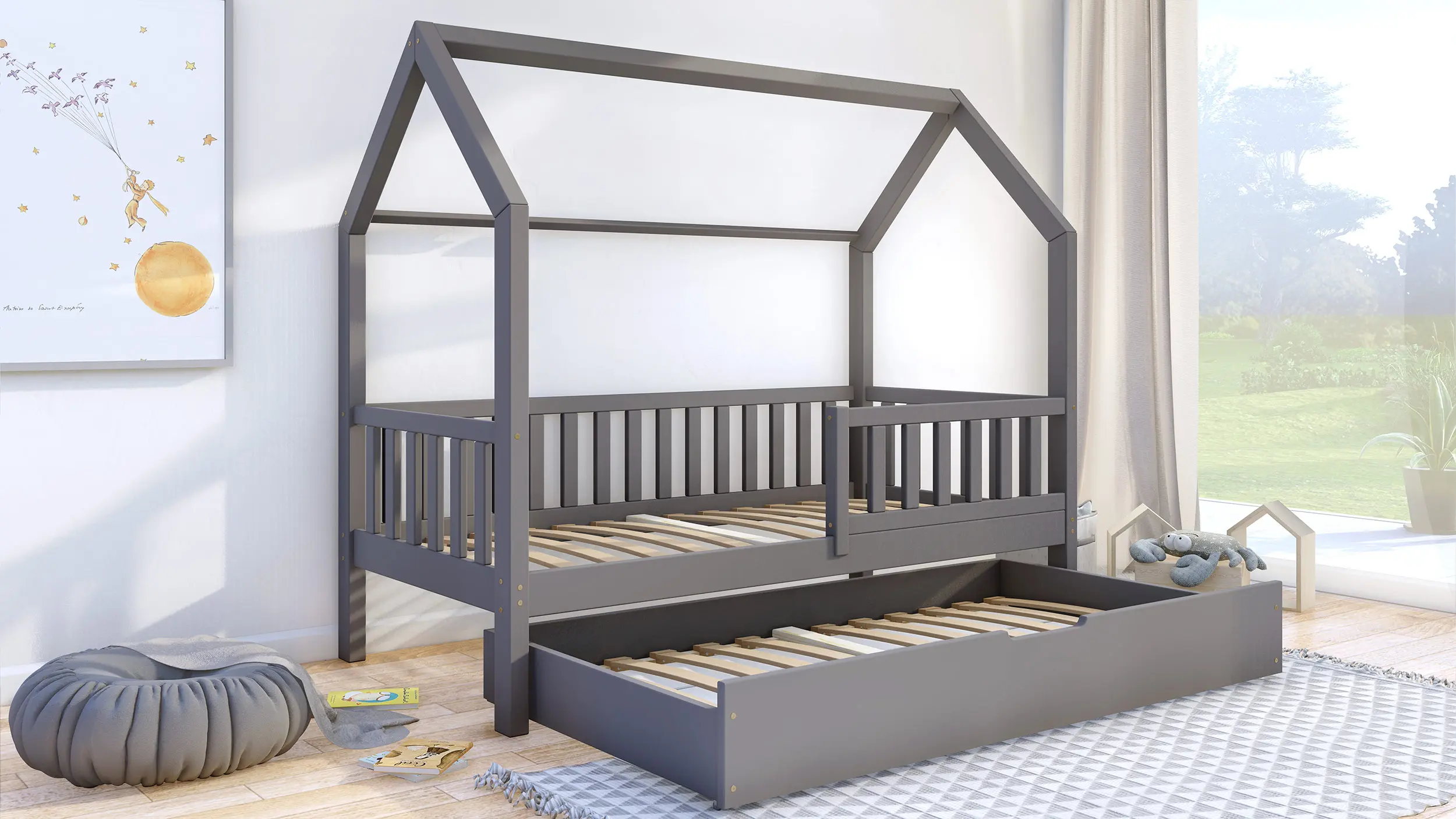Podstawowa cena obejmuje ramę łóżeczka domek Portia Bis2 z nóżkami 23 cm, szufladą z funkcją spania, barierkami oraz 2 stelażami z listew sprężynujących. W paczkach znajdą Państwo przejrzystą instrukcję oraz niezbędne elementy montażowe. Łóżeczko do samodzielnego montażu.