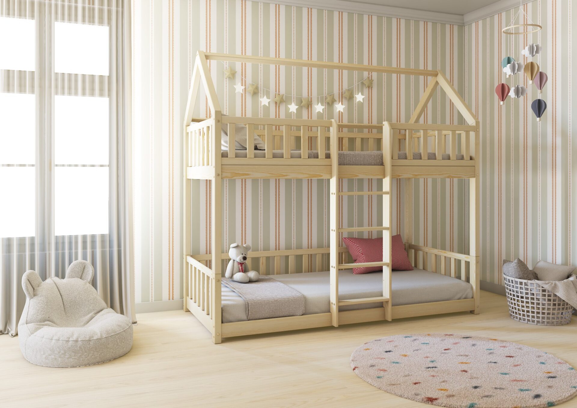 PORTIA PIĘTROWA drewniane łóżko piętrowe domek z barierką płotek wejście po środku