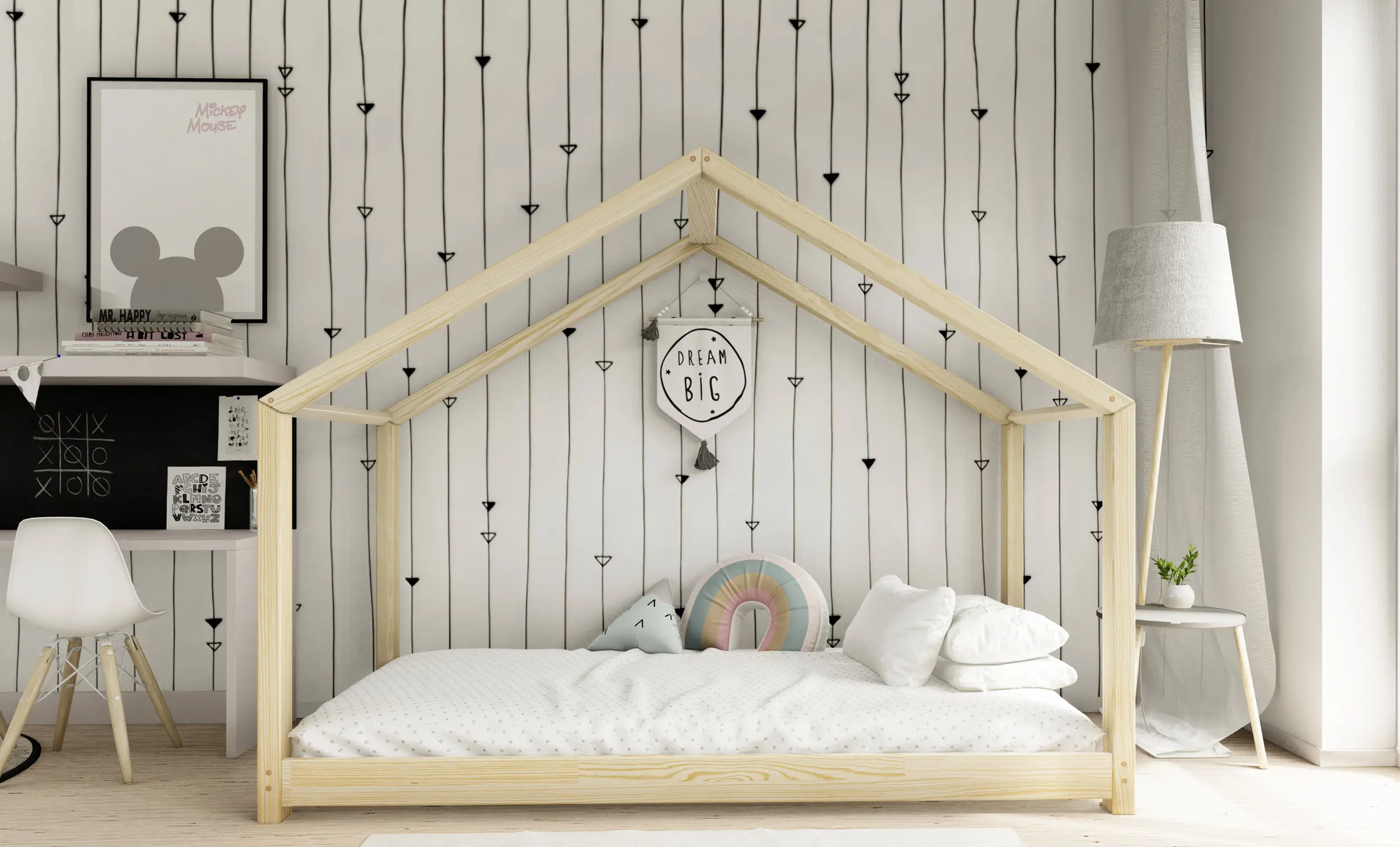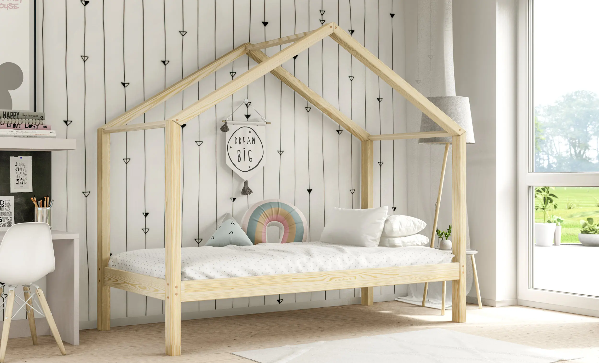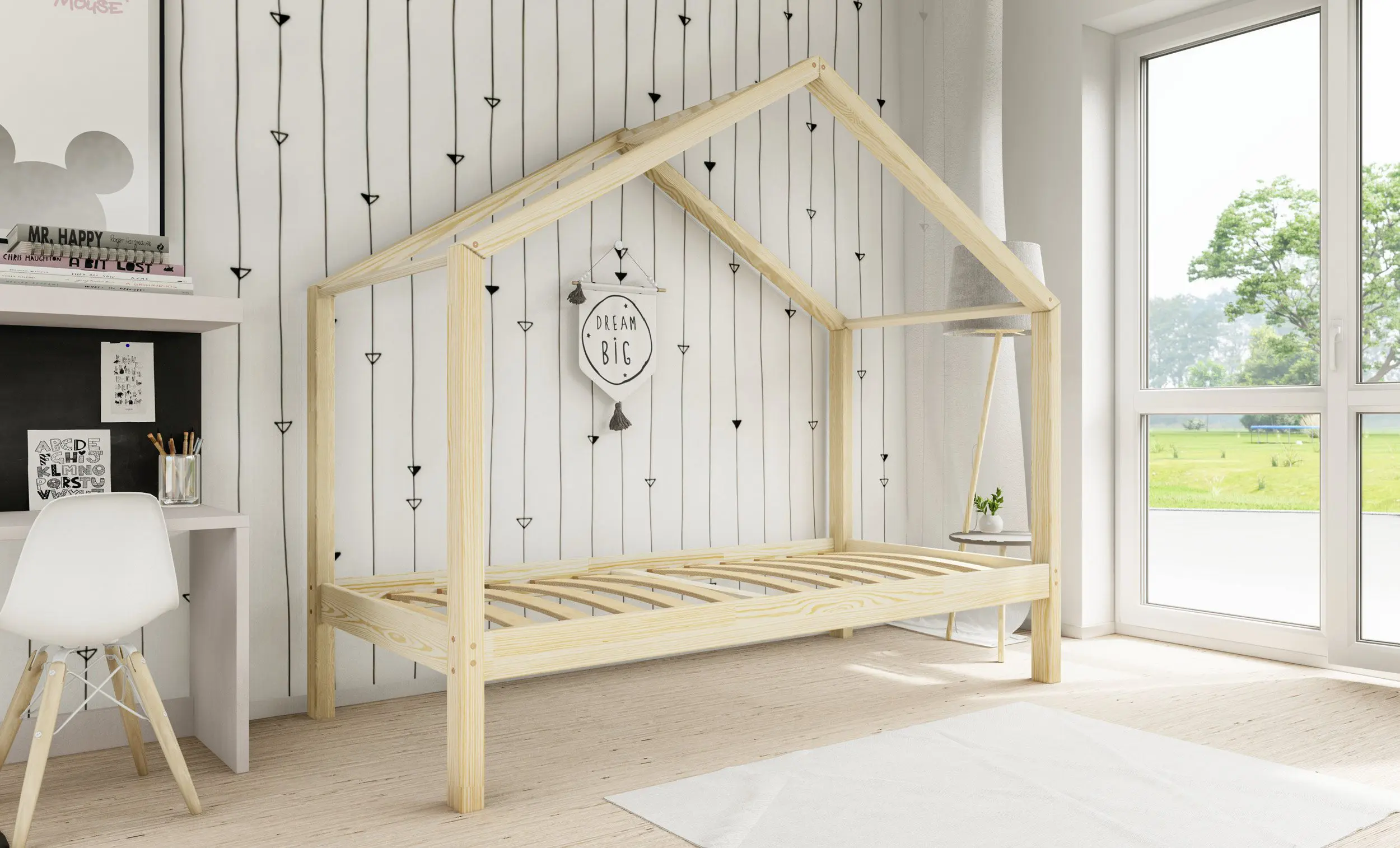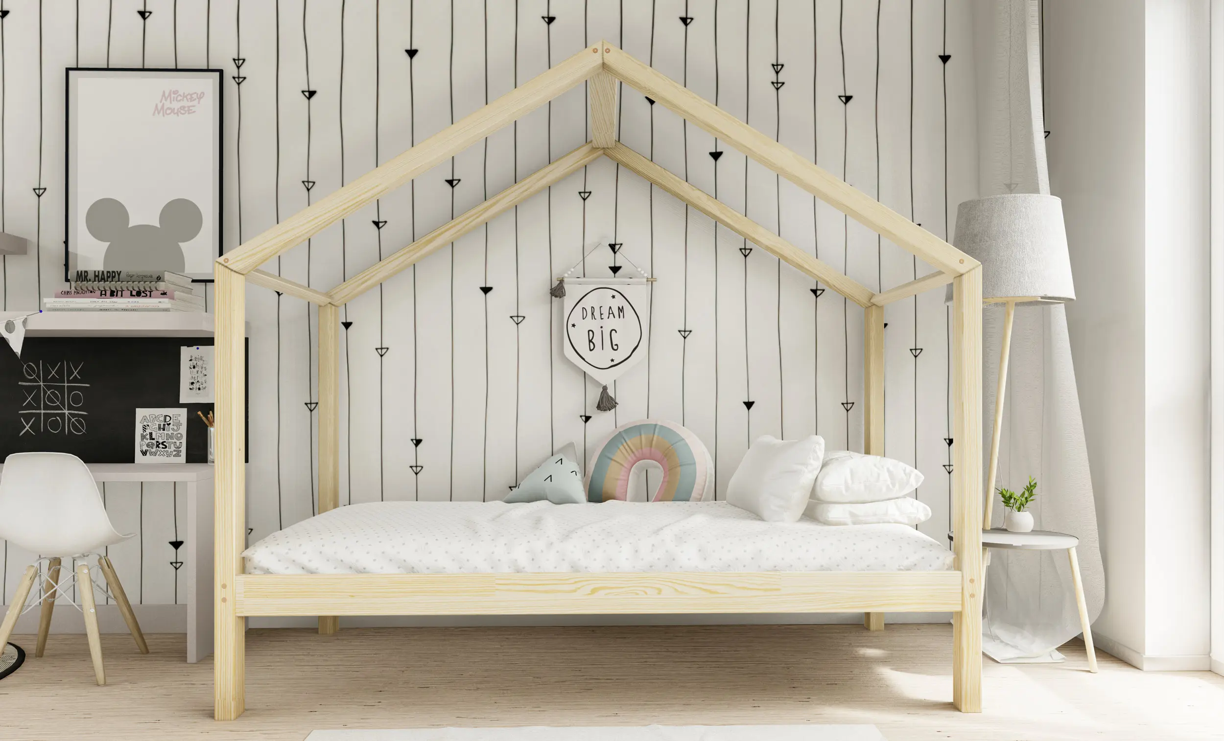 Drewniane łóżko domek RIKI to model otwarty bez barierek. Wyjątkowy design nie tylko urozmaica wygląd mebla, ale jest świetnym rozwiązaniem dla pokoi dziecięcych w domu czy mieszkaniu z poddaszem. Dodatkowo produkt występuje w kilku rozmiarach i kolorach do wyboru. Jego charakterystycznymi cechami są wysoka jakość użytych materiałów oraz dbałość o bezpieczeństwo maluchów, dzięki zaokrąglonym brzegom i gładkim powierzchniom.