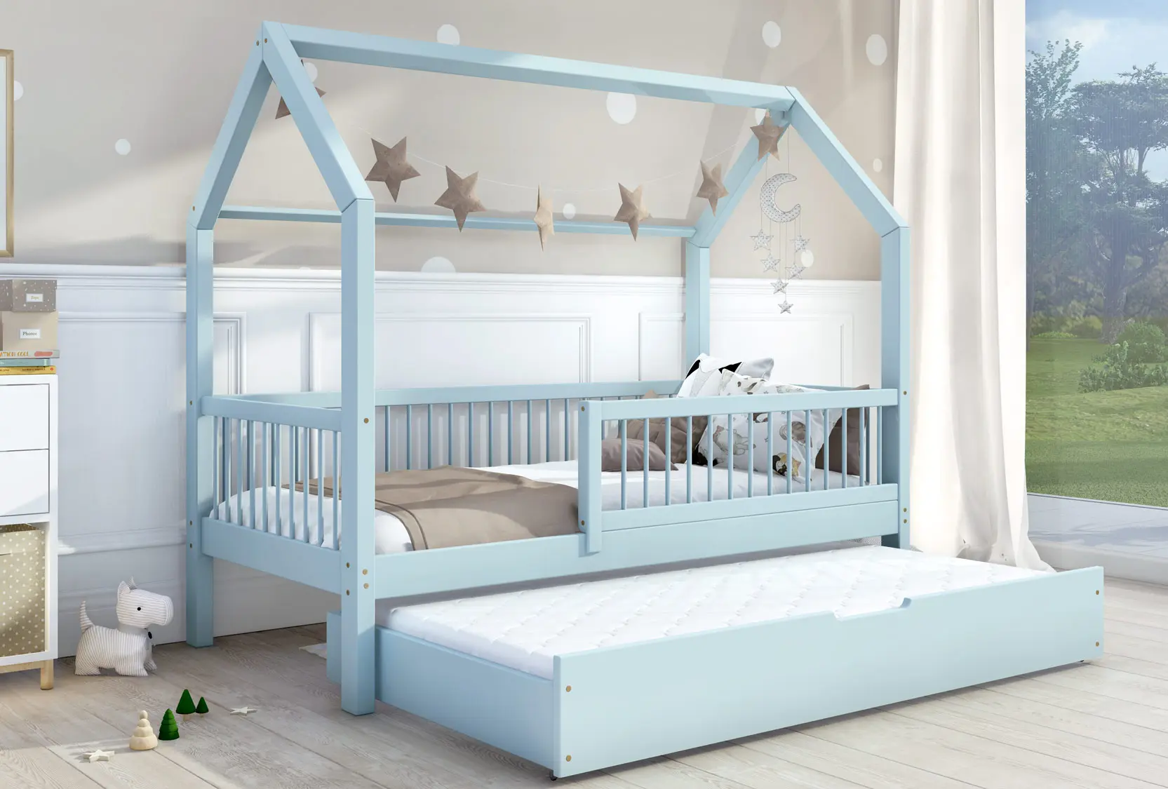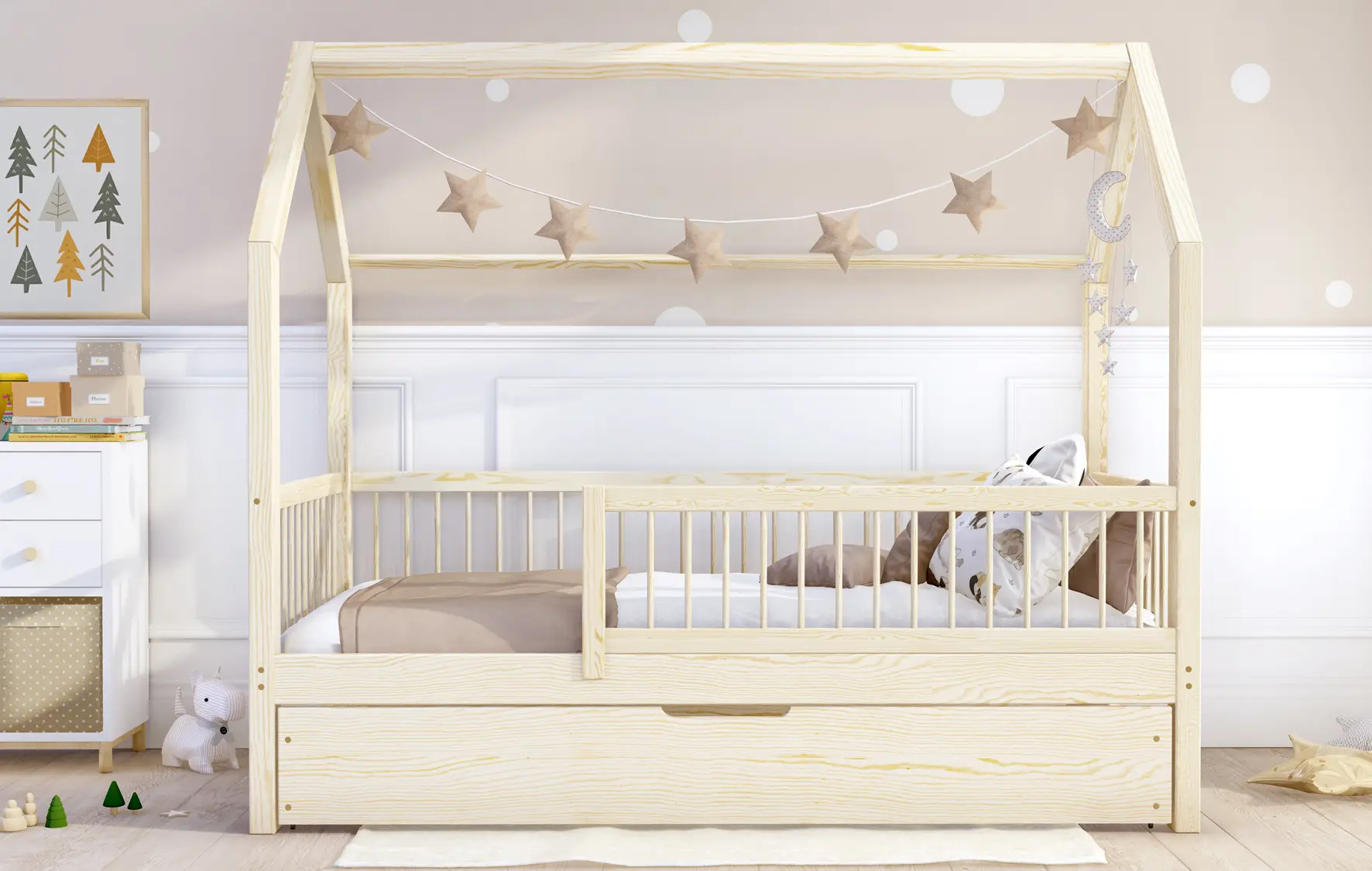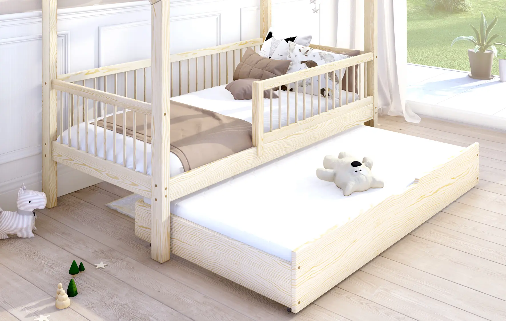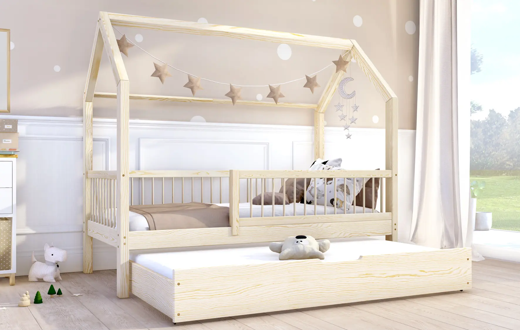 Łóżko dziecięce ZORI BIS2 to model oparty na szkieletowej budowie przypominającej domek z dolną szufladą przeznaczoną na dodatkowe miejsce do snu dla drugiego malucha. Otwarta rama mebla została wykonana z klejonego drewna sosnowego ręcznie szlifowanego, które charakteryzuje się lepszą wytrzymałością niż tradycyjne lite drewno. Dodatkowo zaokrąglone kanty minimalizują ryzyko zadrapań czy otarć podczas snu dziecka.