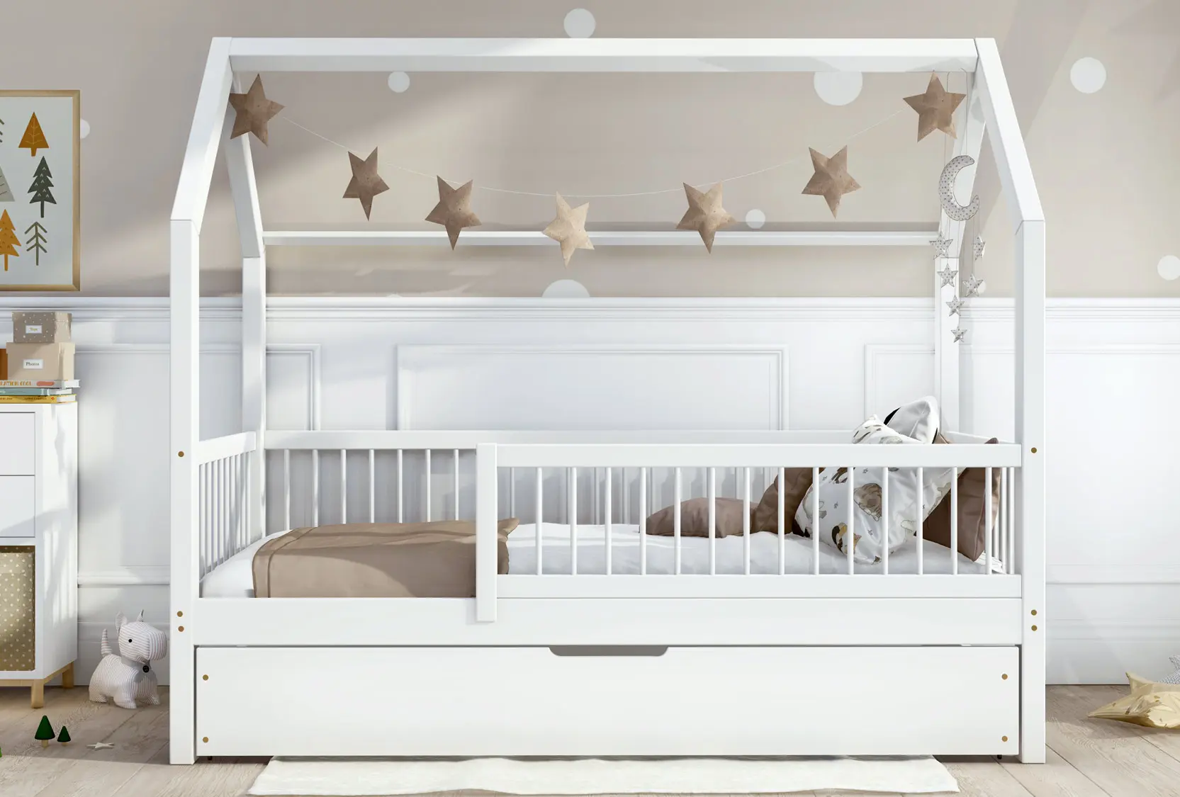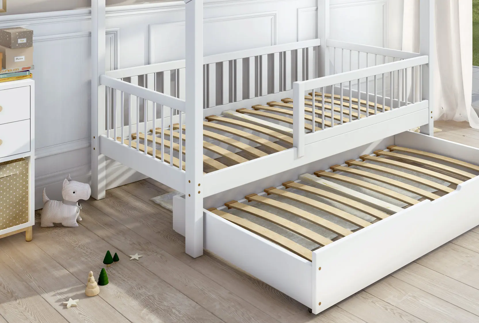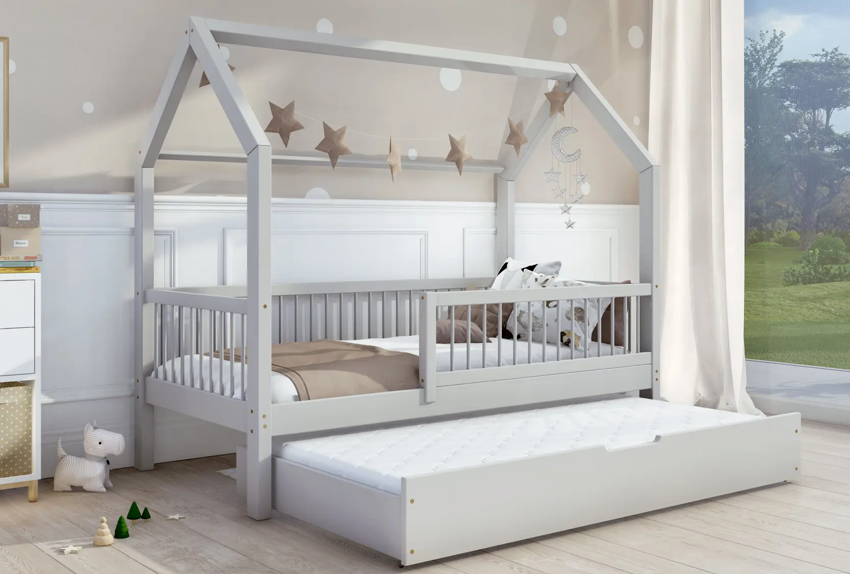 Podstawowa cena obejmuje ramę łóżeczka domek Zori Bis2 z nóżkami 23 cm, barierkami, szufladą z funkcją spania oraz 2 stelażami z listew sprężynujących. W paczkach znajdą Państwo przejrzystą instrukcję oraz niezbędne elementy montażowe. Łóżeczko do samodzielnego montażu.