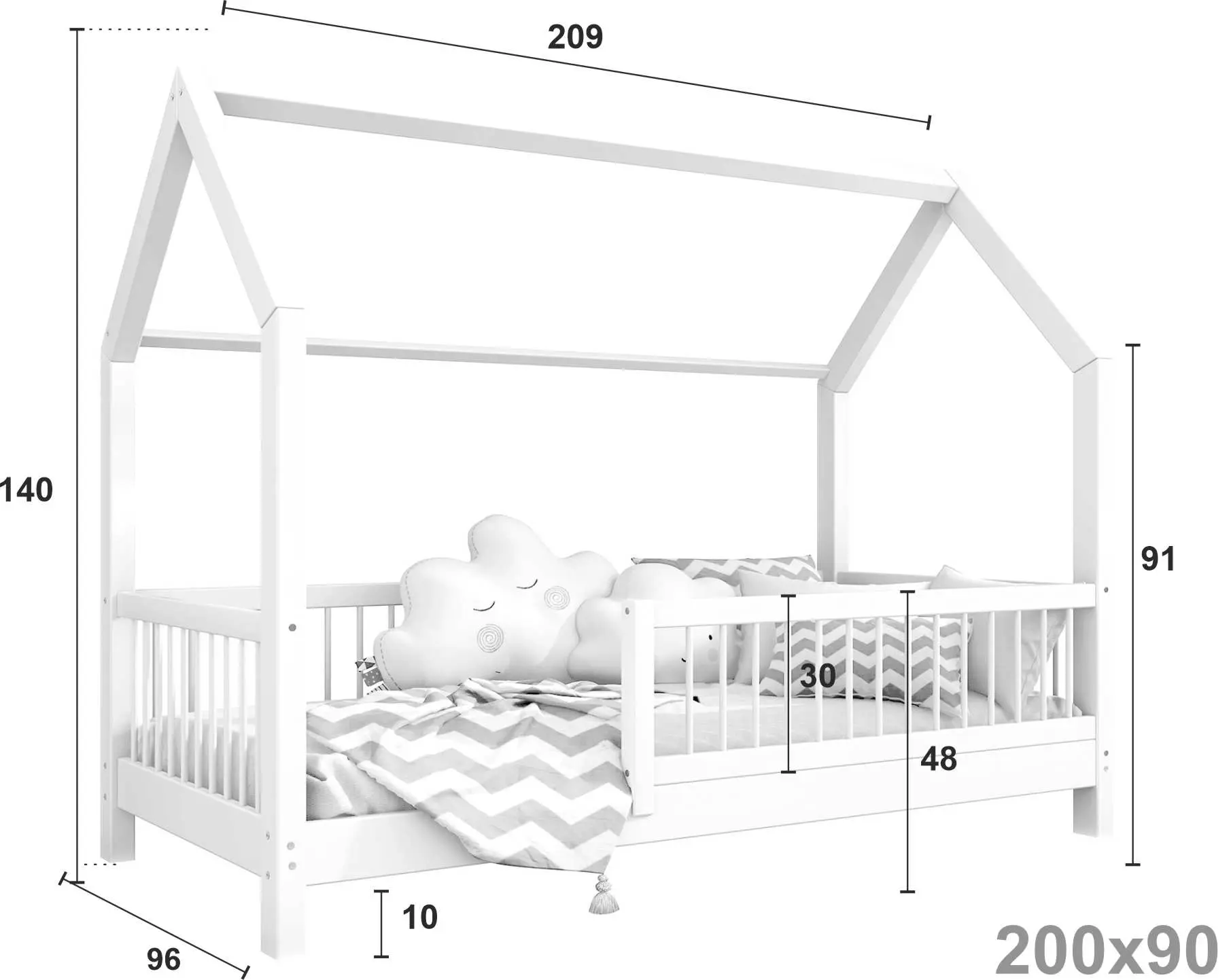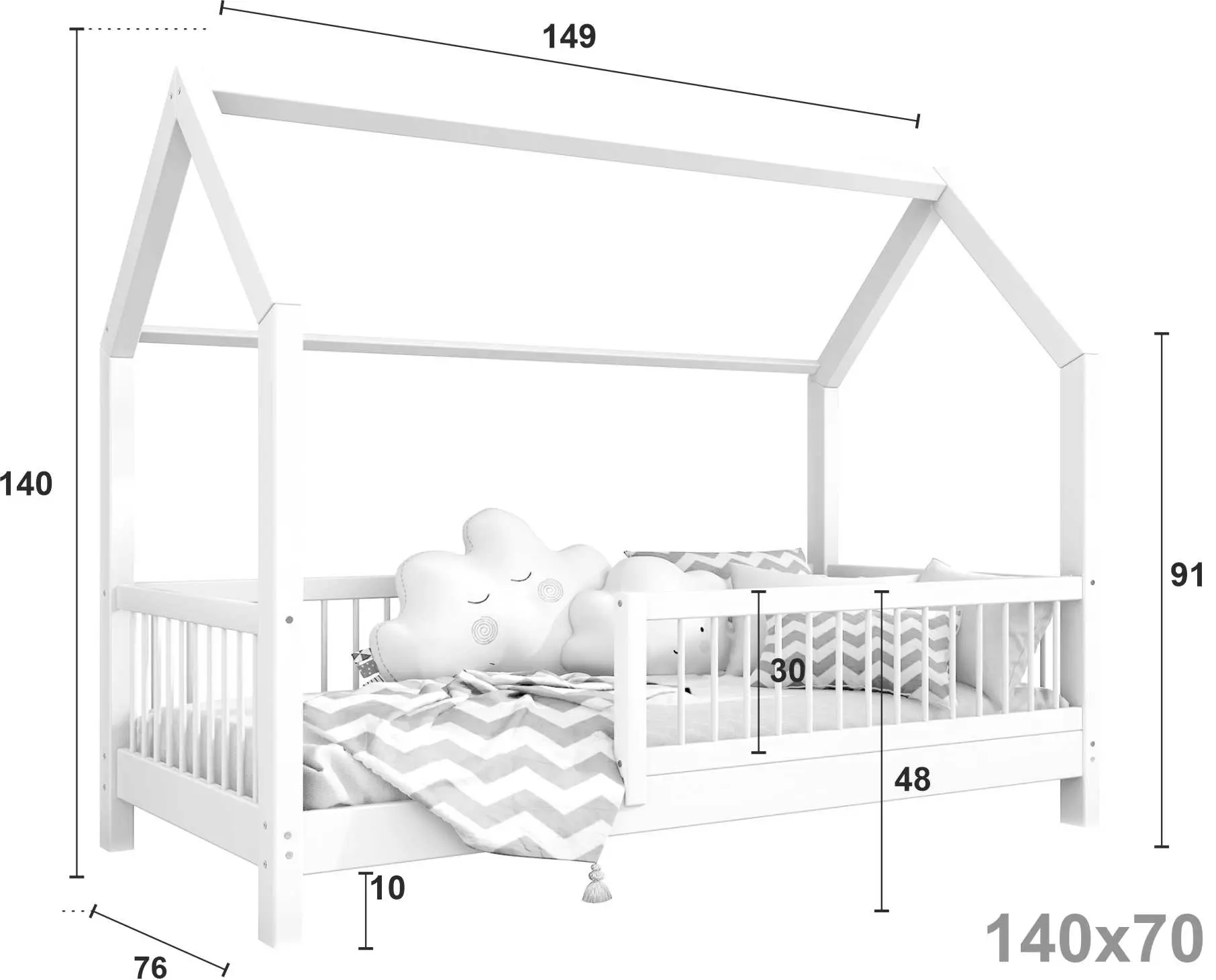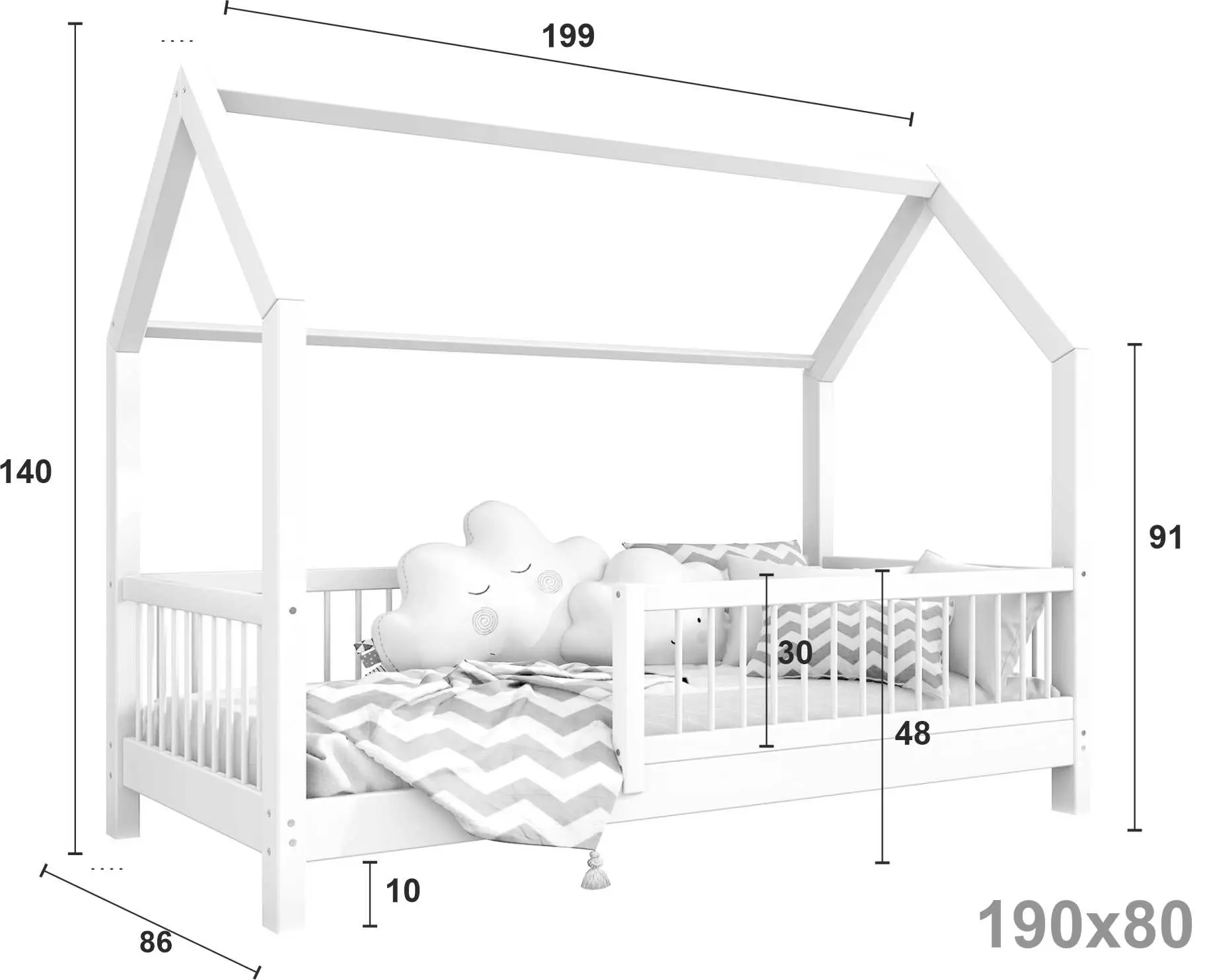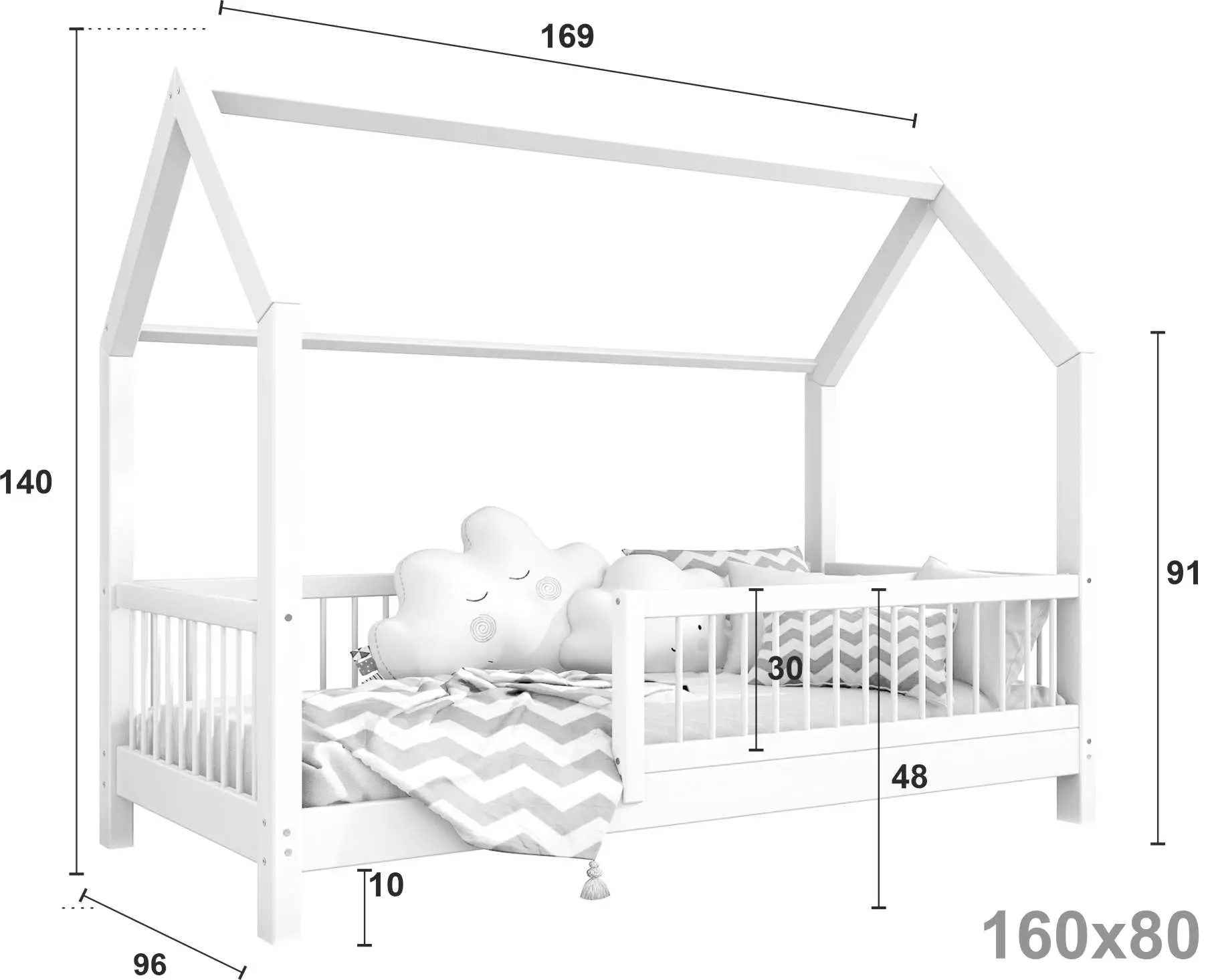 Łóżko dziecięce ZORI to model oparty na szkieletowej budowie przypominającej domek. Otwarta rama mebla została wykonana z najwyższej jakości klejonego drewna sosnowego klasy 1, które dzięki specjalnemu łączeniu poprzecznemu i wzdłużnemu charakteryzuje się wysoką wytrzymałością. Takie rozwiązanie zapewnia większe bezpieczeństwo podczas korzystania z łóżeczka. Dodatkowo zaokrąglone brzegi minimalizują ryzyko zadrapań czy otarć w trakcie snu i zabawy dziecka. Zakupując nasz produkt, otrzymują Państwo już złożone barierki, które można szybko i łatwo dokręcić do ramy łóżka. Nasze łóżeczko posiada oznaczenie CE. Oznacza to, że oferowane przez nas produkty są zgodne z unijnymi normami prawnymi dotyczącymi bezpieczeństwa użytkowania danego produktu na terenie Unii Europejskiej.