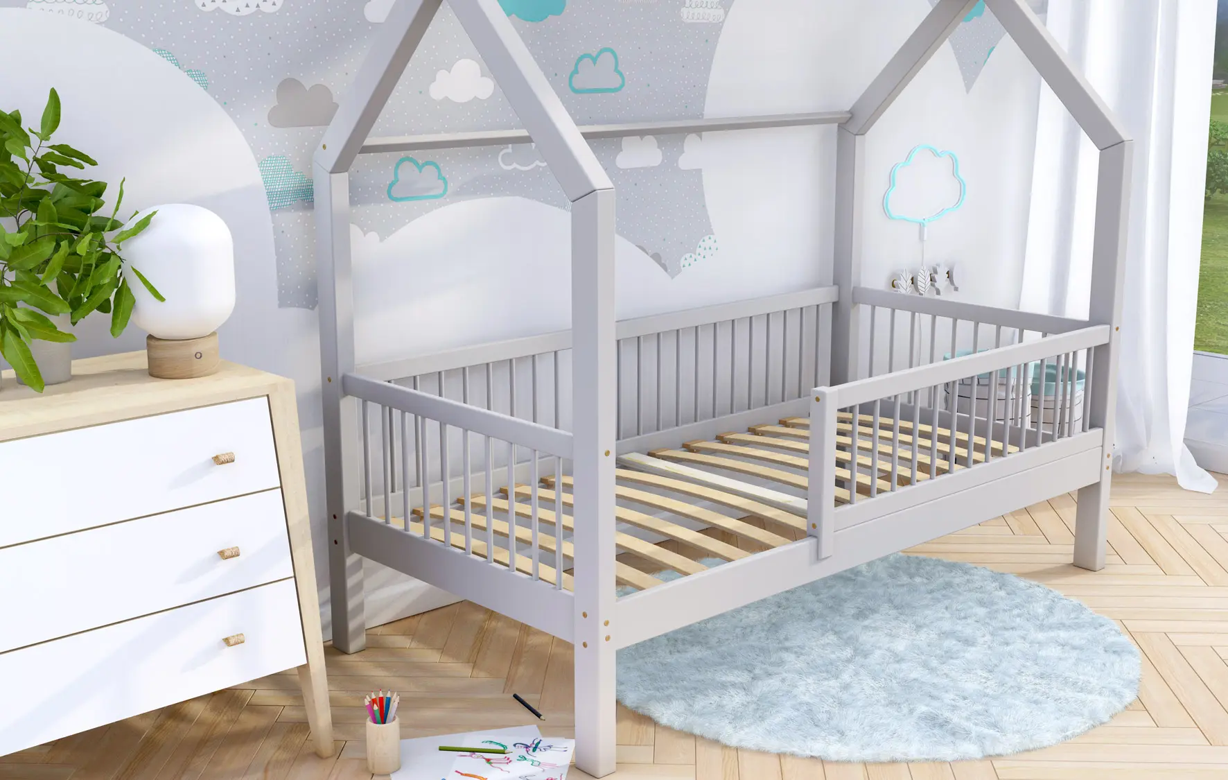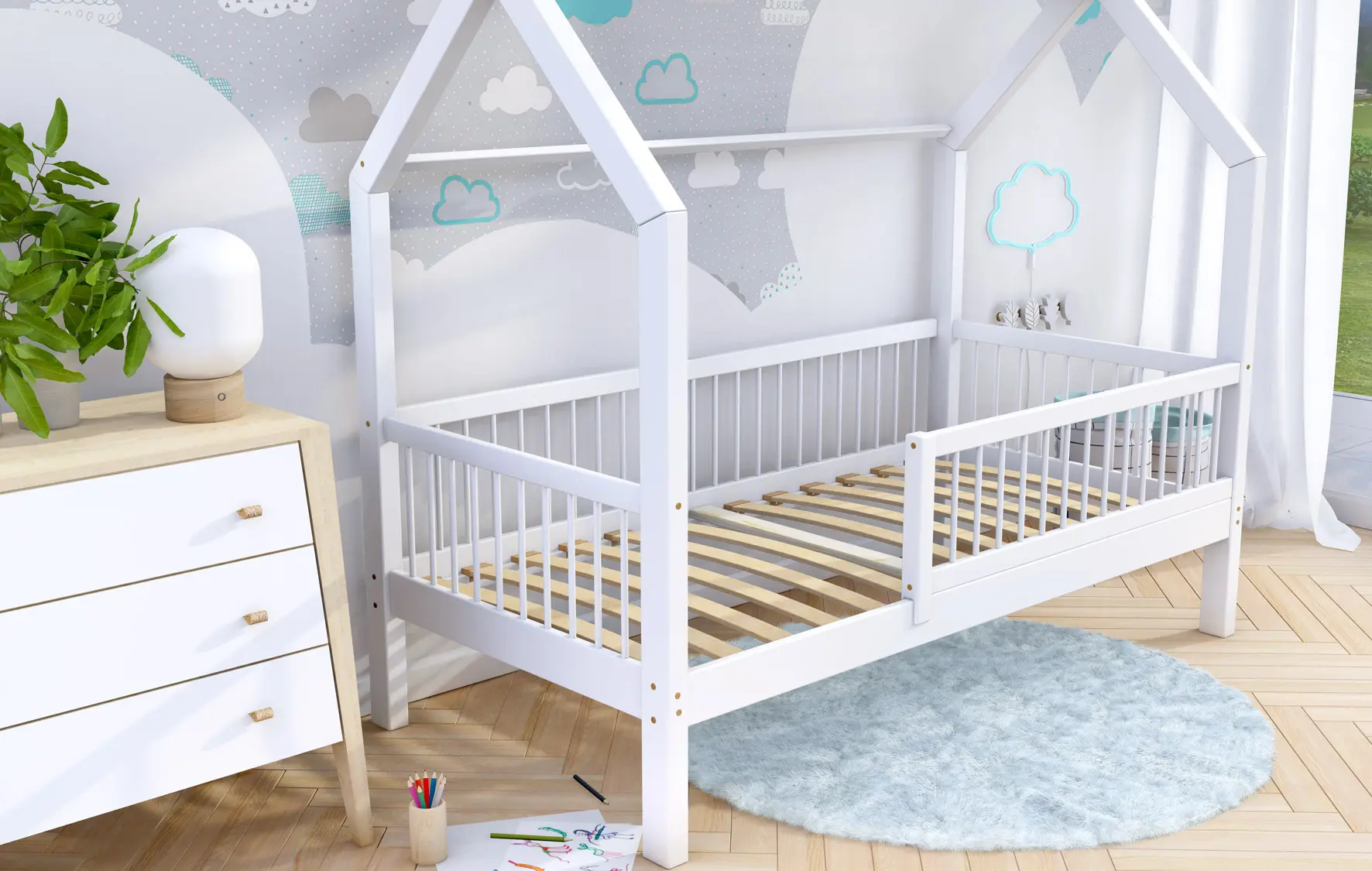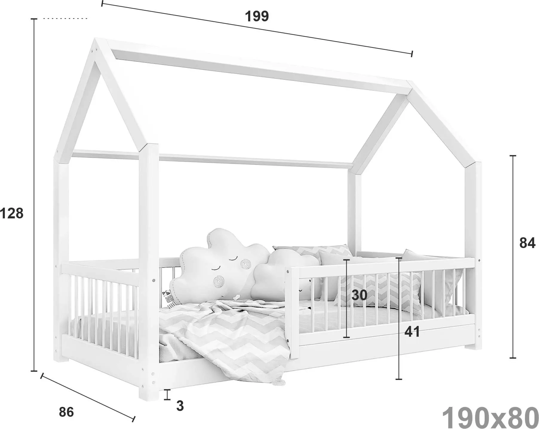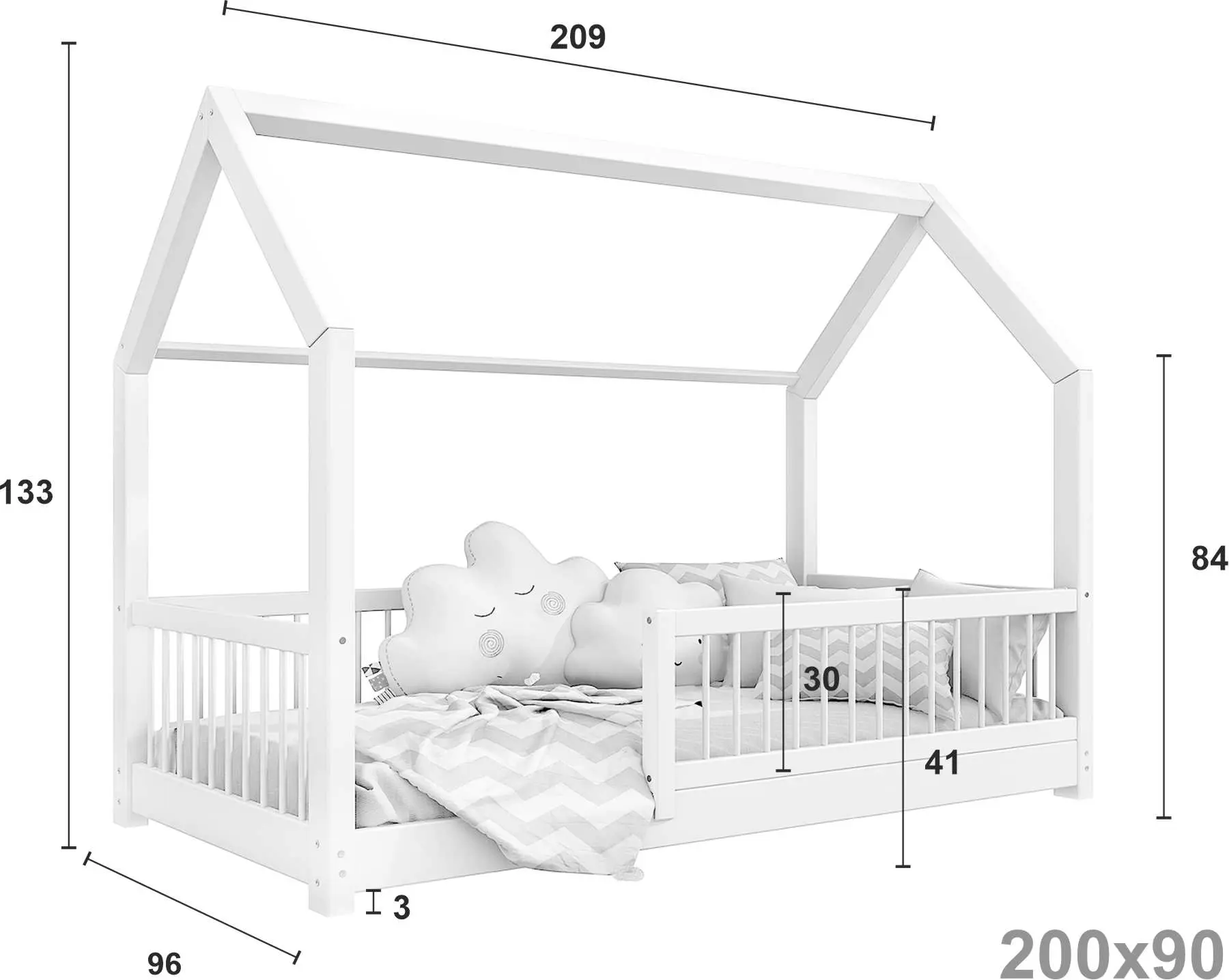 Łóżko dziecięce ZORI to model oparty na szkieletowej budowie przypominającej domek. Otwarta rama mebla została wykonana z najwyższej jakości klejonego drewna sosnowego klasy 1, które dzięki specjalnemu łączeniu poprzecznemu i wzdłużnemu charakteryzuje się wysoką wytrzymałością. Takie rozwiązanie zapewnia większe bezpieczeństwo podczas korzystania z łóżeczka. Dodatkowo zaokrąglone brzegi minimalizują ryzyko zadrapań czy otarć w trakcie snu i zabawy dziecka. Zakupując nasz produkt, otrzymują Państwo już złożone barierki, które można szybko i łatwo dokręcić do ramy łóżka. Nasze łóżeczko posiada oznaczenie CE. Oznacza to, że oferowane przez nas produkty są zgodne z unijnymi normami prawnymi dotyczącymi bezpieczeństwa użytkowania danego produktu na terenie Unii Europejskiej.