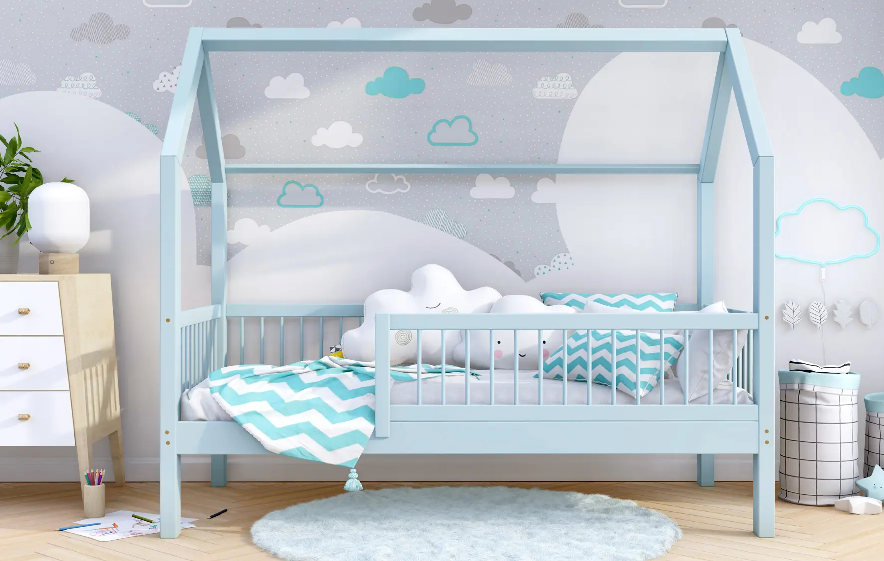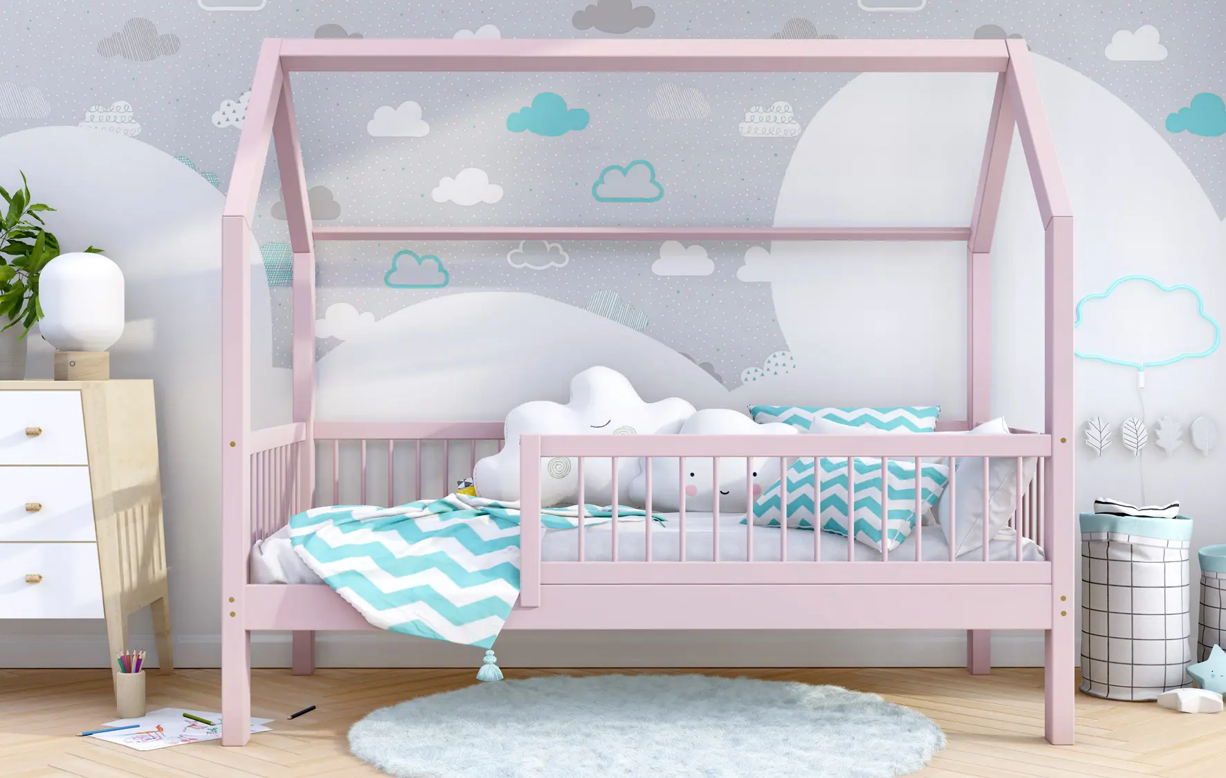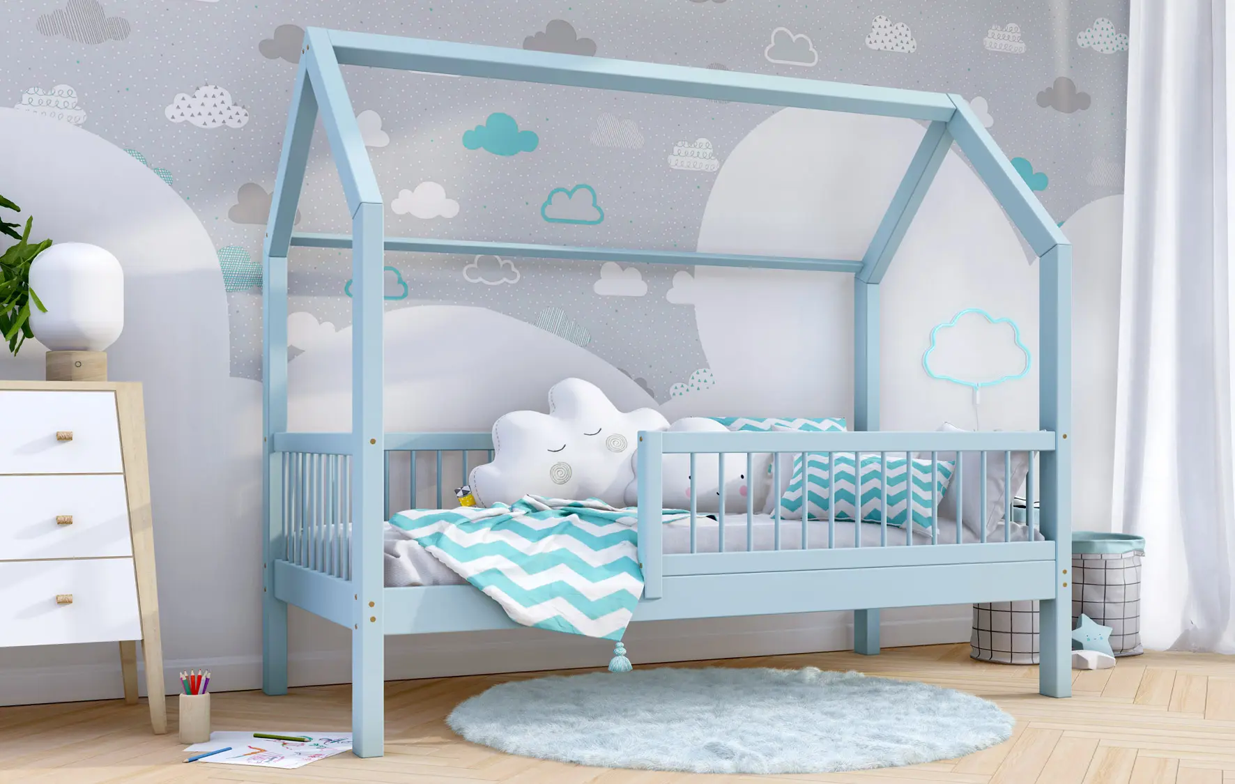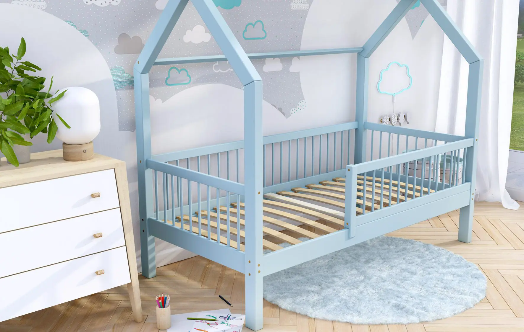 Łóżko dziecięce ZORI to model oparty na szkieletowej budowie przypominającej domek. Otwarta rama mebla została wykonana z najwyższej jakości klejonego drewna sosnowego klasy 1, które dzięki specjalnemu łączeniu poprzecznemu i wzdłużnemu charakteryzuje się wysoką wytrzymałością. Takie rozwiązanie zapewnia większe bezpieczeństwo podczas korzystania z łóżeczka. Dodatkowo zaokrąglone brzegi minimalizują ryzyko zadrapań czy otarć w trakcie snu i zabawy dziecka. Zakupując nasz produkt, otrzymują Państwo już złożone barierki, które można szybko i łatwo dokręcić do ramy łóżka. Nasze łóżeczko posiada oznaczenie CE. Oznacza to, że oferowane przez nas produkty są zgodne z unijnymi normami prawnymi dotyczącymi bezpieczeństwa użytkowania danego produktu na terenie Unii Europejskiej.