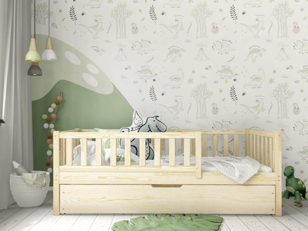 LEA BIS drewniane łóżko parterowe z szufladą na pościel i barierkami płotek